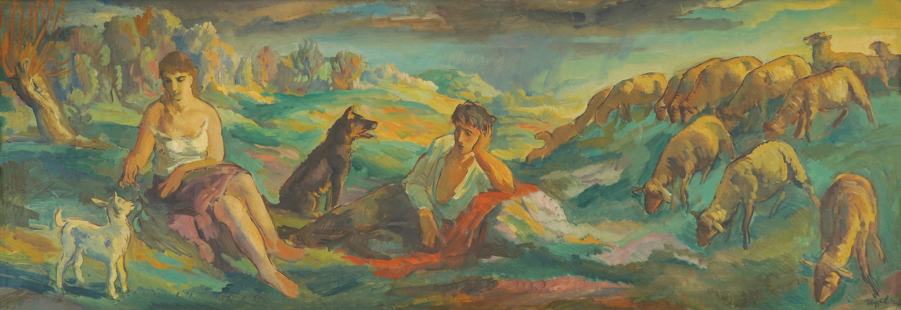 U periodu oko 1930., Milivoj Uzelac (1897. – 1977.), posvećuje manji dio svog opusa lovačkim i pastoralnim temama, uobličivši ih u formatu pejsaža. Zbog njihove dekorativne prirode, možemo pretpostaviti da su bili rađeni prema narudžbi, za potrebe dekoriranja prostora, kao što je bio slučaj sa ''Skicom za dekoraciju u lovačkoj kući'' (1929.). Korijene ovih pastoralnih i srodnih lovačkih motiva u Uzelčevom slikarstvu pronalazimo već 1926. godine, kada Uzelac stvara ''Akt s mrtvom prirodom (Chasseresse)'', gdje nago tijelo ženskog modela pozicionira unutar pejsaža i okružuje lovačkim motivima: lovačkim psom, puškom, lovačkom torbicom i nanizanim ulovljenim pticama. Kasnije stvara složenije kompozicije, napučene ljudskim i životinjskim figurama u elongiranim formatima pejsaža, kao što su ''Skica za dekoraciju u lovačkoj kući'' (1929.), ''Strijelac na fazane'' (1929.), ''Dijana u lovu na fazane'' (1929.) i veliki gvaš ''Najade'' (1930.). Tako je brdoviti krajolik ''Pastorale'' nastanilo stado ovaca, a u prednjem planu, u fokusu promatrača, svoje pozicije su zauzeli mlada djevojka i mladić. U izduljenom formatu slikarskog platna, Uzelac stvara kompoziciju u kojoj glavni ritam diktiraju valovite linije brežuljkastog krajolika koje se, gotovo kao prema nekom matematičkom principu fraktala, reflektiraju i na konveksnim obrisima stabala, leđima ovaca, pa čak i obrisima ljudskih likova. Ova bogato ritmizirana kompozicija vrvi Uzelčevskim koloritom - tonovima zelene, ljubičaste i žute koje je slikar hrabro postavio unutar snažno izvedenih linearnih obrisa. U licu mladića, možebitnog pastira, prepoznajemo crte lica samog Milivoja Uzelca – tamna kosa i oči, istaknute obrve i karakterističan dug nos na izduženom licu, evociraju markantne crte lica tad još mladog slikara. Ne možemo tvrditi da se radi o autoportretu, već je Uzelac vjerojatno podlegao praksi umjetnika koja je znana od pamtivijeka – da naslikana imaginarna lica uobličava prema dobro poznatim fizionomijama, najčešće prema vlastitom liku ili prema liku bliskih osoba. Djevojka je pak, tipična ruralna ljepotica, stasita, prirodna i nepatvorena, uhvaćena u trenutku dražesne igre s ovčicom. Za razliku od ambicioznih i dinamičnih kompozicija s lovačkim motivima, ''Pastorala'' zrači spokojem, uhvativši trenutak sklada, mira i povezanosti ljudi s prirodom koja ih okružuje. MM