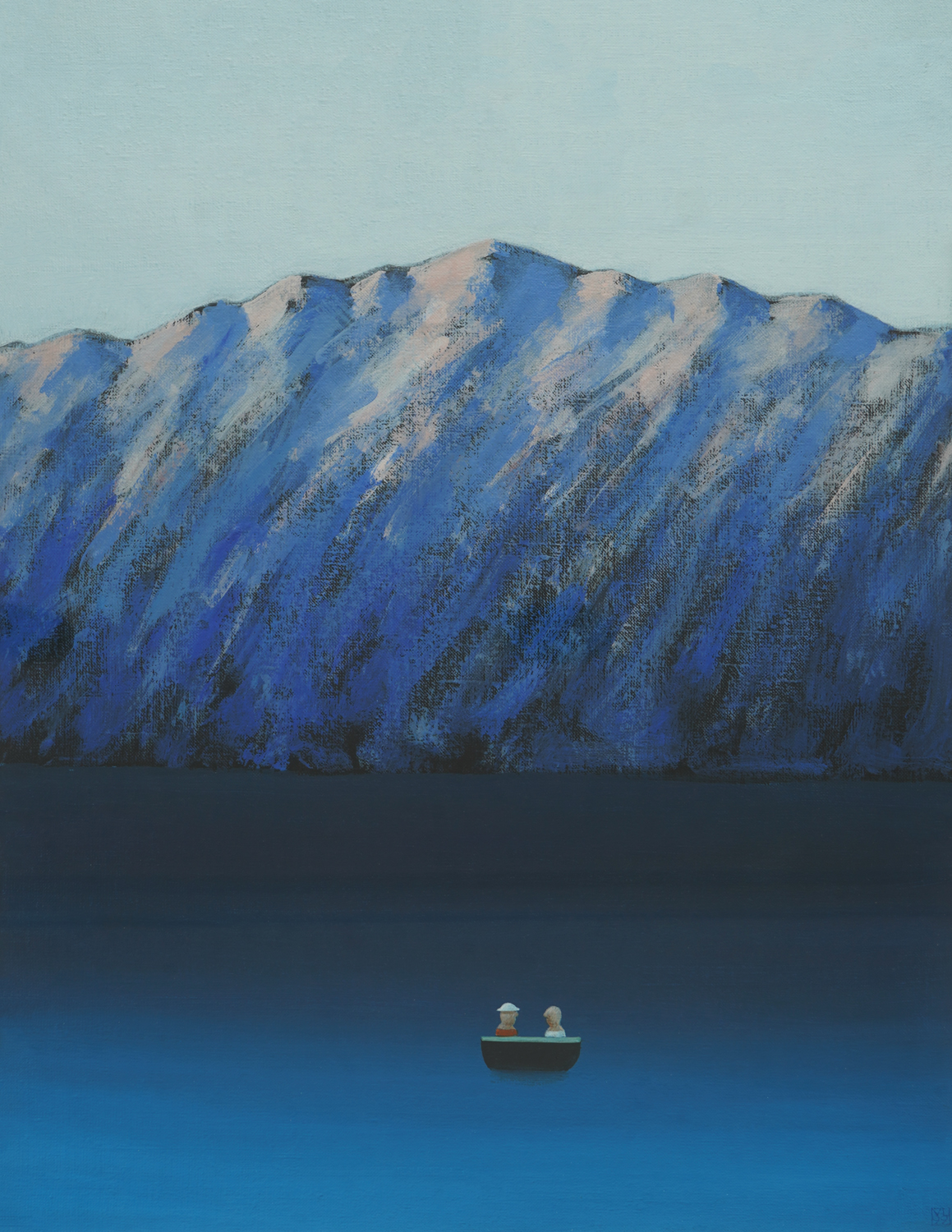 Vasko Lipovac (Škaljari kraj Kotora, 1931. – Split 2006.) znao je idilične i dopadljive morske prizore uklopiti u kompozicijski sjajno odmjerena i likovno vrlo zanimljiva ostvarenja. To je slučaj i s ovom slikom, na kojoj vidimo brodić s dvije figure nasred mirnog mora. Nad njima se uzdiže planina, koja stvara sjenu i tonski artikulira plohu koja predstavlja more. Slika nas, po svojoj vertikali, vodi kroz harmonijsko toniranje plave boje (od svjetlije prema tamnoj, pa opet u svijetlu), prekinuto dominantnom formom planine. Na njoj, pak, crni podslik i bijeli, rahli, potezi, dinamiziraju osnovni plavi ton slike, a svojim ga kontrastom i naglašavaju. Plavi odsjaji na planini spajaju svijetlo plavetnilo neba s tamnomodrom bojom mora. Kontrast je postignut i u različitoj morfologiji dijelova slike – more je prikazano kao modra ploha (s već naglašenim tonskom artikulacijom), dok su na planini potezi plave i bijele uočljiviji. Simplifikacija kompozicije i oblikovanja karakteristični su za slikarstvo Vaska Lipovca. Njima je, na svojim slikama, postizao efektne sugestije dubokog mira, bonace i tišine. FG