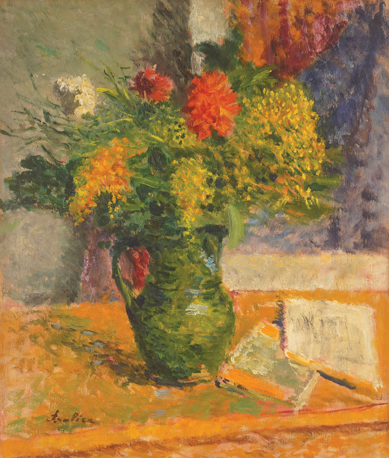 Stojan Aralica (Škare kraj Otočca, 1883. – Beograd, 1980.) bio je slikar i grafičar. Nakon dobivene diplome na učiteljskoj školi u Osijeku, kao samouk slikar, izrađuje portrete i ikone po narudžbi kako bi financirao studij slikarstva. Njegovi najraniji radovi su vjerojatno izgubljeni. Već 1909. godine pohađa privatne sate u Münchenu te iduće godine u istom gradu upisuje Visoku školu za likovnu umjetnost. U počecima je pretežno slikao portrete i aktove pod utjecajem münchenske Akademije i secesije. U to je doba prijateljevao s Kraljevićem, Becićem, Račićem… Zrelost u slikarskom iskazu dolazi nakon studija i života u Francuskoj, pogotovo pod utjecajem Andréa Lhotea, impresionizma, fauvizma. Na platnu sve češće donosi pejzaže i vedute. Uskoro odlazi u Zagreb gdje otvara privatnu slikarsku školu. Slika jadranske motive neposrednim kolorističkim izrazom. Izbijanjem Drugog svjetskog rata seli u Beograd gdje manje slika, i to samo portrete, skice i studije, a nakon rata nekoliko godina provodi u Švedskoj gdje je slikao laponske pejzaže zeleno-modre sjevernjačke svjetlosti. Nemiran na jednom mjestu, lutalica u duši, mnoge je adrese smatrao domom. Boravio je tako u Pragu, Rimu, Firenci, Parizu Španjolskoj, Maroku, Tunisu… A izlagao je u Zagrebu, Beogradu, Parizu, Pragu, Sarajevu, čak i u Švedskoj. Dio svojih djela ostavio je gradu Otočcu. Ulje na platnu donosi klasični motiv mrtve prirode – vrč s cvijećem u interijeru. Središnji je motiv zeleni keramički vrč s buketom raznobojnog cvijeća (žuto, crveno, bijelo) koji je postavljen na stol uz otvorenu knjigu i osobnim predmetima unoseći dozu intime u prizor. Dominiraju topli tonovi tipični za Aralicu koji je poznat po životnom i stvaralačkom optimizmu. Pozadina je hladnije nijanse plave i sive što dodatno ističe živost cvijeća. Potezi kistom su energični, pastozni. Slika je signirana u donjem lijevom kutu. MČ