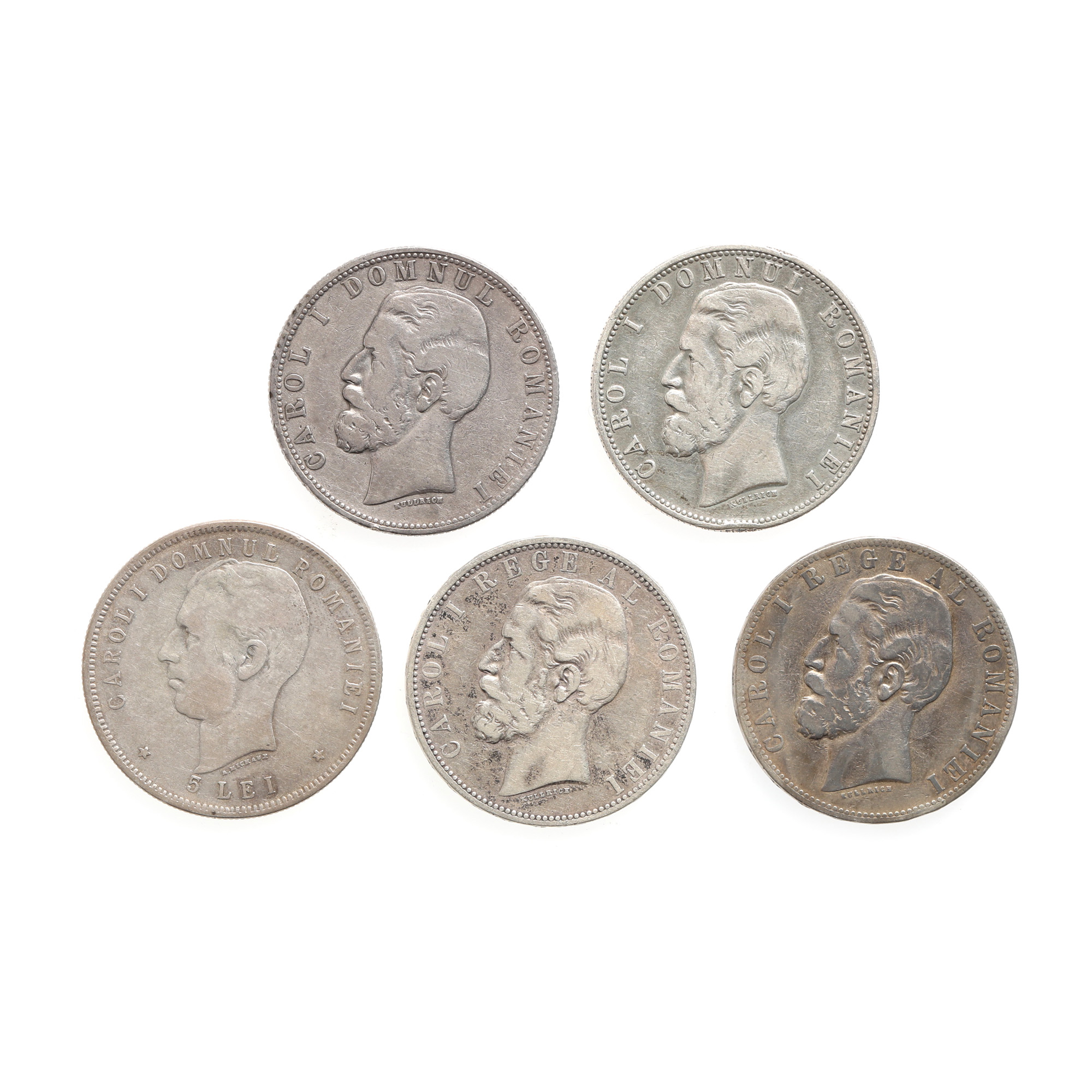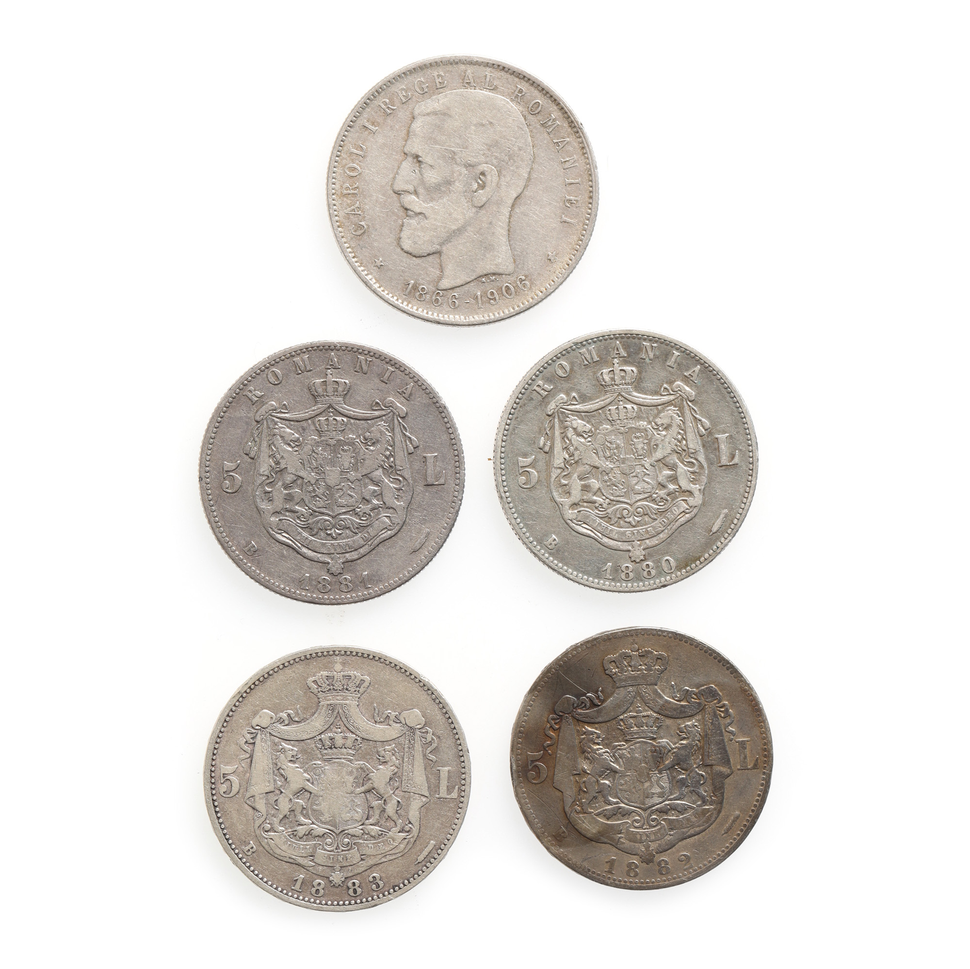 151. Lot format din cinci monede de 5 Lei, ani consecutivi 1880-1883 și 1906, monetăriile din București și Bruxelles, argint