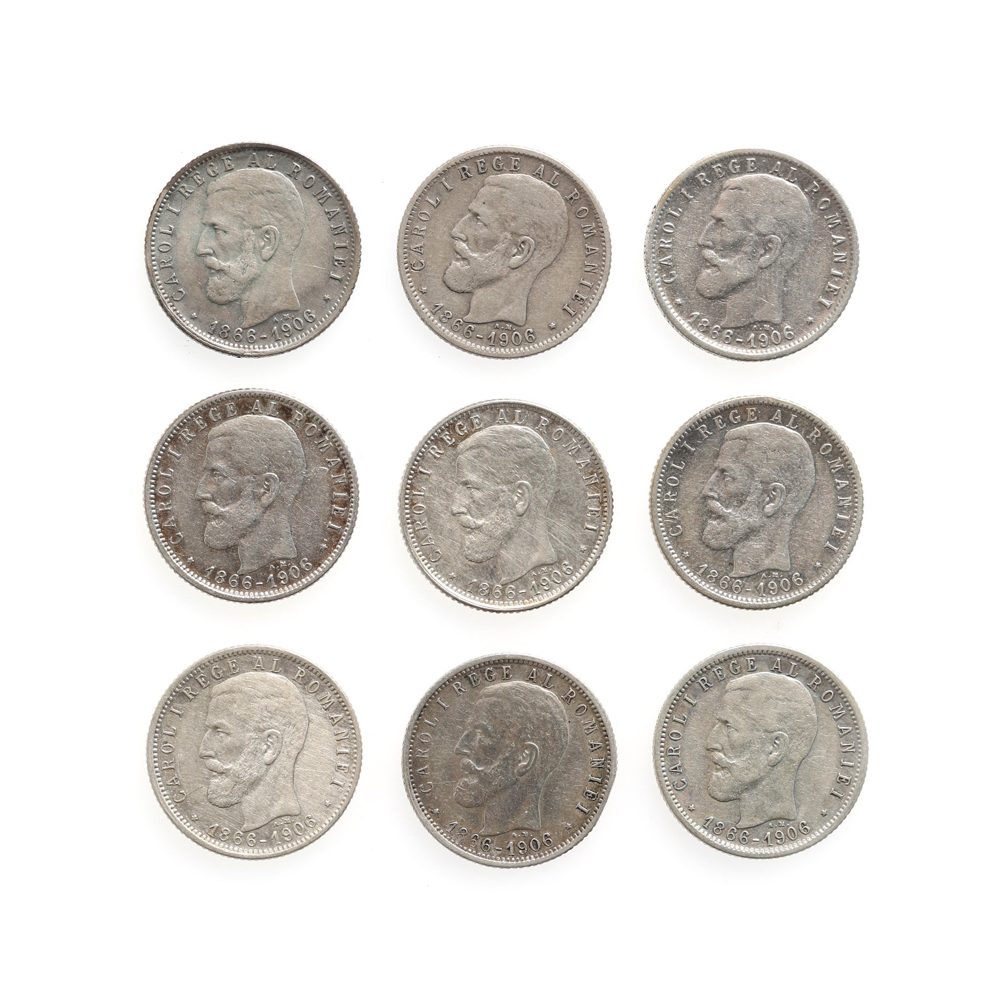 176. Lot format din nouă monede de 1 Leu 1906, argint