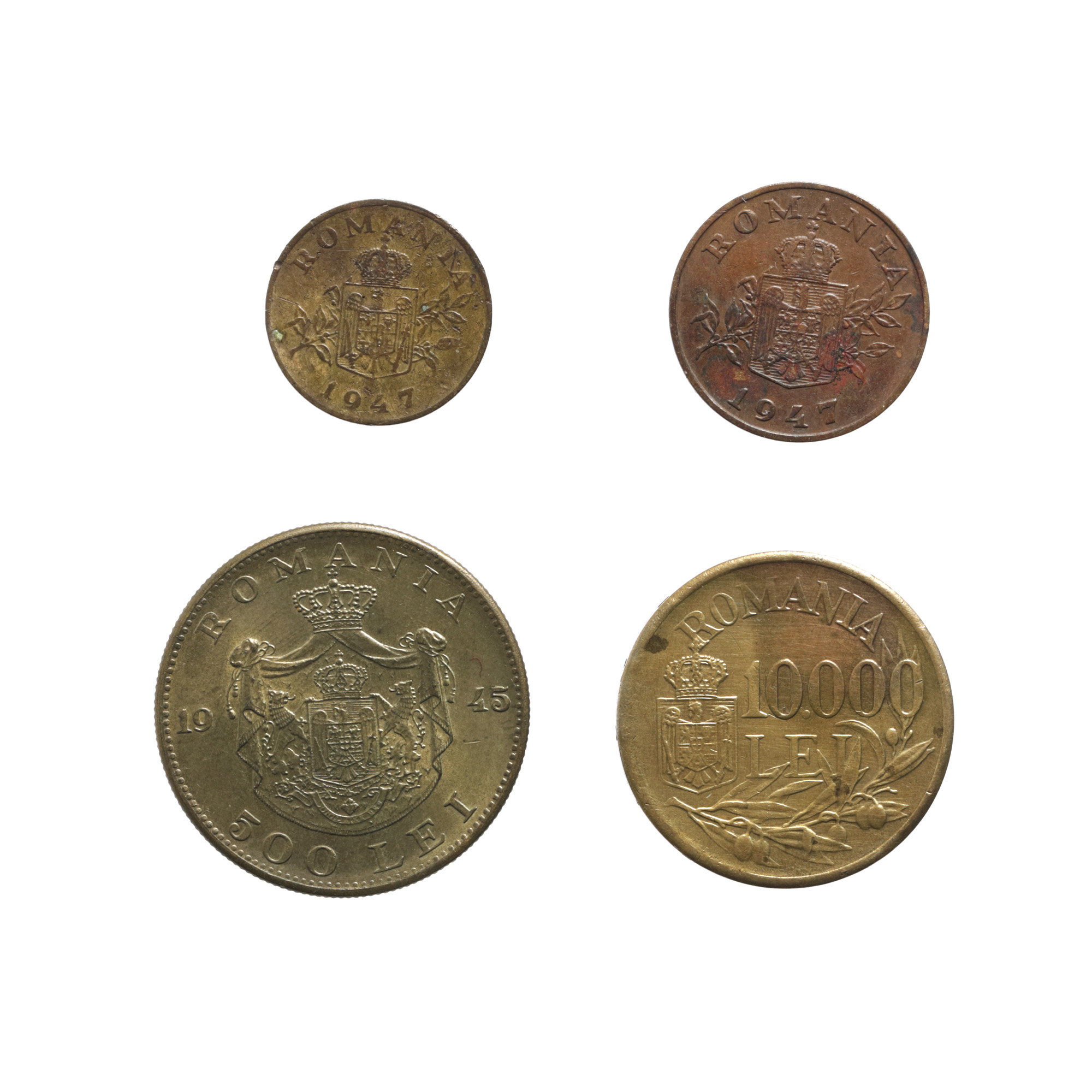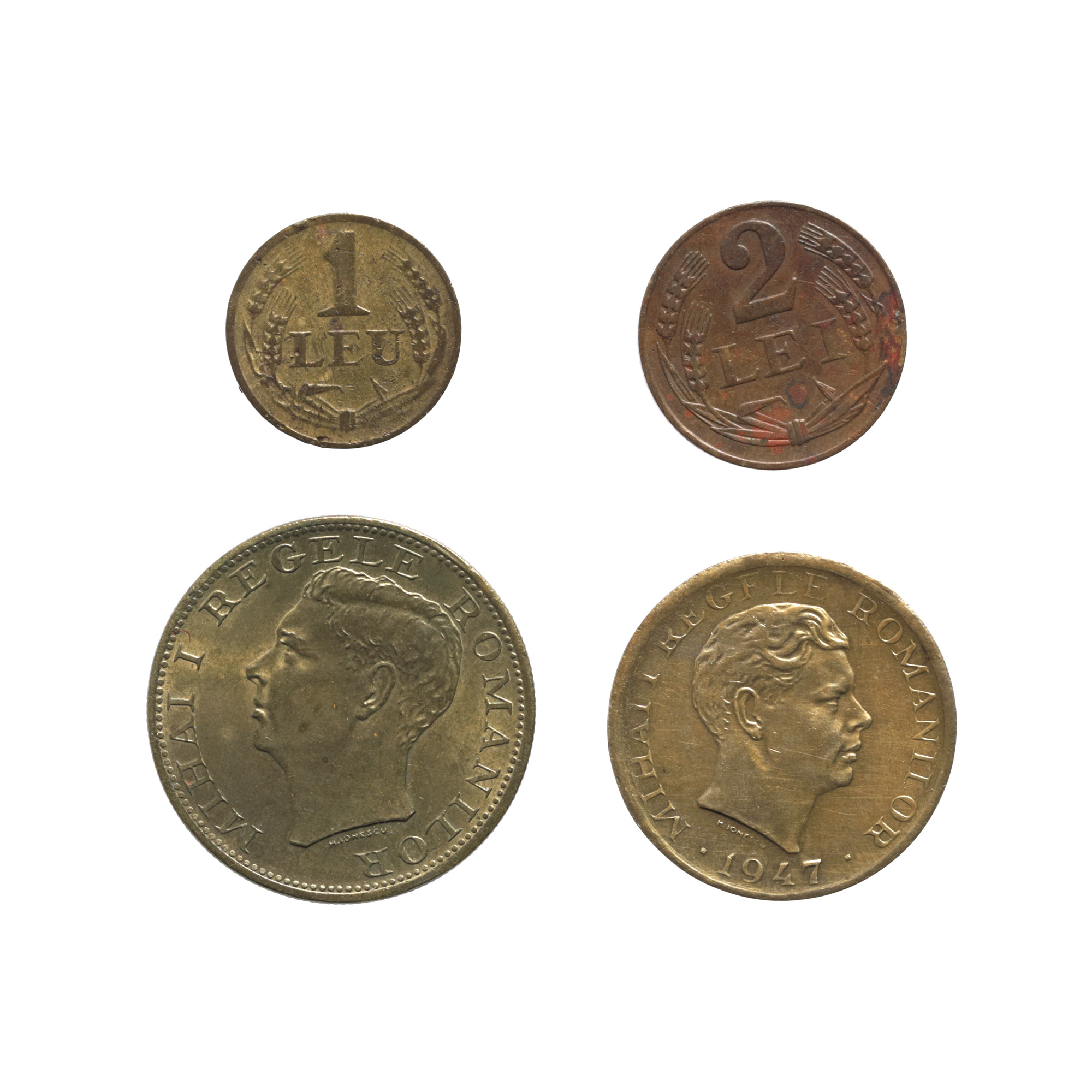 187. Lot format din patru monede emise în ultima perioadă de domnie a Regelui Mihai, de 500 Lei 1945, 10.000 Lei, 2 Lei și 1 Leu 1947