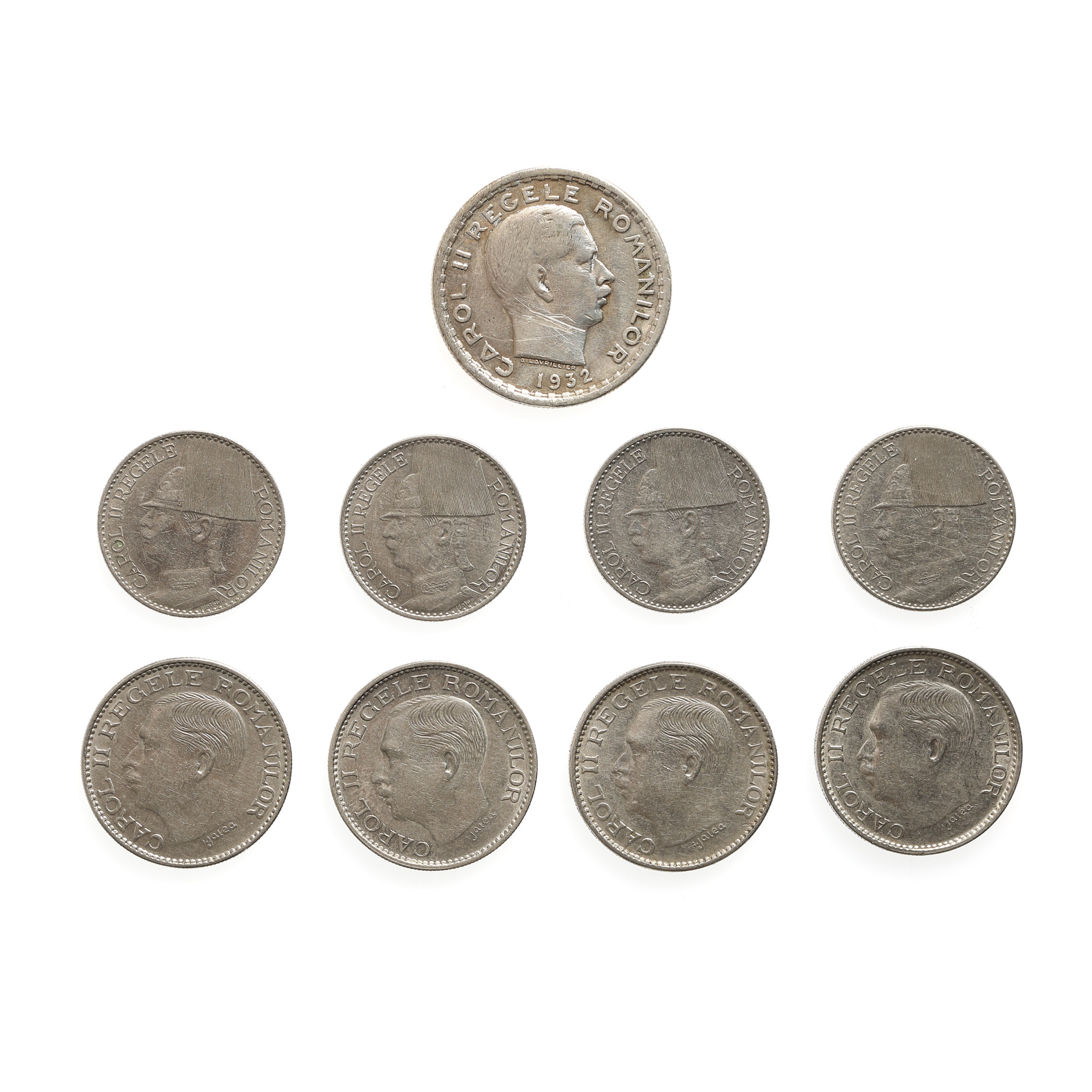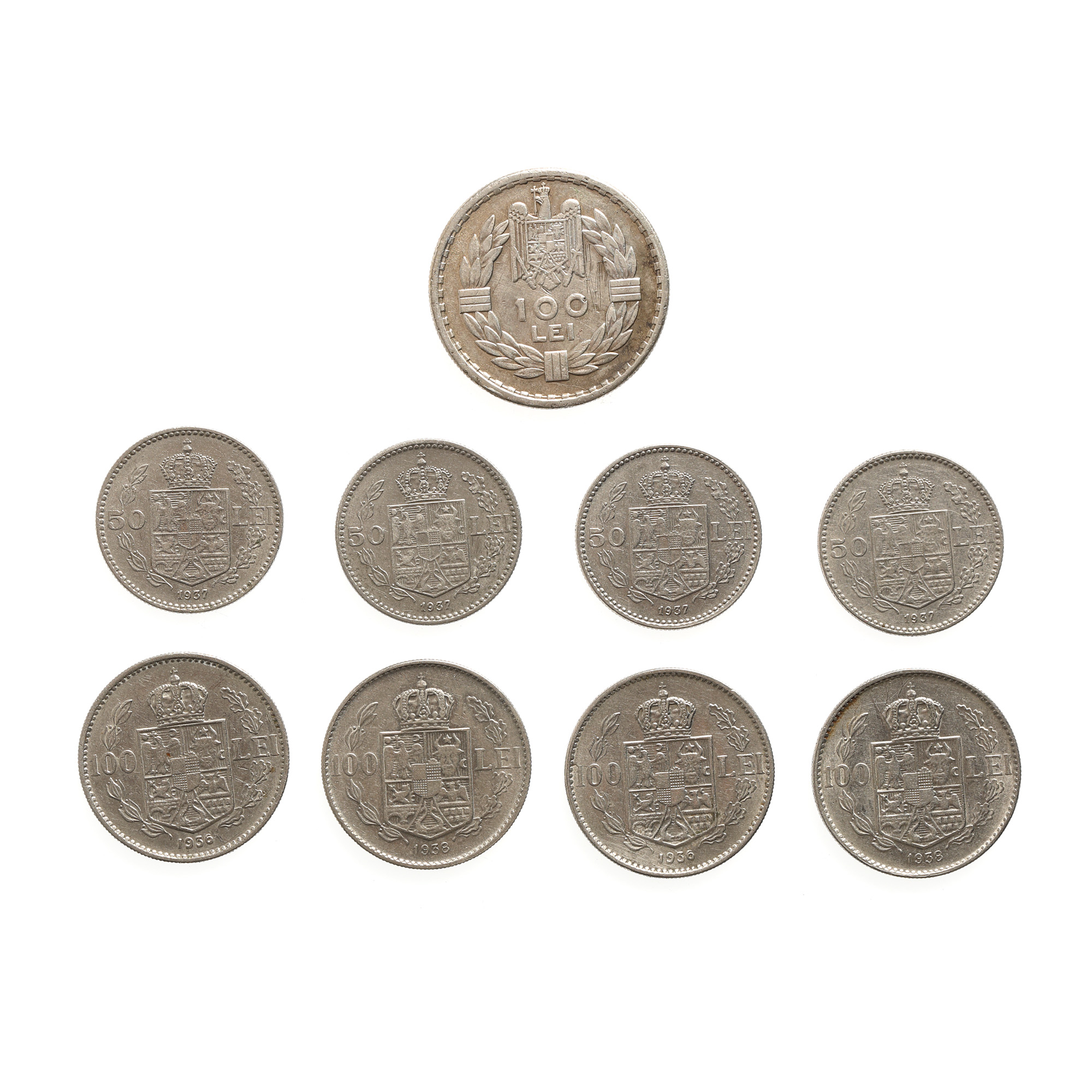 100 lei 1932: argint 500; 100 lei 1936, 1938: nichel; 50 lei 1937: nichel