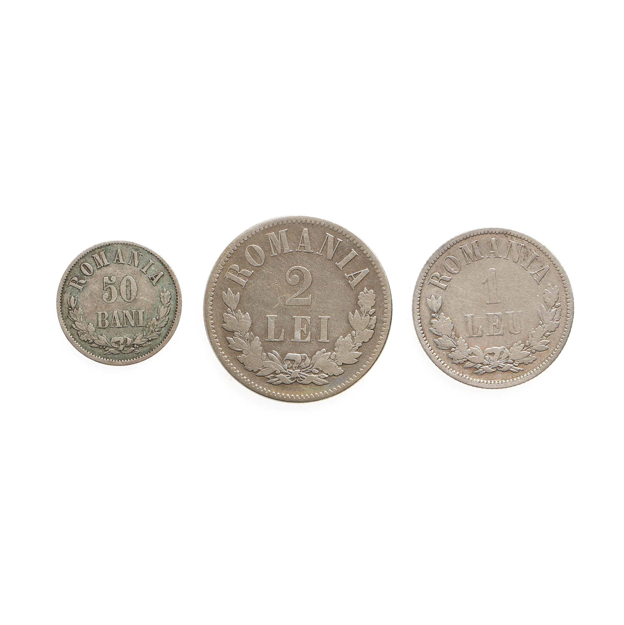 200. Lot format din trei monede, de 50 Bani, 1 Leu și 2 Lei 1873, argint