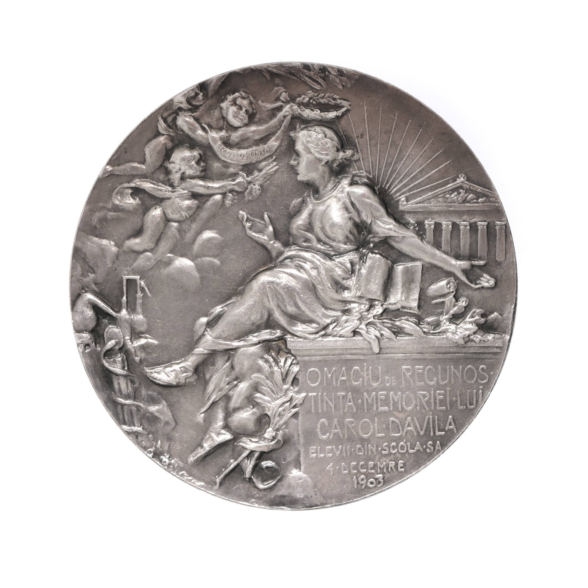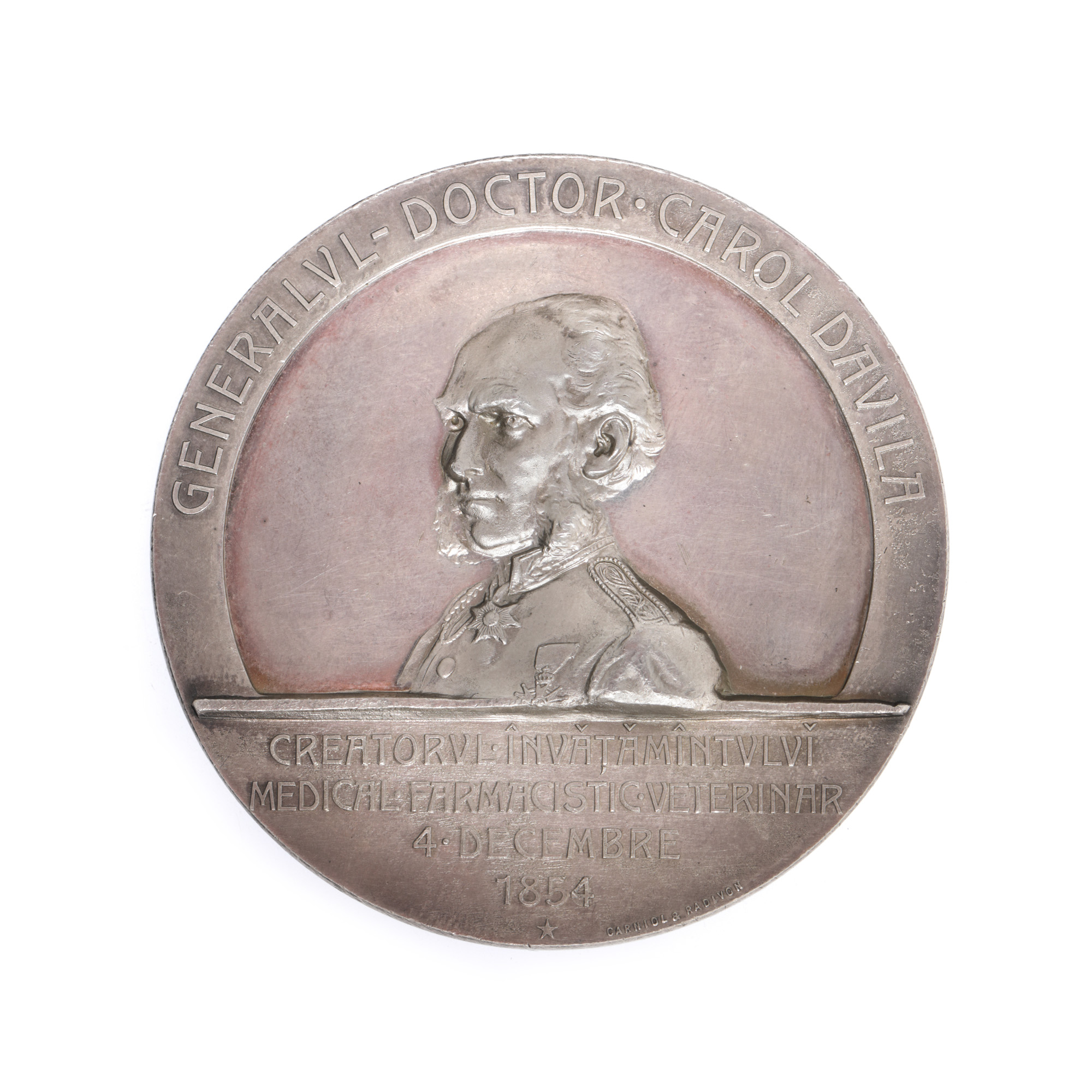 123. Medalia ”Omagiu și recunoștință lui Carol Davila din partea elevilor”, gravori Mauriciu Carniol și Theodor Radivon, 1904, argint