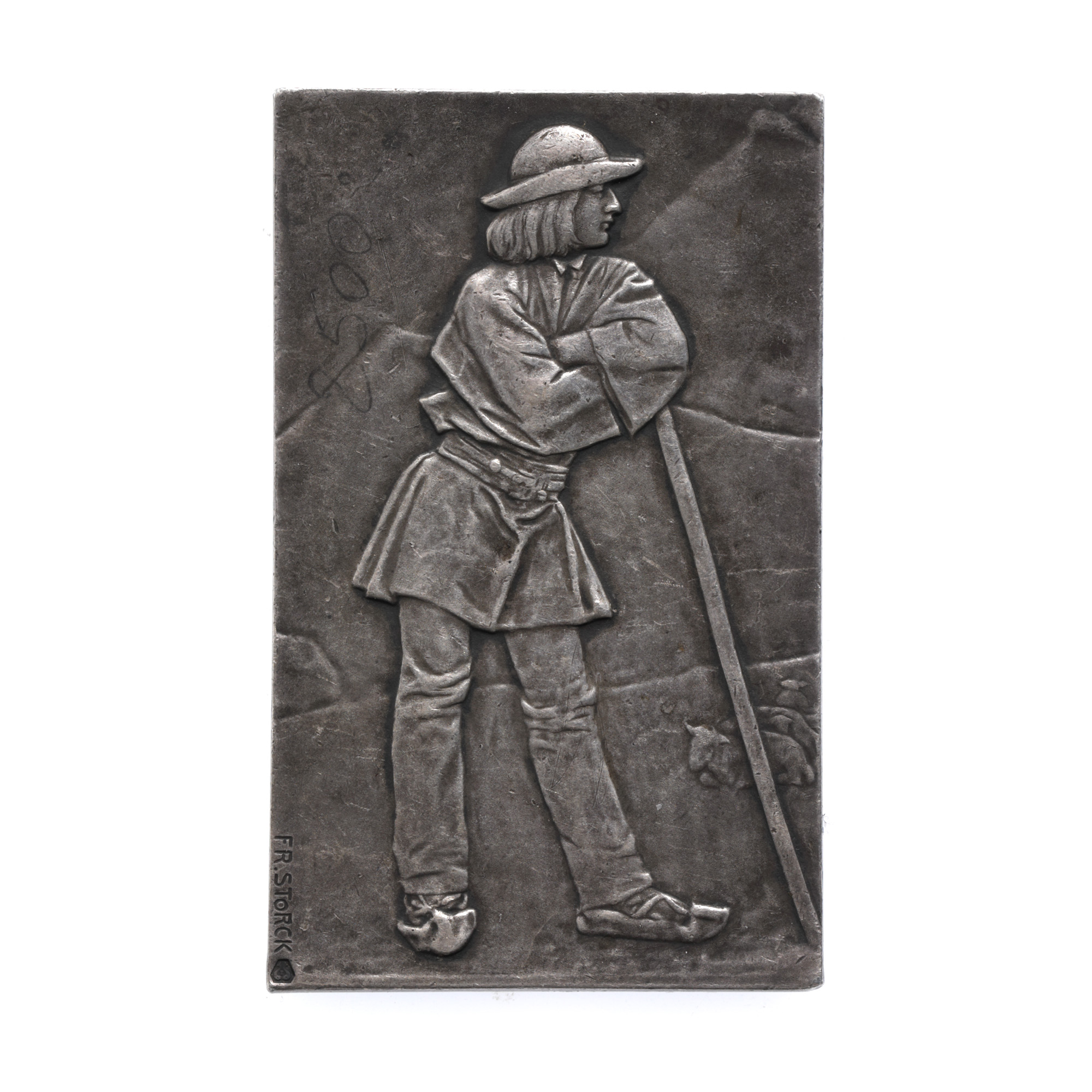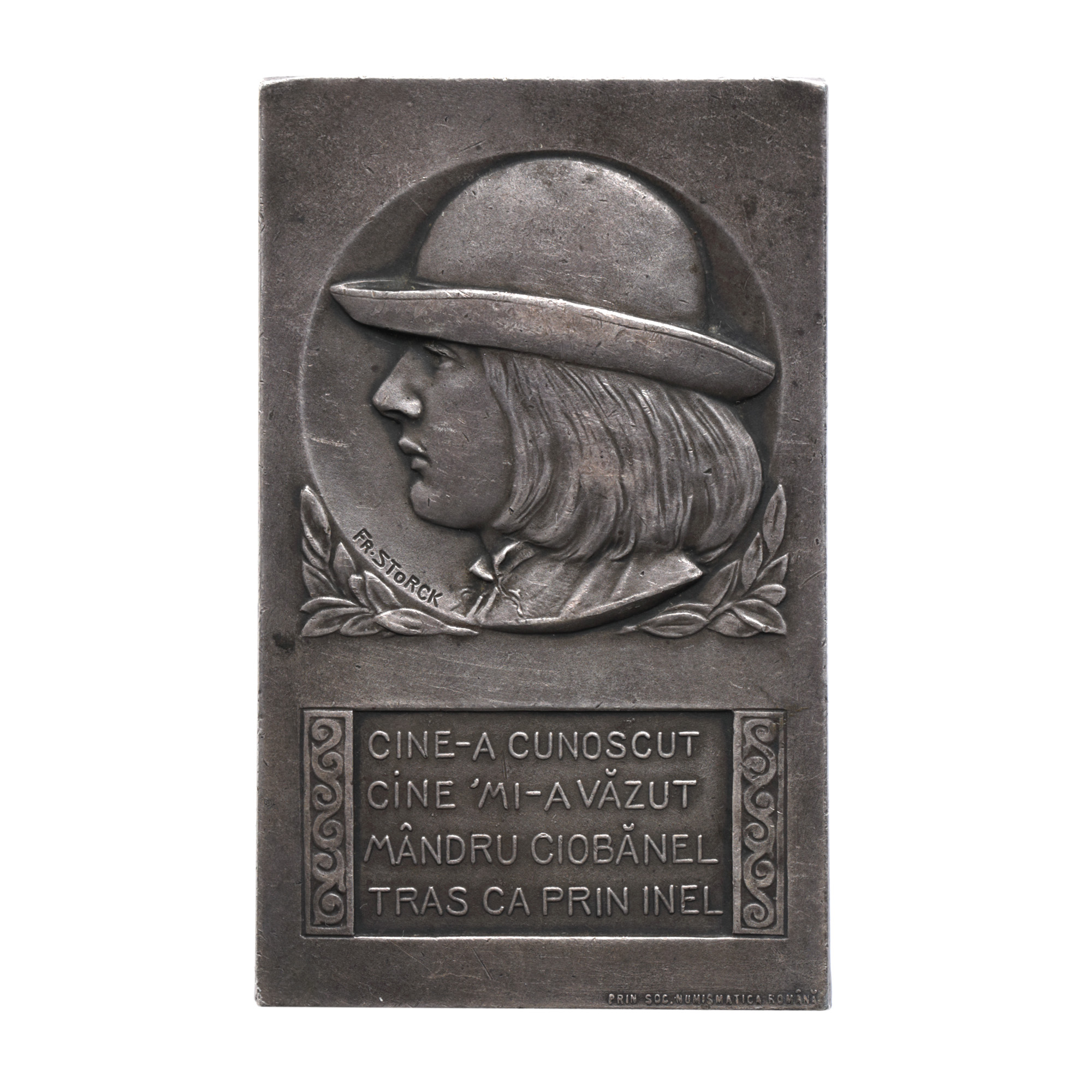 121. Placheta ”Mândru Ciobănel”, gravor Frederic Storck, începutul sec. XX, argint, piesă rară
