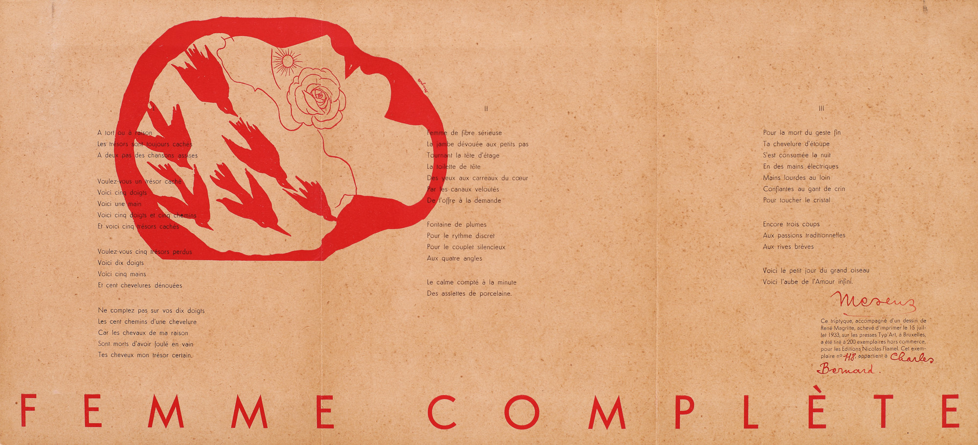 Opera, conținând o imagine litografiată după Rene Magritte, a fost imprimată pe data de 15 iulie 1933, la presa Typ'Art, Bruxelles, în 200 de exemplare destinate comerțului , plus Ediția Nicolas Flamel.
