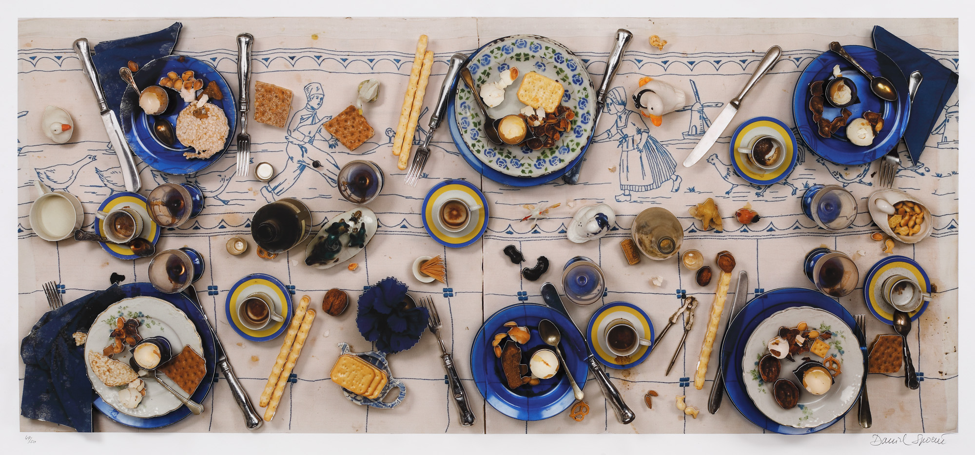 semnat dreapta jos, în creion, "Daniel Spoerri"; numerotat stânga jos, în creion, "49/50"; timbru sec, stânga jos, "Galerie F Edition"