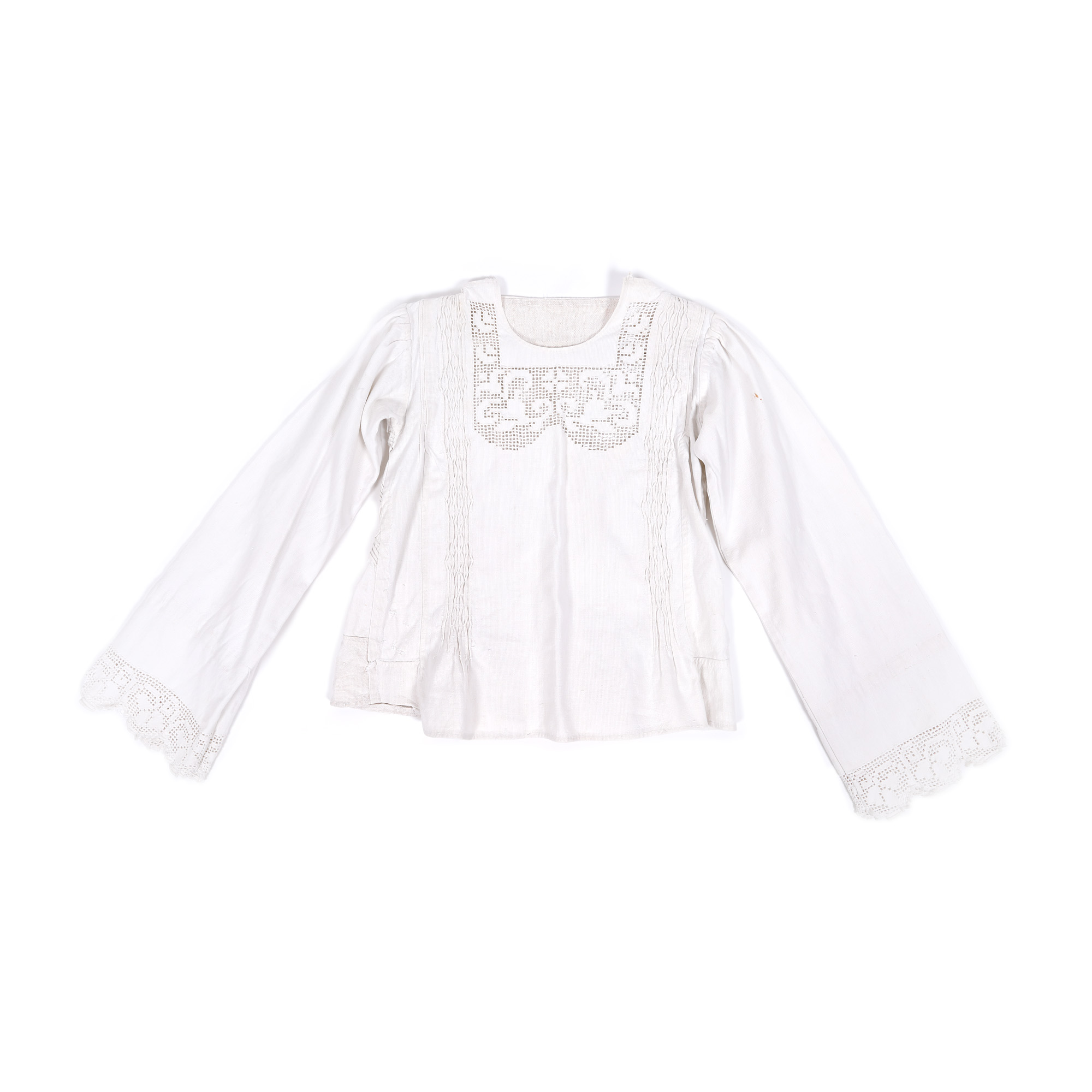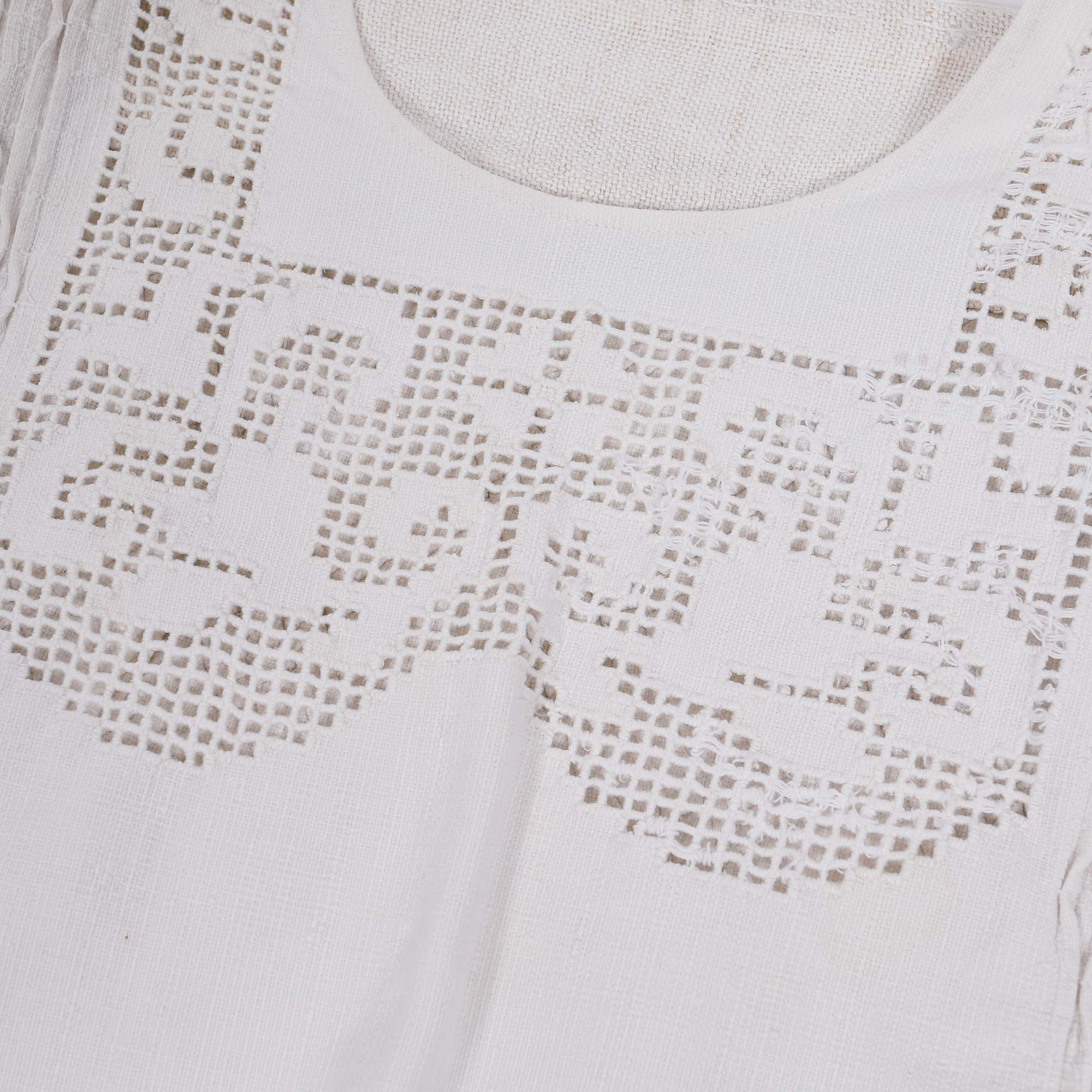 95. Cămașă din Țara Codrului, Satu Mare, din pânză de casă decorată cu broderie spartă; spatele prezintă ornamentica specifică realizată din cusături, cca. 1920