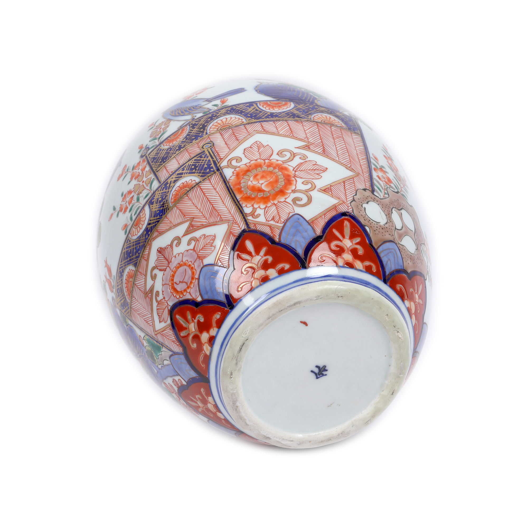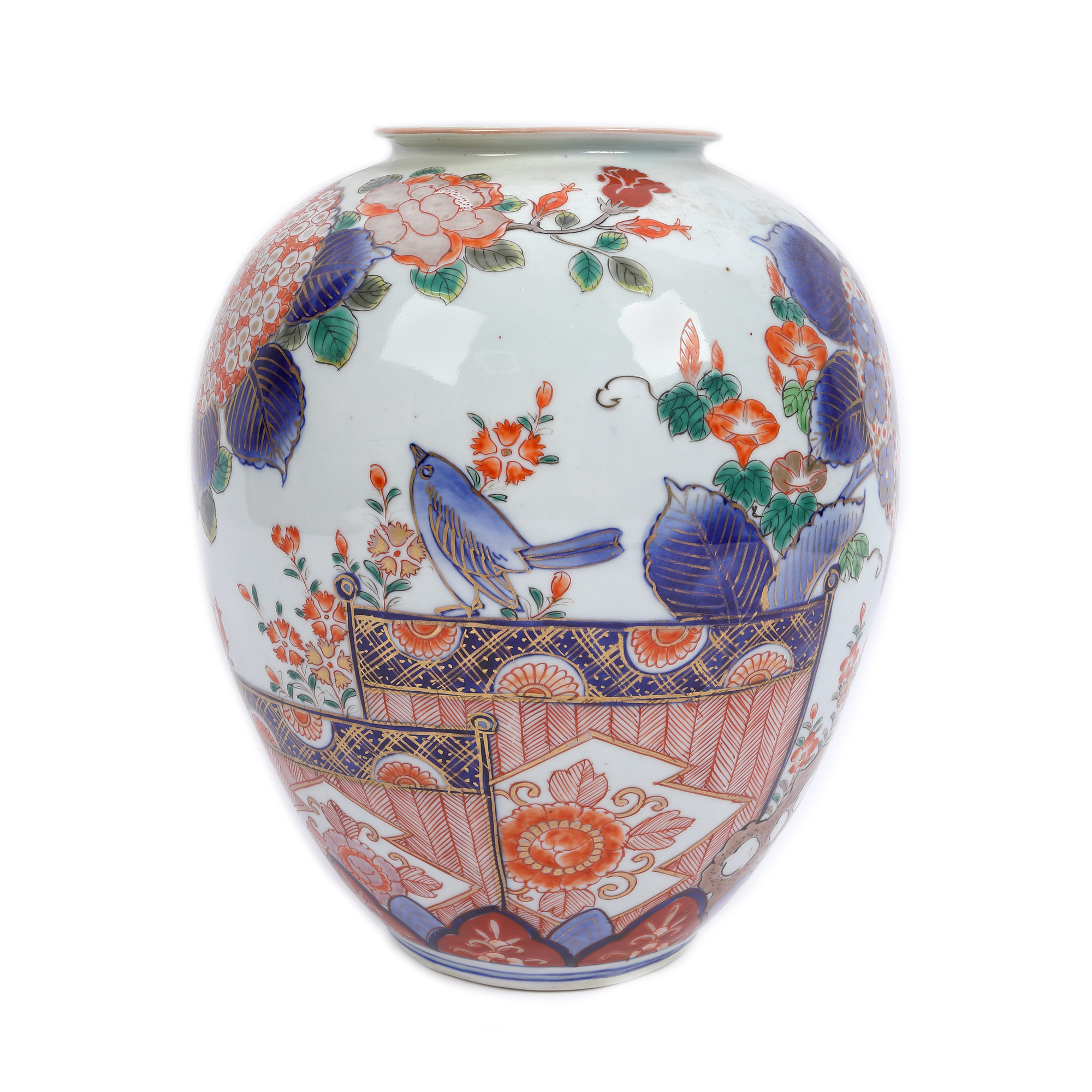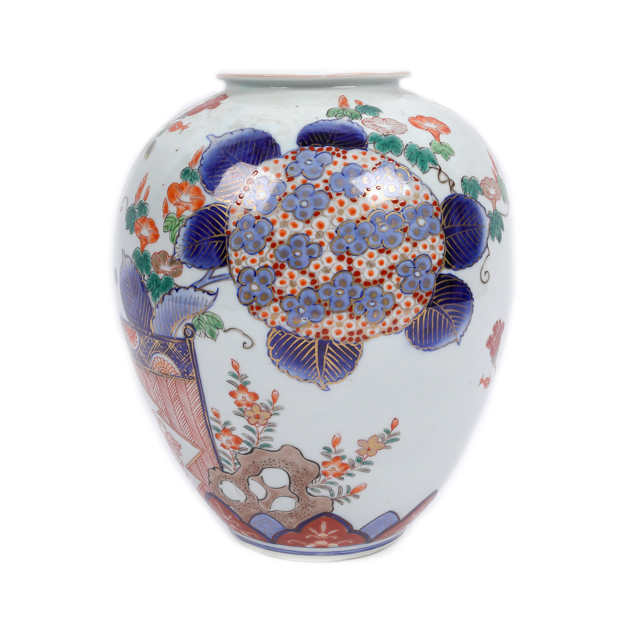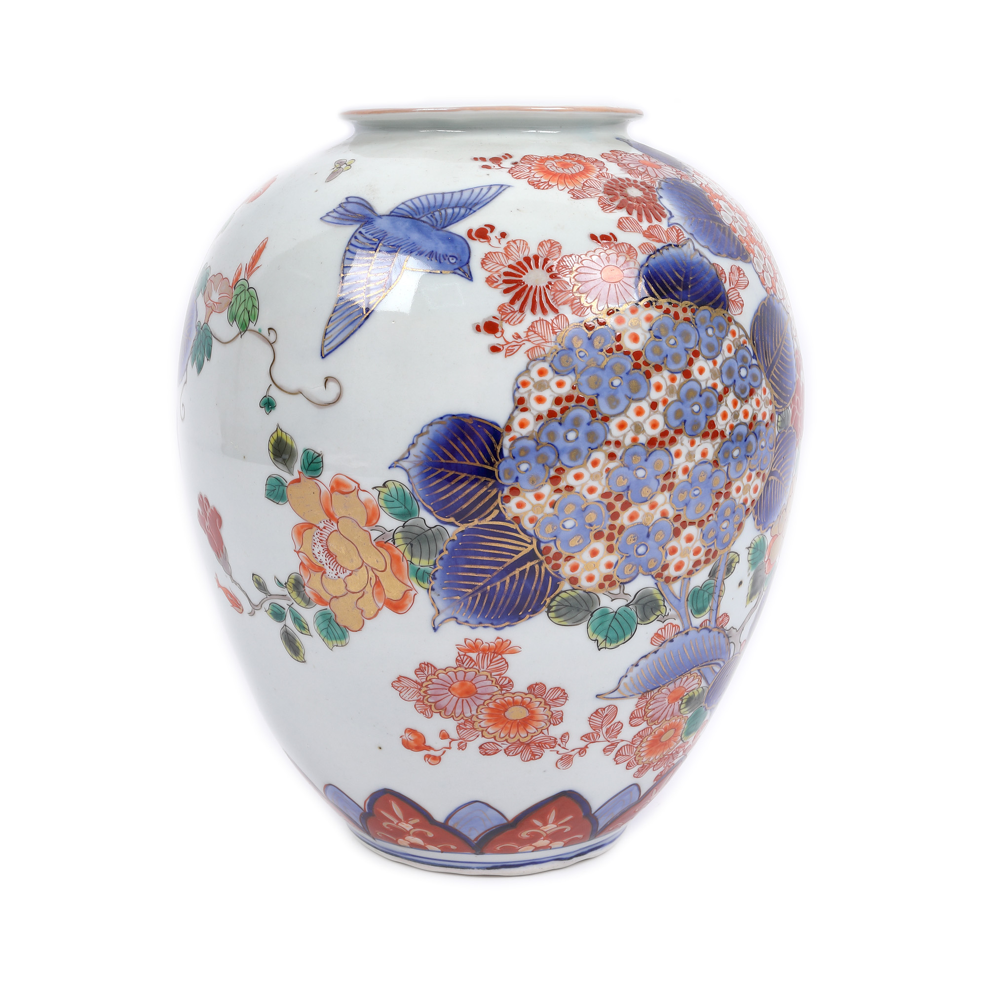 72. Excepțional vas Arita, decorat în tehnica Imari cu albastru cobalt și email cu hortensii și păsări, marcat, perioada Edo, Japonia, sec. XVIII, piesă foarte rară, de colecție