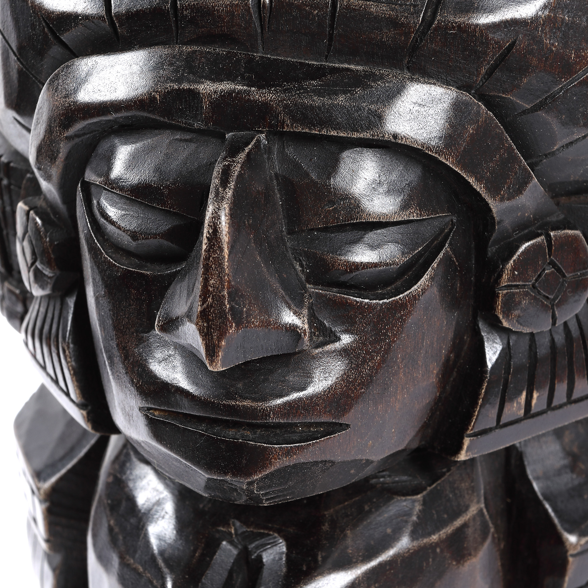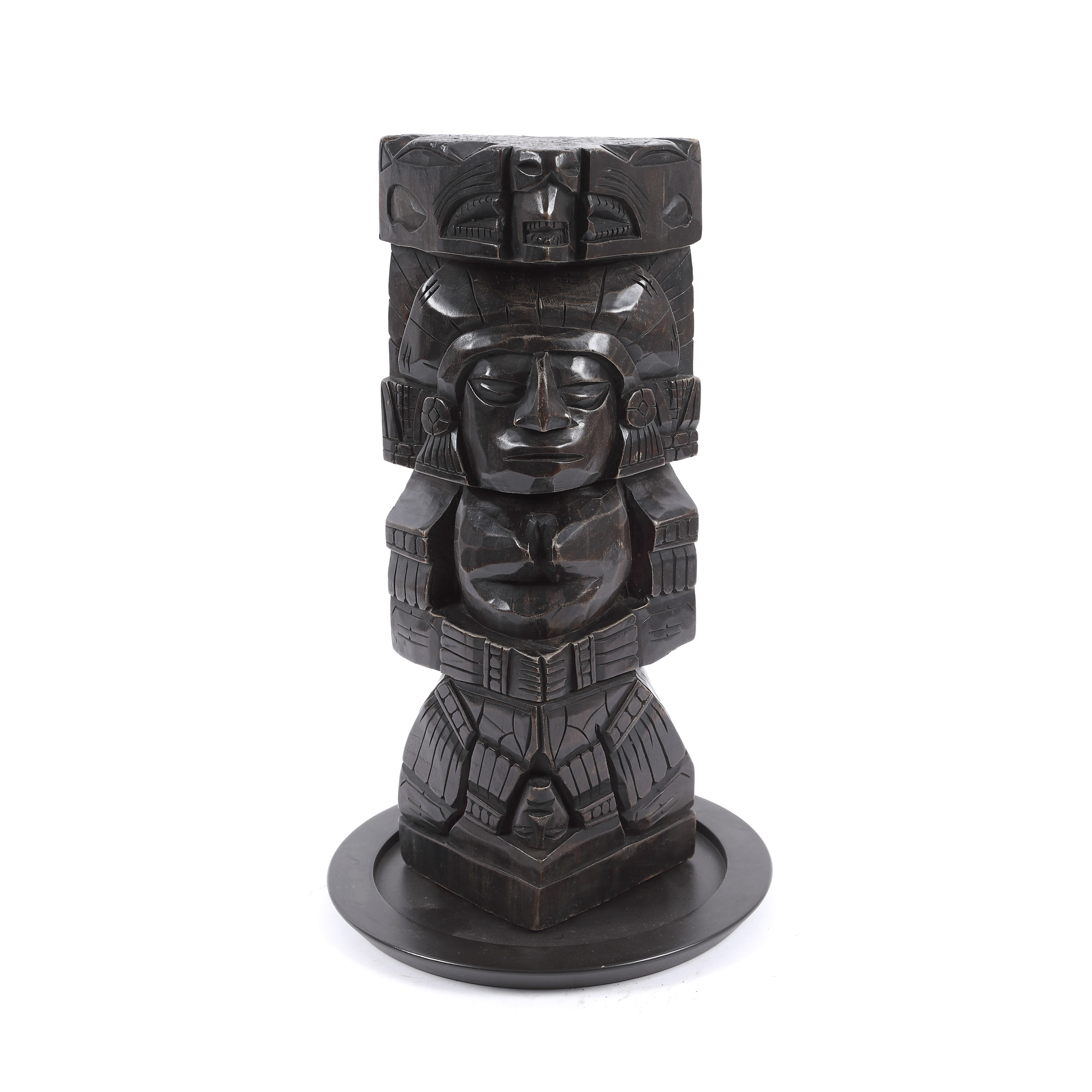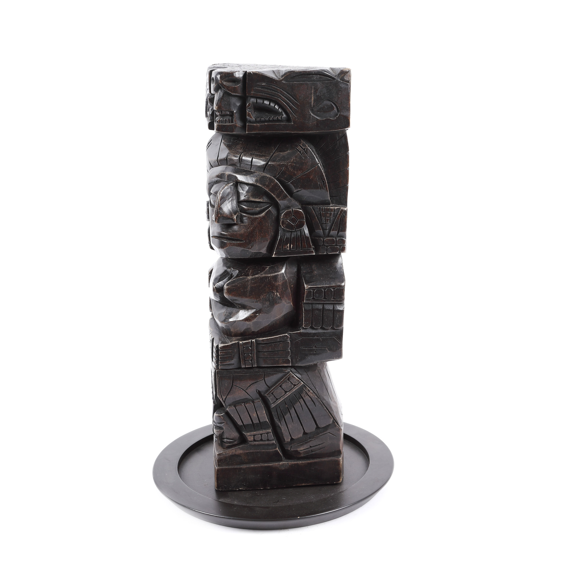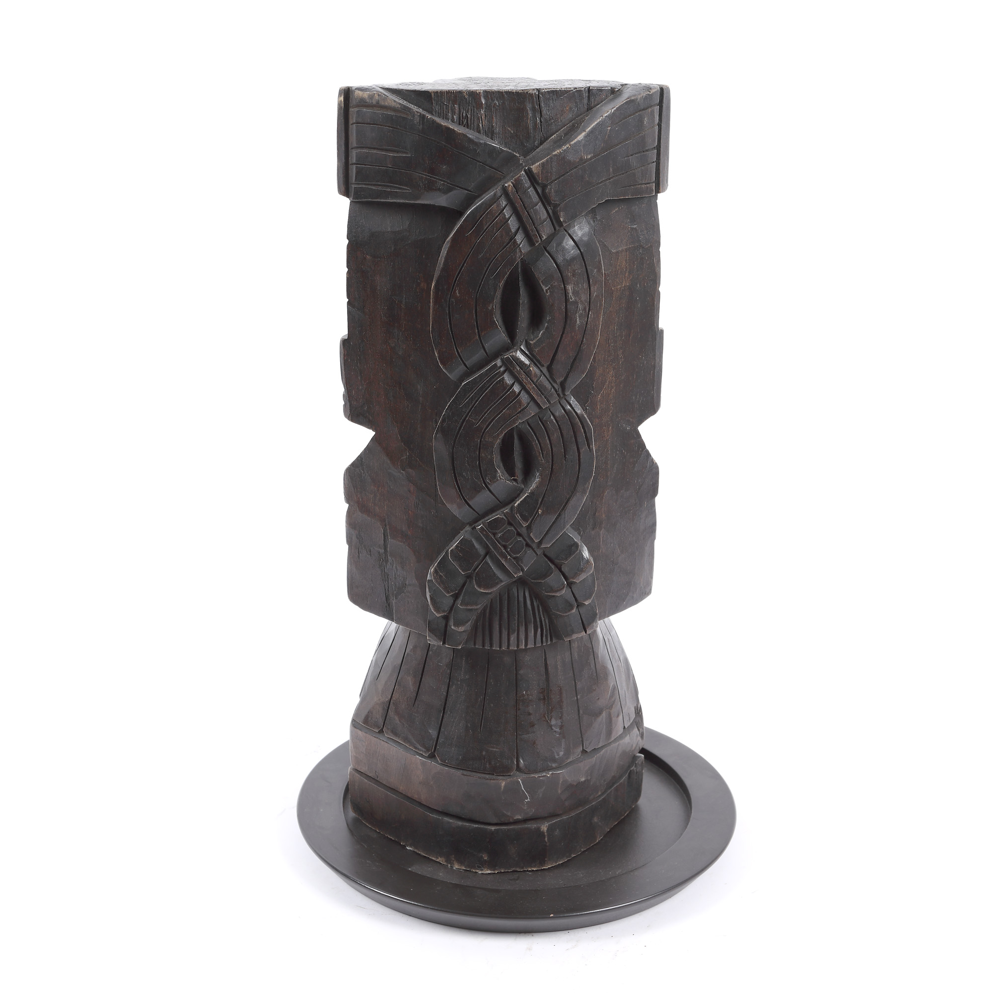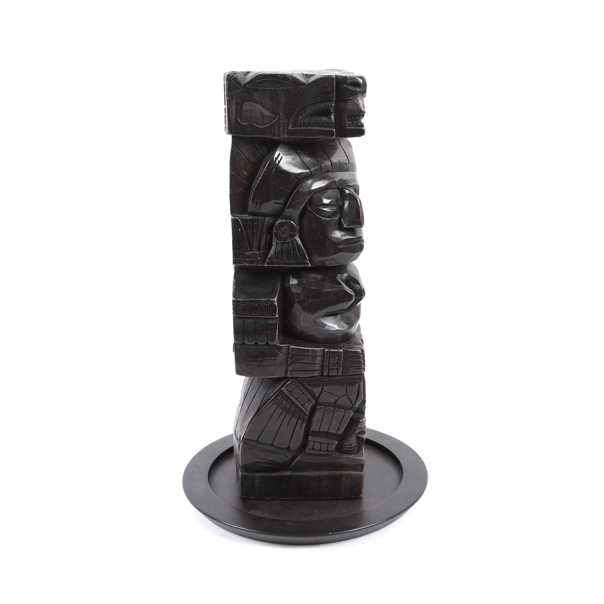 58. Totem din lemn exotic, însoțit de un suport rotund, America Centrală, mijlocul sec. XX