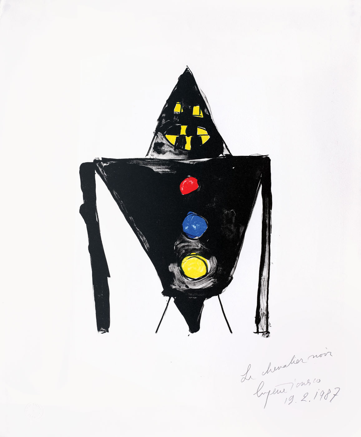 semnat, datat și intitulat dreapta jos, în creion, "Le chevalier noir, Eugen Ionesco, 19.2.1987"