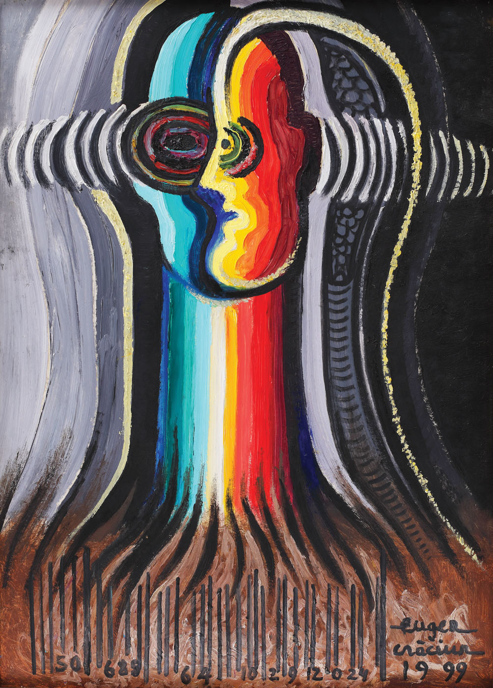 semnat și datat dreapta jos, cu negru, "Eugen Crăciun, 1999"; semnat, datat și intitulat pe verso, cu negru, "Eugen Crăciun, Portret reflectat, 1999"