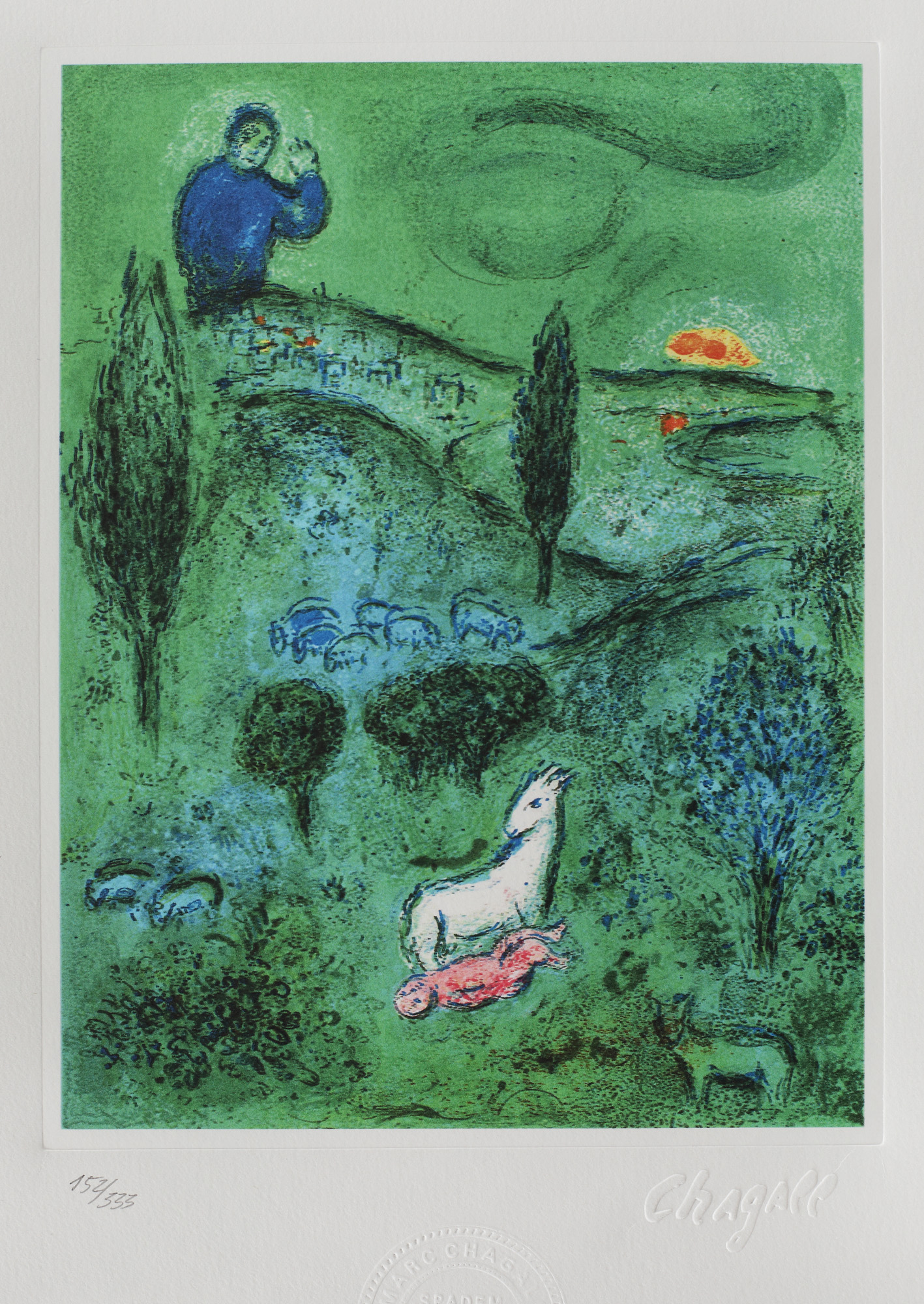 semnat, gravat, dreapta jos, sub cadru, "Chagall"; numerotat stânga jos, sub cadru, în creion, "152/333"; central jos, ştampila editurii, "SPADEM, Marc Chagall, Edition of 333"
