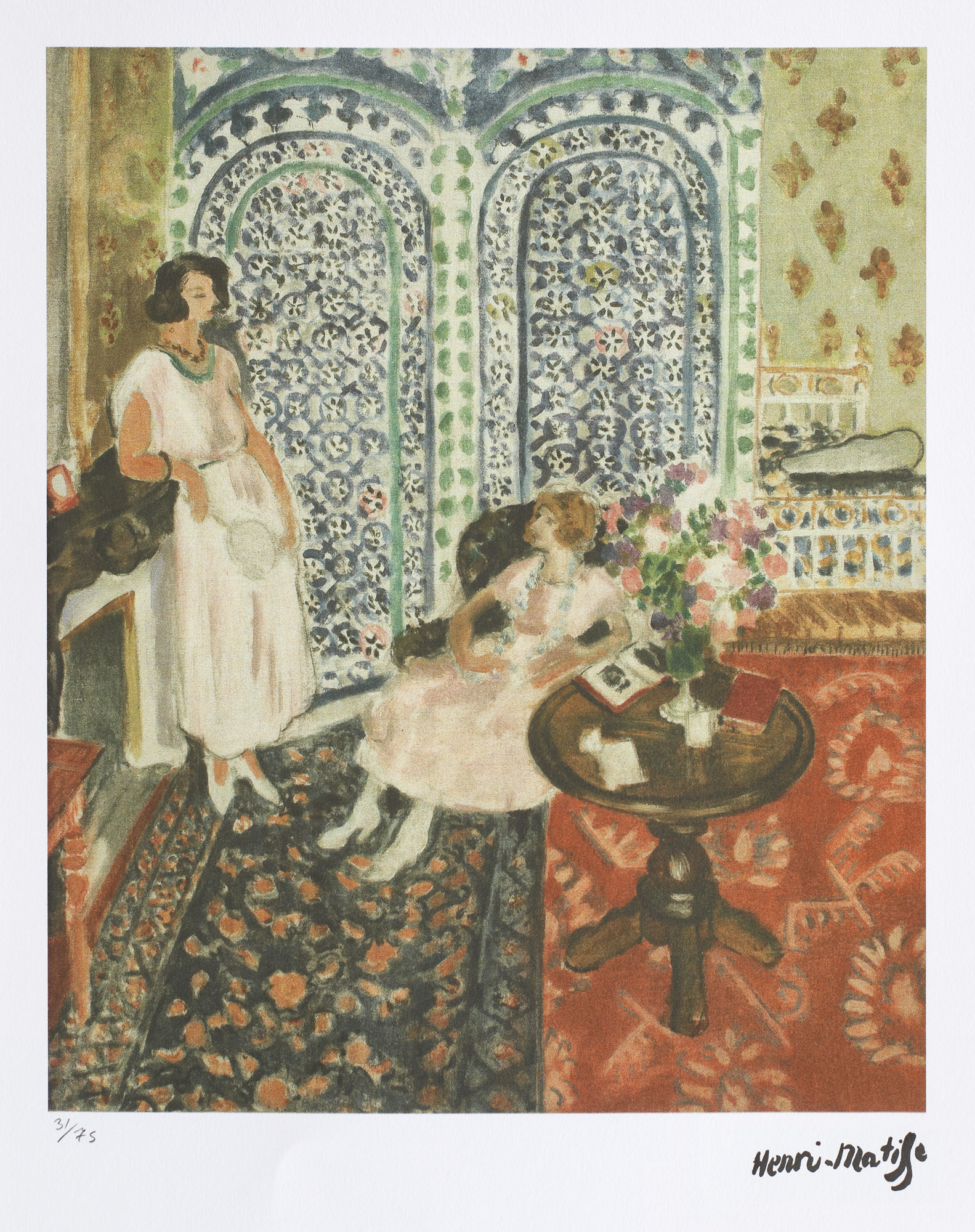 semnat dreapta jos, sub cadru, ”Henri Matisse”; numerotat stânga jos, sub cadru, în creion, ”31/75”; stânga jos, ștampila editurii, ”SPADEM PARIS”