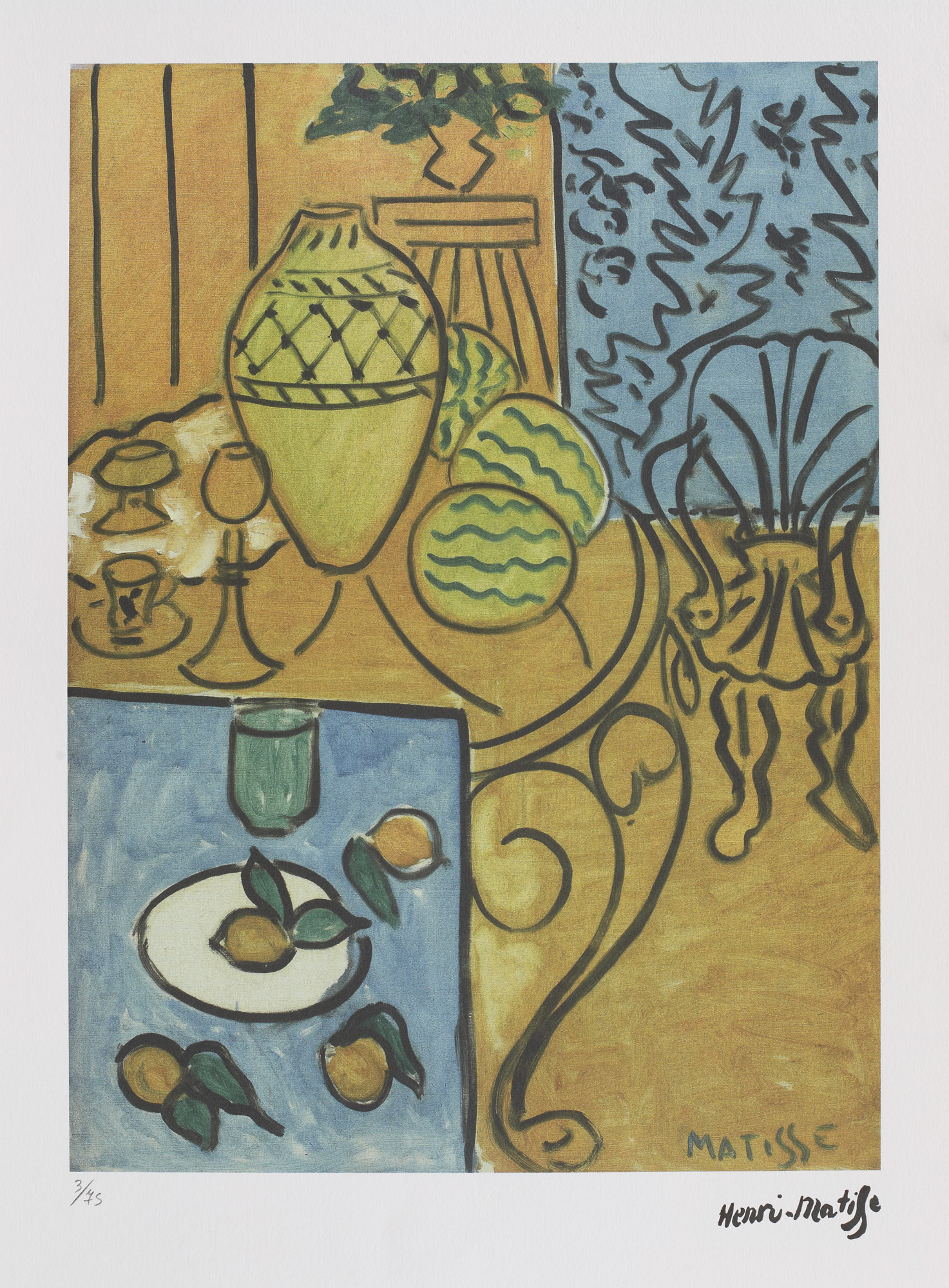 semnat dreapta jos, sub cadru, ”Henri Matisse”; numerotat stânga jos, sub cadru, în creion, ”3/75”; stânga jos, ștampila editurii, ”SPADEM PARIS”
