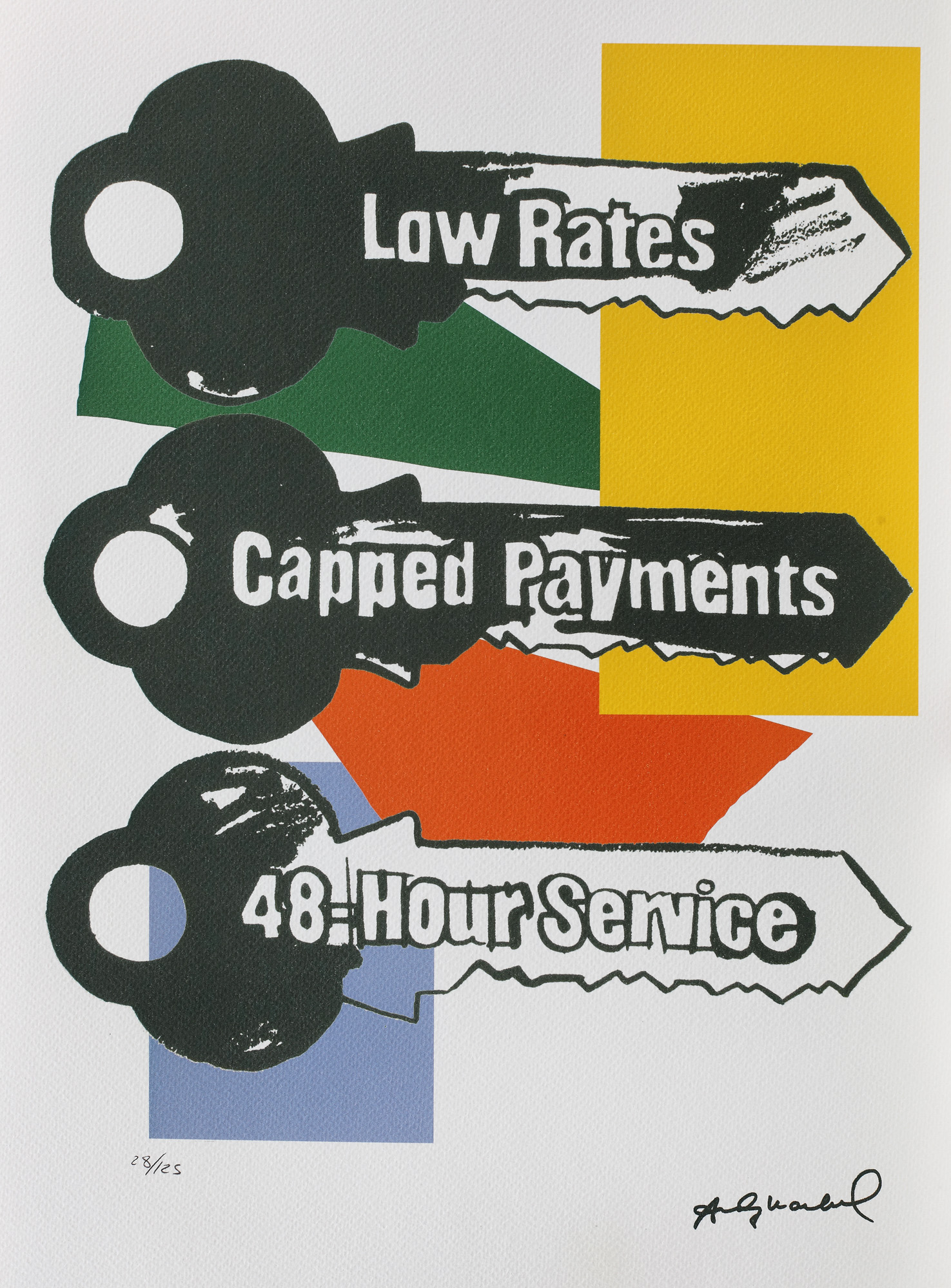 semnat dreapta jos, sub cadru, ”Andy Warhol”; numerotat stânga jos, sub cadru, în creion, ”28/125”