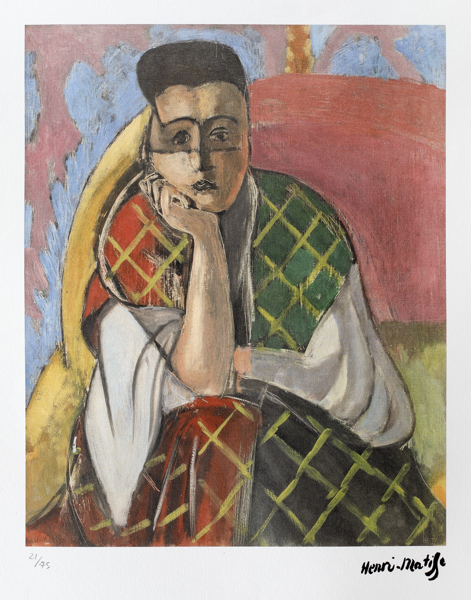 semnat dreapta jos, gravat, "Henri Matisse"; numerotat stânga jos, în creion, "21/75"; stânga jos, ștampila editurii, ”SPADEM Paris”