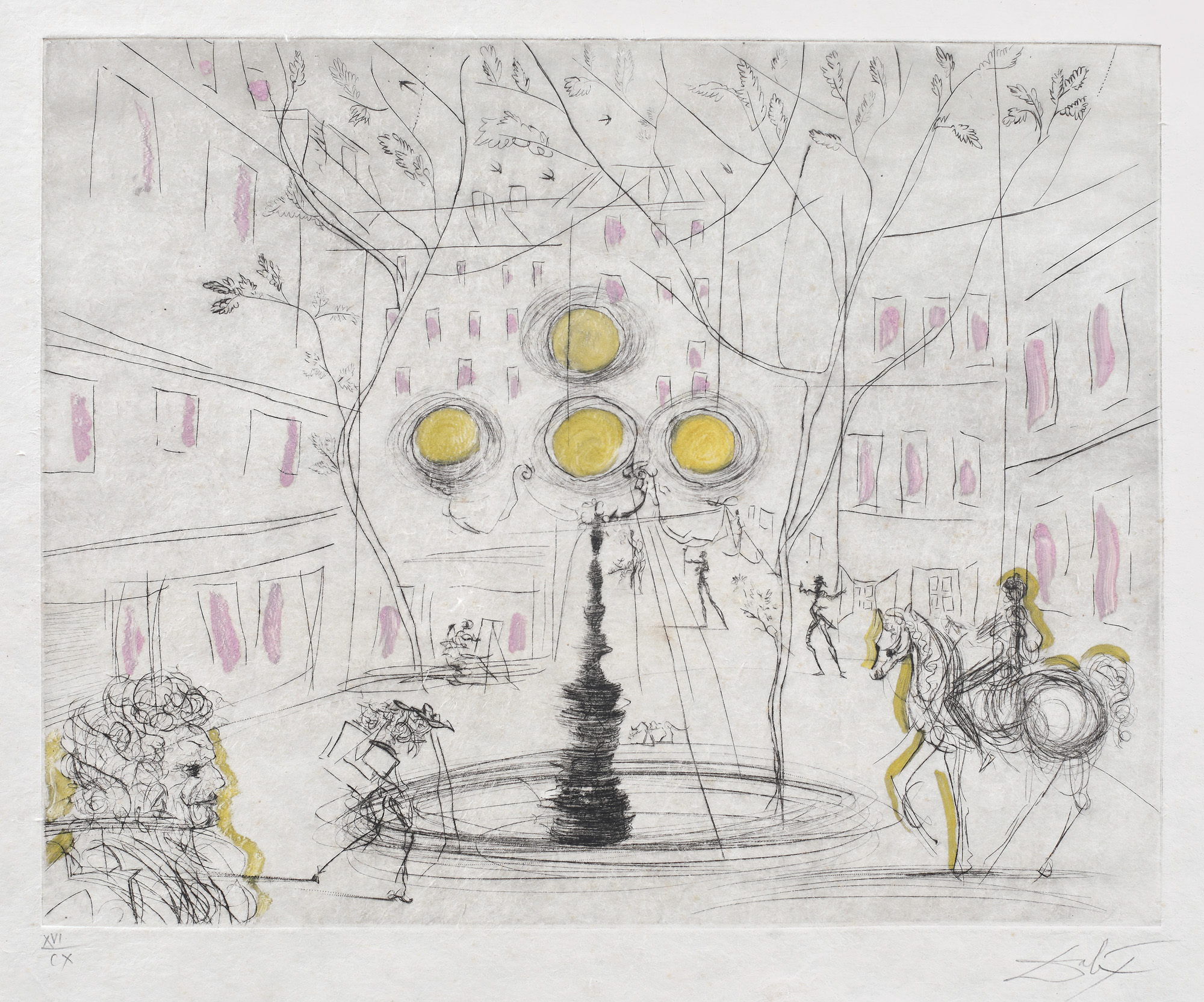 semnat dreapta jos, sub cadru, în creion, "Dali"; numerotat stânga jos, sub cadru, în creion, "XVI/CX"; localizat stânga jos, în creion, "Place Furstenberg"