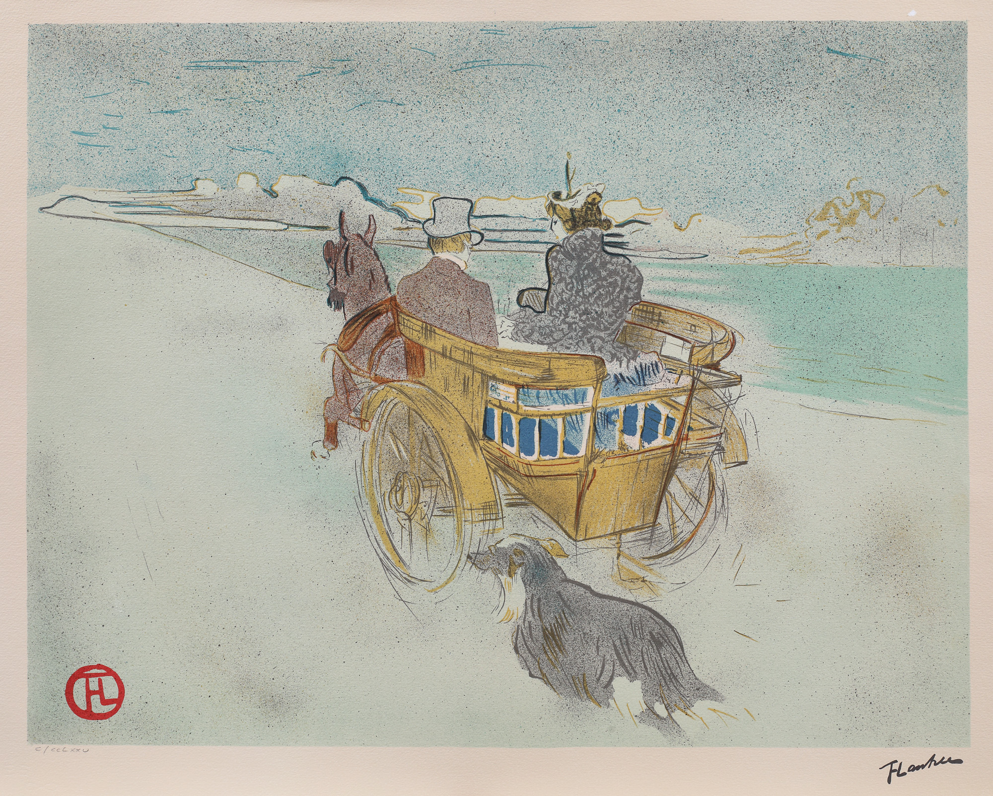 semnat, gravat, dreapta jos, sub cadru, ”T. Lautrec”; semnat, gravat, stânga jos, în monogramă, ”T.L.”; numerotat stânga jos, sub cadru, în creion, ”C/CCCXXV”