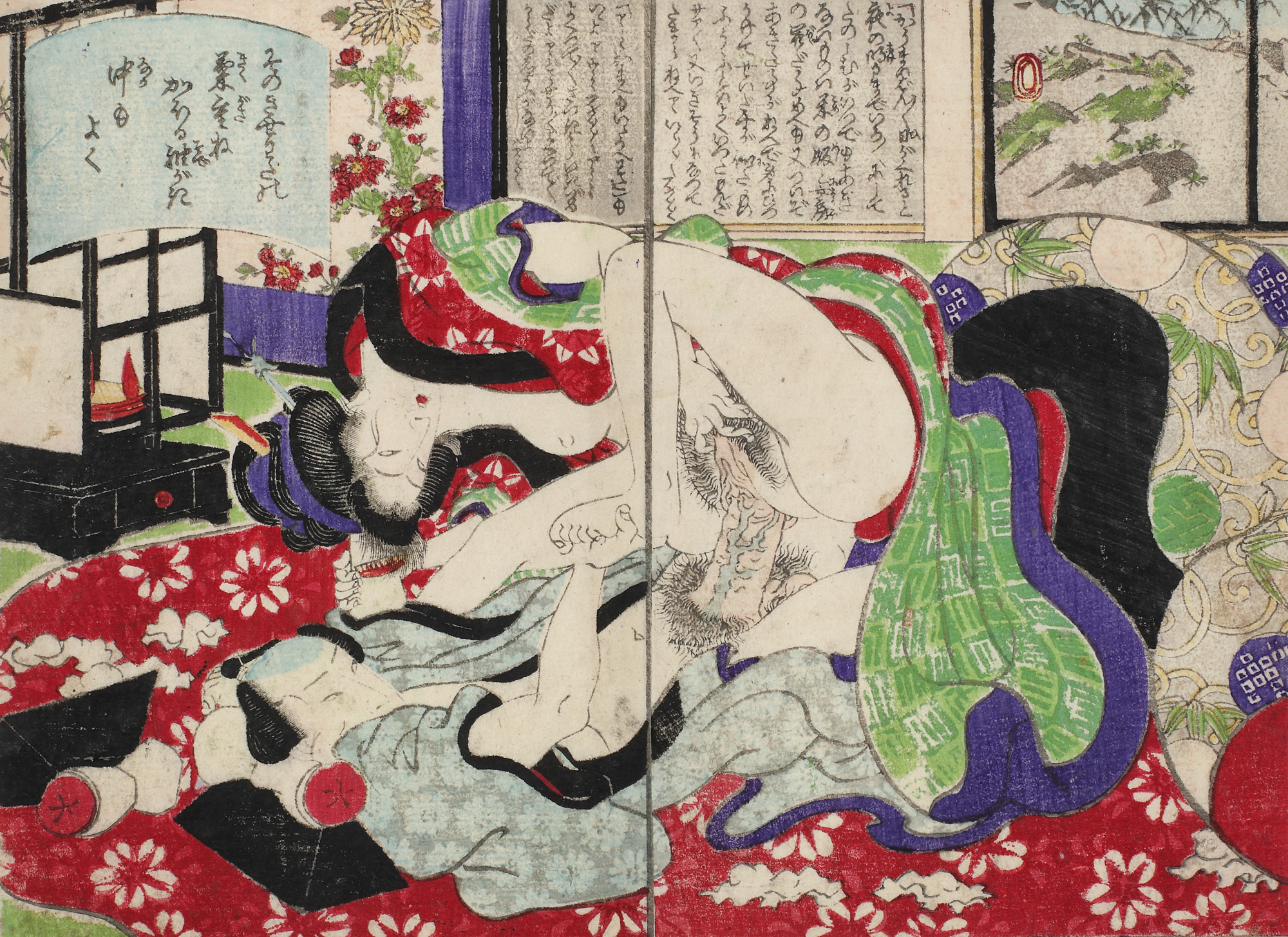 110. Scenă erotică (Shunga), reprezentând un cuplu cuprins de pasiune, într-un washitsu tradițional [începutul sec. XIX]