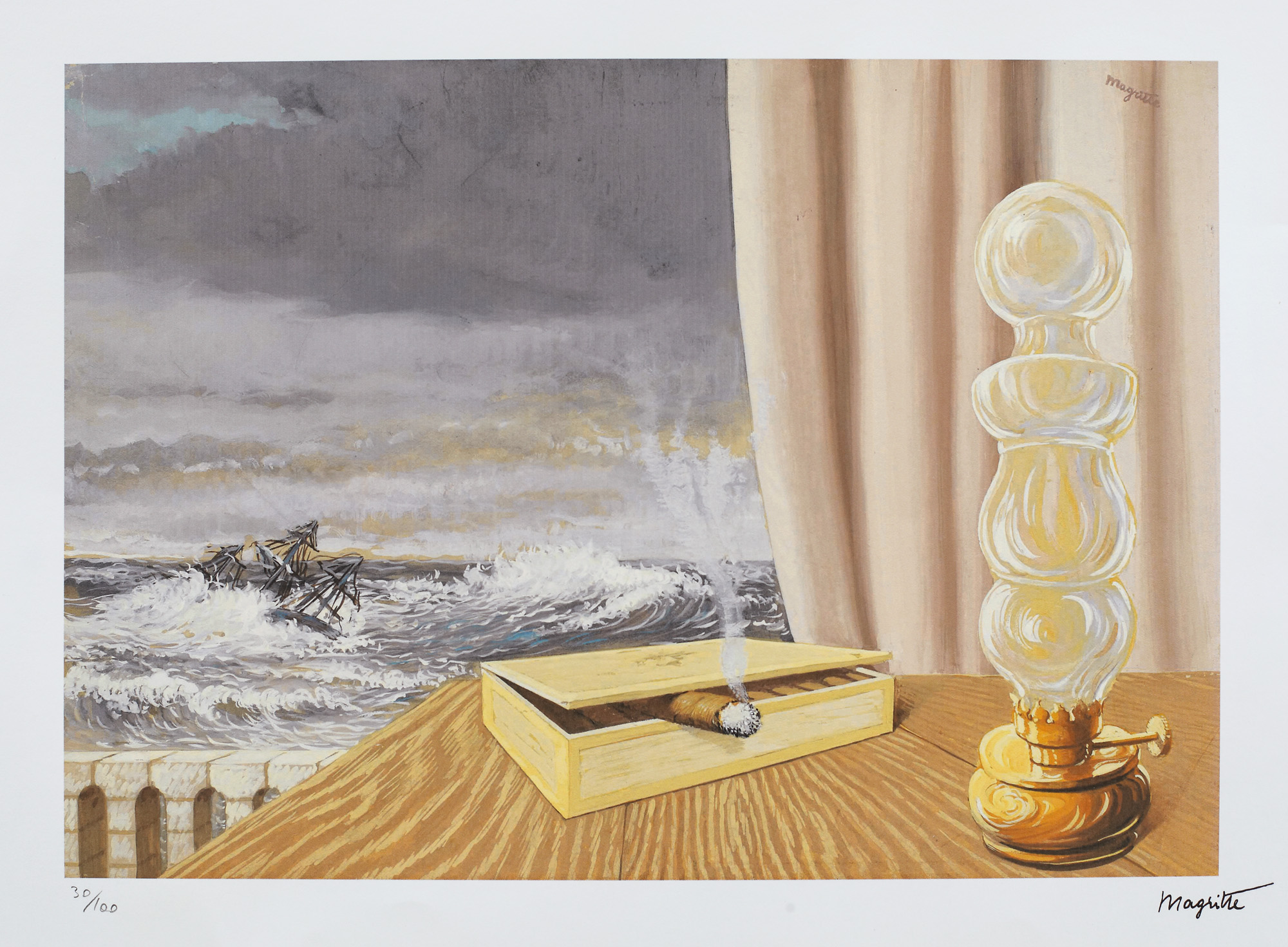 semnat dreapta jos, sub cadru, ”Magritte”; numerotat stânga jos, sub cadru, în creion, ”30/100”; stânga jos, ștampila editurii, ”SPADEM PARIS”