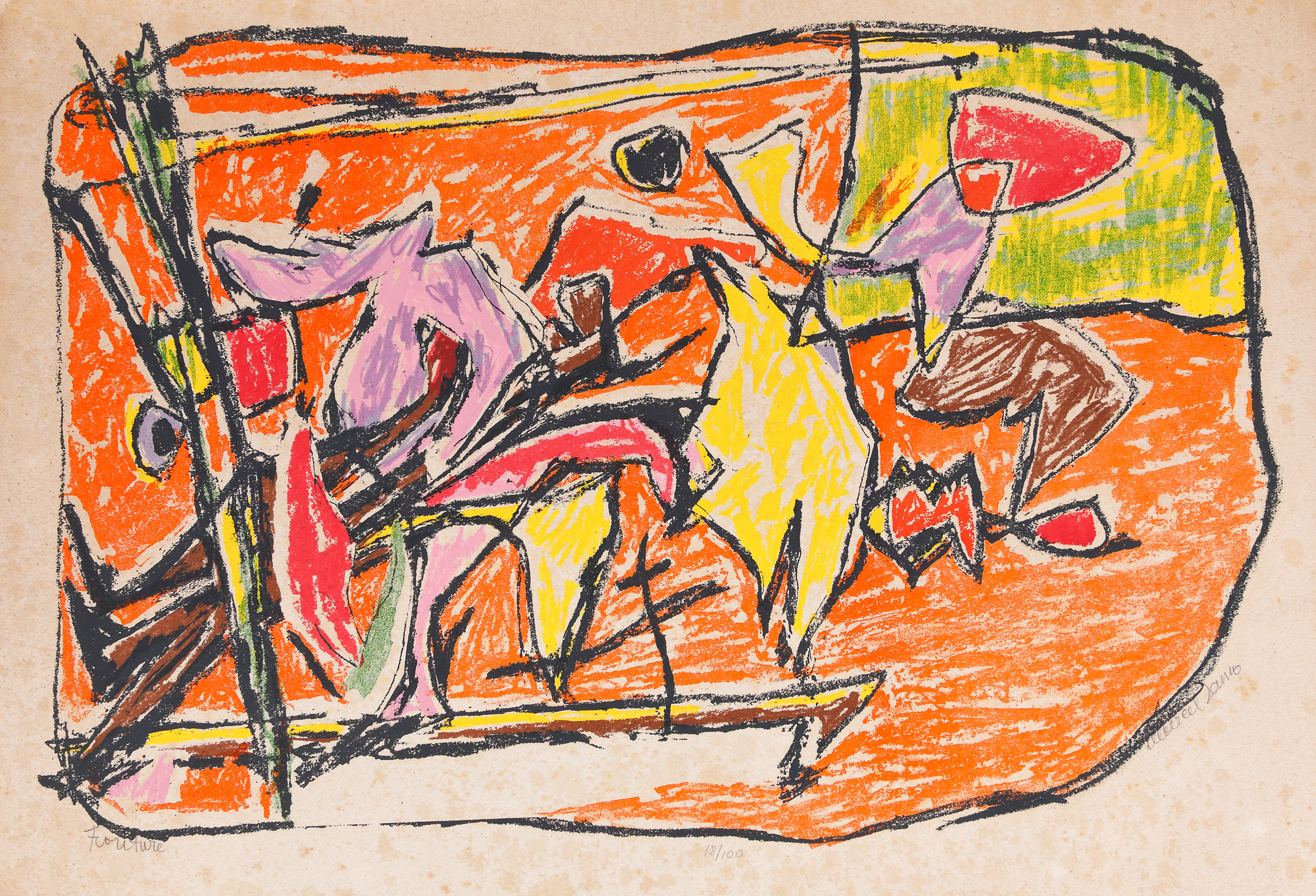 semnat dreapta jos, în creion, "Marcel Janco"; numerotat central jos, În creion, "18/100"; intitulat stânga jos, în creion, "Fioriture”