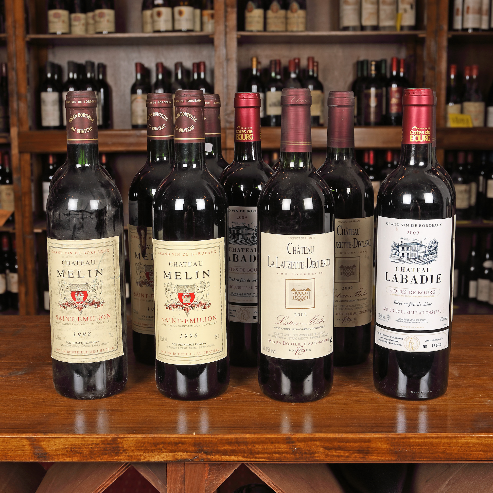Château Melin, Saint-Émilion, 1998, 4st x 0,75l Château Labadie, Côtes de Bourg, 2009, 3st x 0,75l Château La Lauzette-Declercq, 2002, 3st x 0,75l
