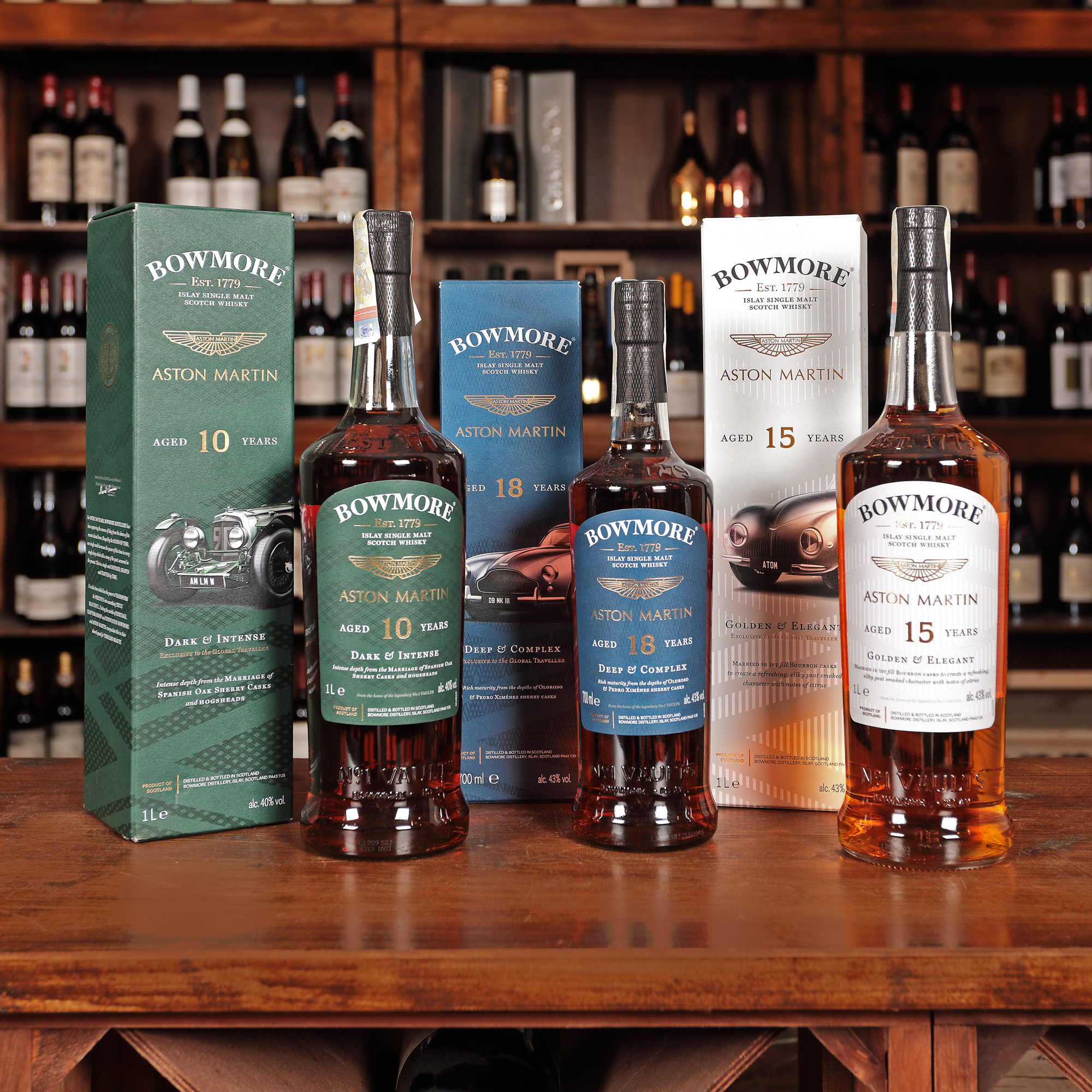 114. Colecție completă Bowmore Aston Martin, 10 ani vechime, 15 ani vechime și 18 ani vechime, 1st x 0,7l, 2st x 1l