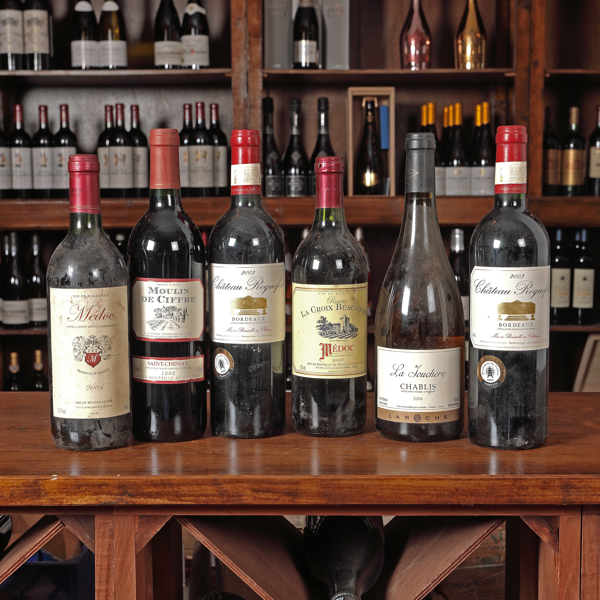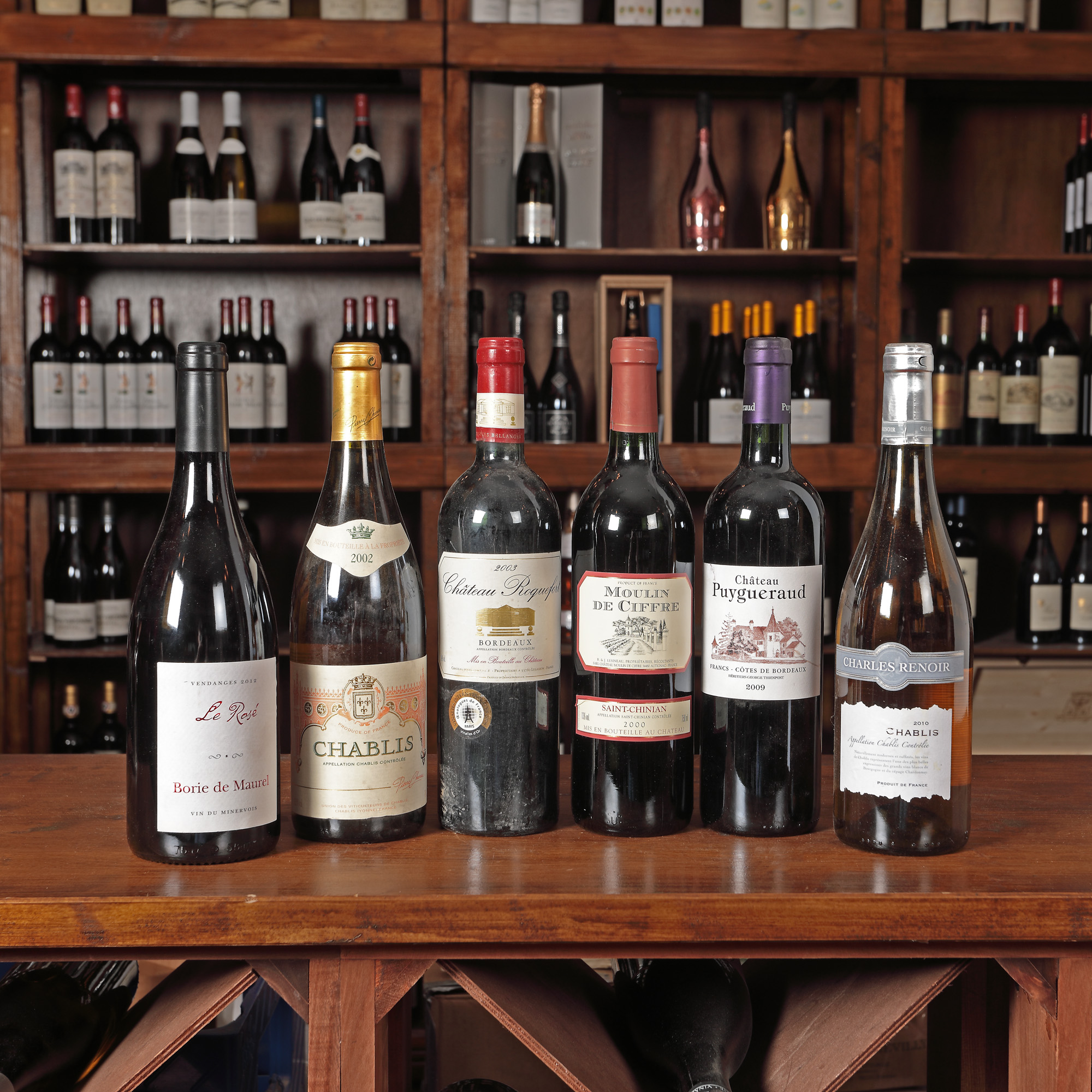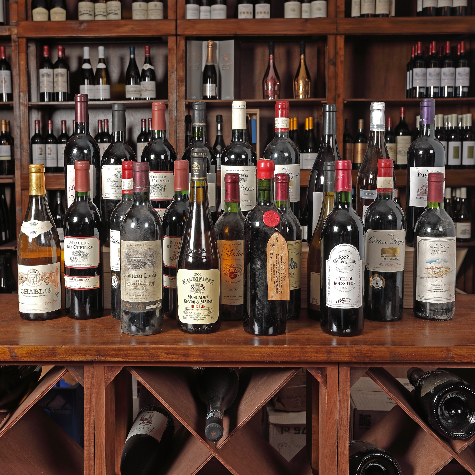 Château Puygueraud, Côtes de Bordeaux, 2009 1st x 0,75l Moulin de Ciffre, Saint-Chinian, AOC, 2000, 3st x 0,75l Cellier de Merinville, Minervois, AOC, 2000, 1st x 0,75l Château Roquefort, Bordeaux, AOC, 2003, 2Cst x 0,75l Château Saint Jaques Calon, Cuvee Grand Reserve, Montagne Saint-Emillion, 2012, 1st x 0,75l Domaine du Roc, Minervois, AOC, 2000, 1st x 0,75l Domaine Tour Trencavel, Minervois, 2001, 1st x 0,75l Charles Renoir, Chablis, AOC, 2010, 1st x 0,75l Reserve La Croix Beaucourt, Medoc, 2007, 1st x 0,75l Roc du Gouverneur, Côtes du Roussillion, 2004, 1st x 0,75l Château Lardit, Côtes de Castillon, 2003, 1st x 0,75l Medoc, AOC, 2004, 1st x 0,75l Vendanges, Le Rose, Boire de Maurel, Minervois, 2012, 1st x 0,75l Chablis, AOC, 2002, 1st x 0,75l L'aubinière, Muscadet Sèvre & Maine, Sur Lie, 2003, 1st x 0,75l Saint Mont, Plaimont, 2010, 1st x 0,75l La Jouchère, Chablis, 2004, 1st x 0,75l Vin de Pays de l'Hérault, 2007, 1st x 0,75l