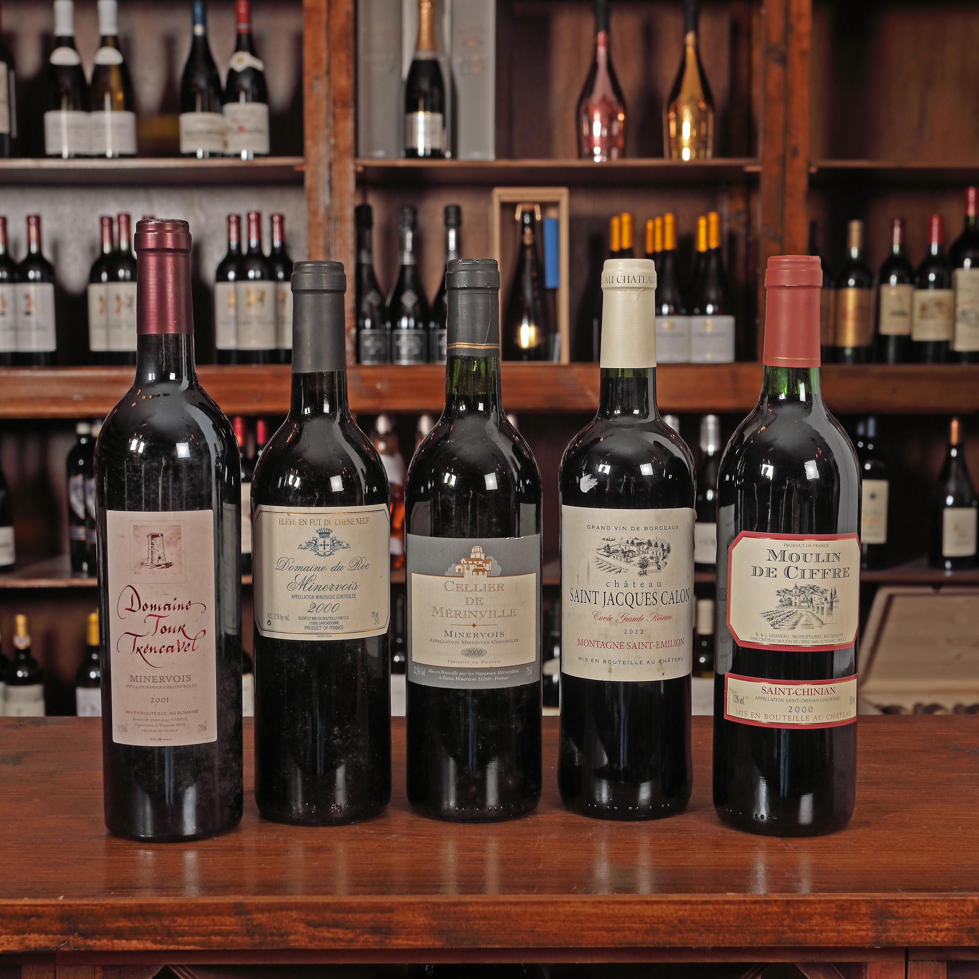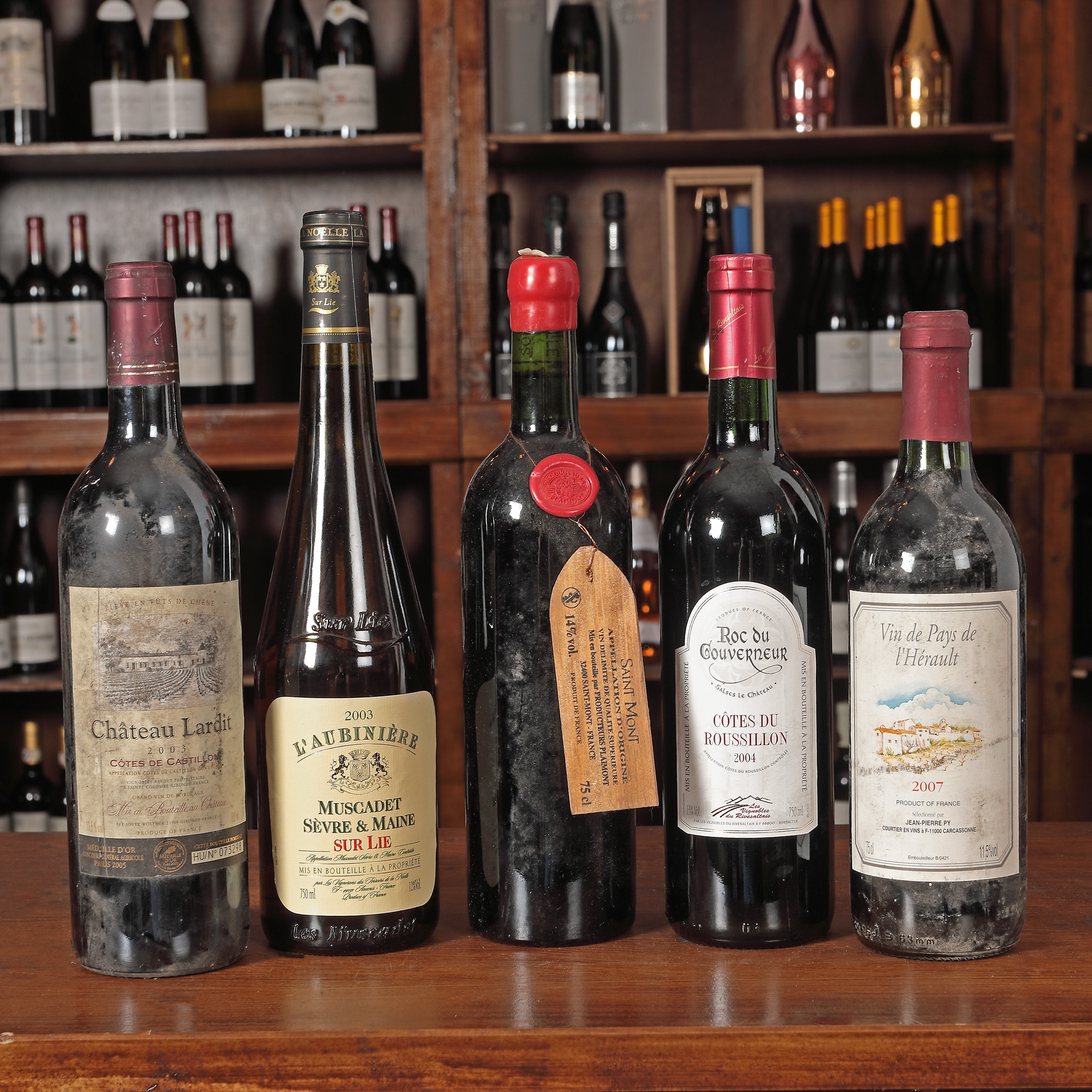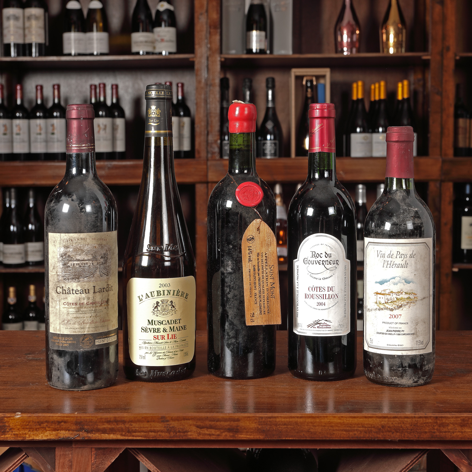 Château Puygueraud, Côtes de Bordeaux, 2009 1st x 0,75l Moulin de Ciffre, Saint-Chinian, AOC, 2000, 3st x 0,75l Cellier de Merinville, Minervois, AOC, 2000, 1st x 0,75l Château Roquefort, Bordeaux, AOC, 2003, 2Cst x 0,75l Château Saint Jaques Calon, Cuvee Grand Reserve, Montagne Saint-Emillion, 2012, 1st x 0,75l Domaine du Roc, Minervois, AOC, 2000, 1st x 0,75l Domaine Tour Trencavel, Minervois, 2001, 1st x 0,75l Charles Renoir, Chablis, AOC, 2010, 1st x 0,75l Reserve La Croix Beaucourt, Medoc, 2007, 1st x 0,75l Roc du Gouverneur, Côtes du Roussillion, 2004, 1st x 0,75l Château Lardit, Côtes de Castillon, 2003, 1st x 0,75l Medoc, AOC, 2004, 1st x 0,75l Vendanges, Le Rose, Boire de Maurel, Minervois, 2012, 1st x 0,75l Chablis, AOC, 2002, 1st x 0,75l L'aubinière, Muscadet Sèvre & Maine, Sur Lie, 2003, 1st x 0,75l Saint Mont, Plaimont, 2010, 1st x 0,75l La Jouchère, Chablis, 2004, 1st x 0,75l Vin de Pays de l'Hérault, 2007, 1st x 0,75l