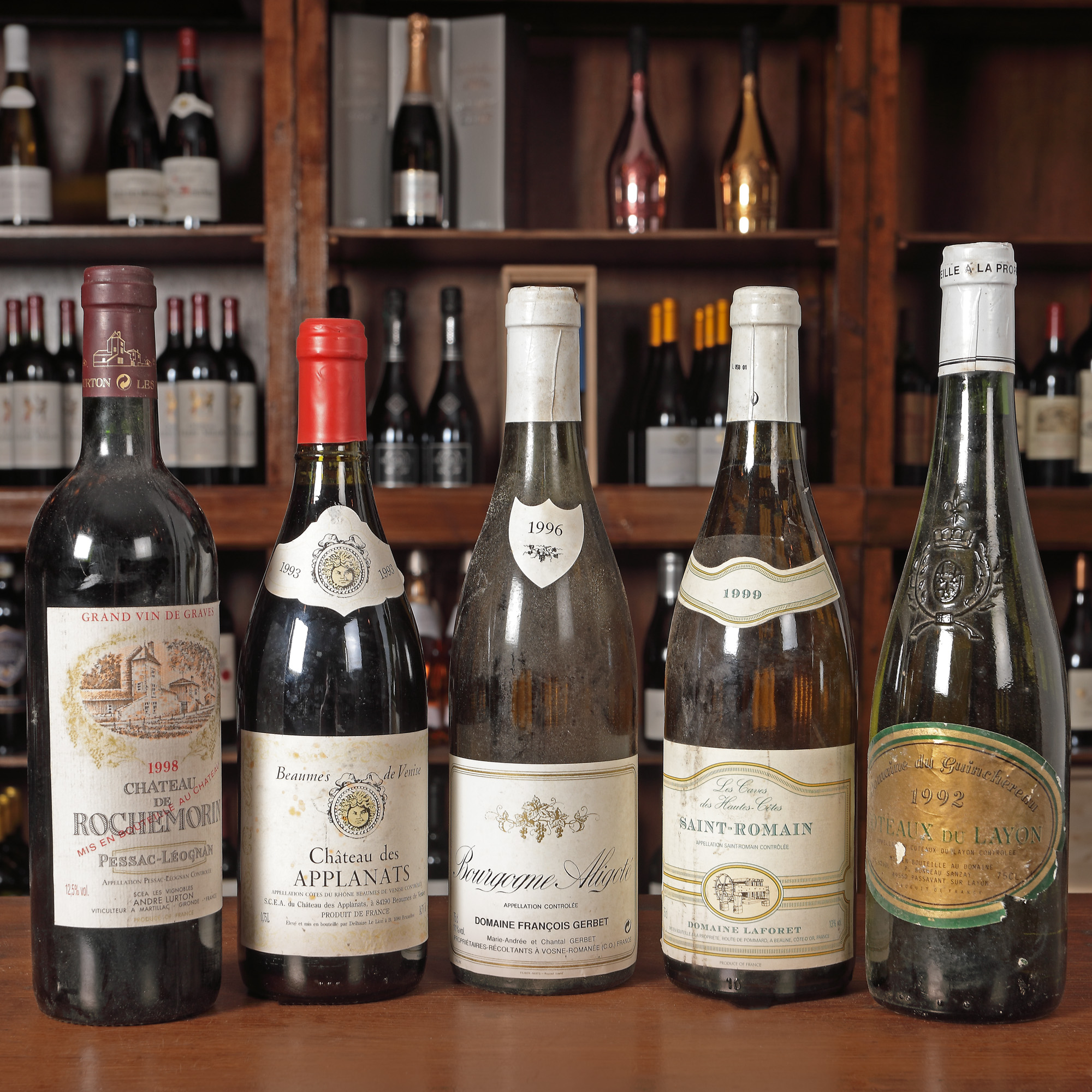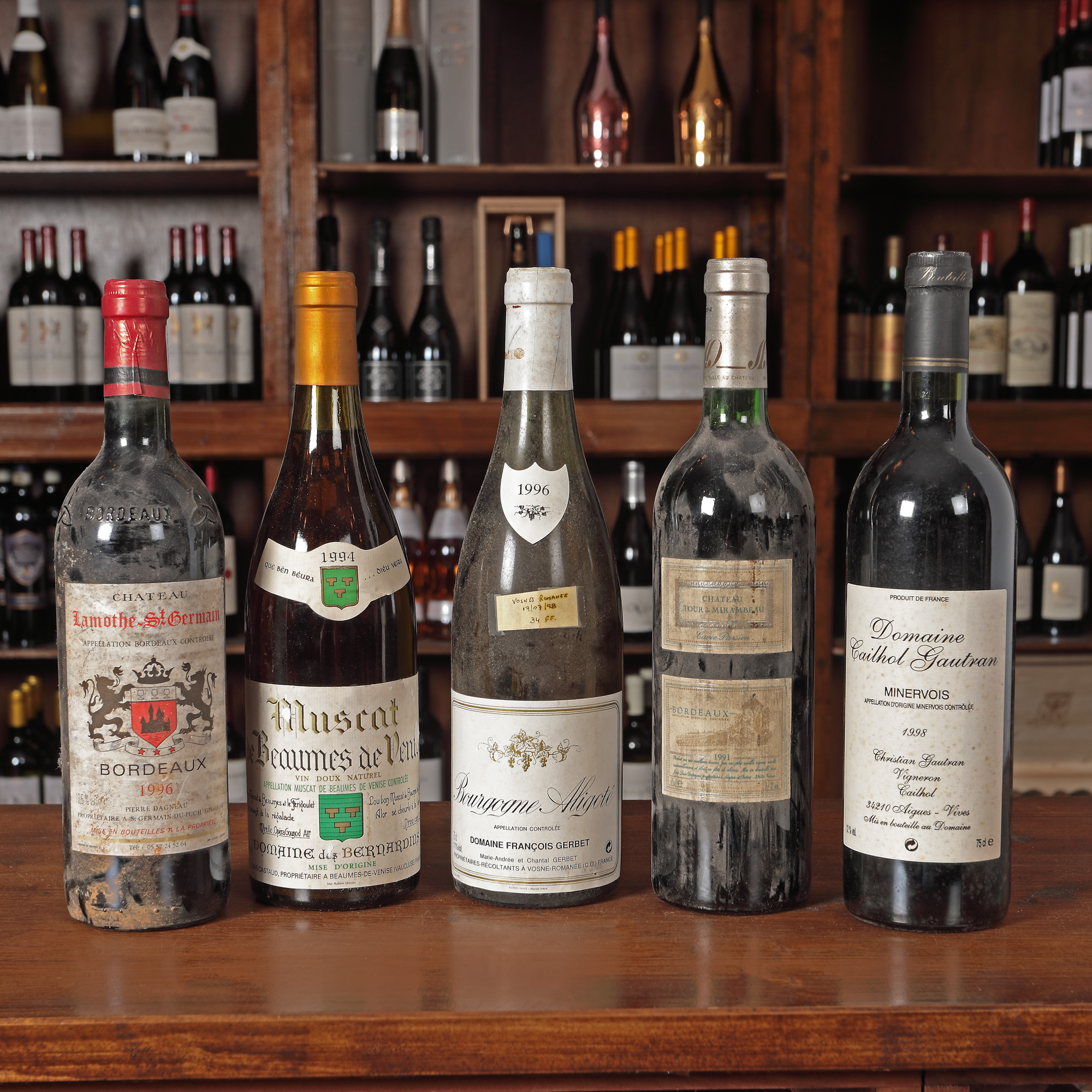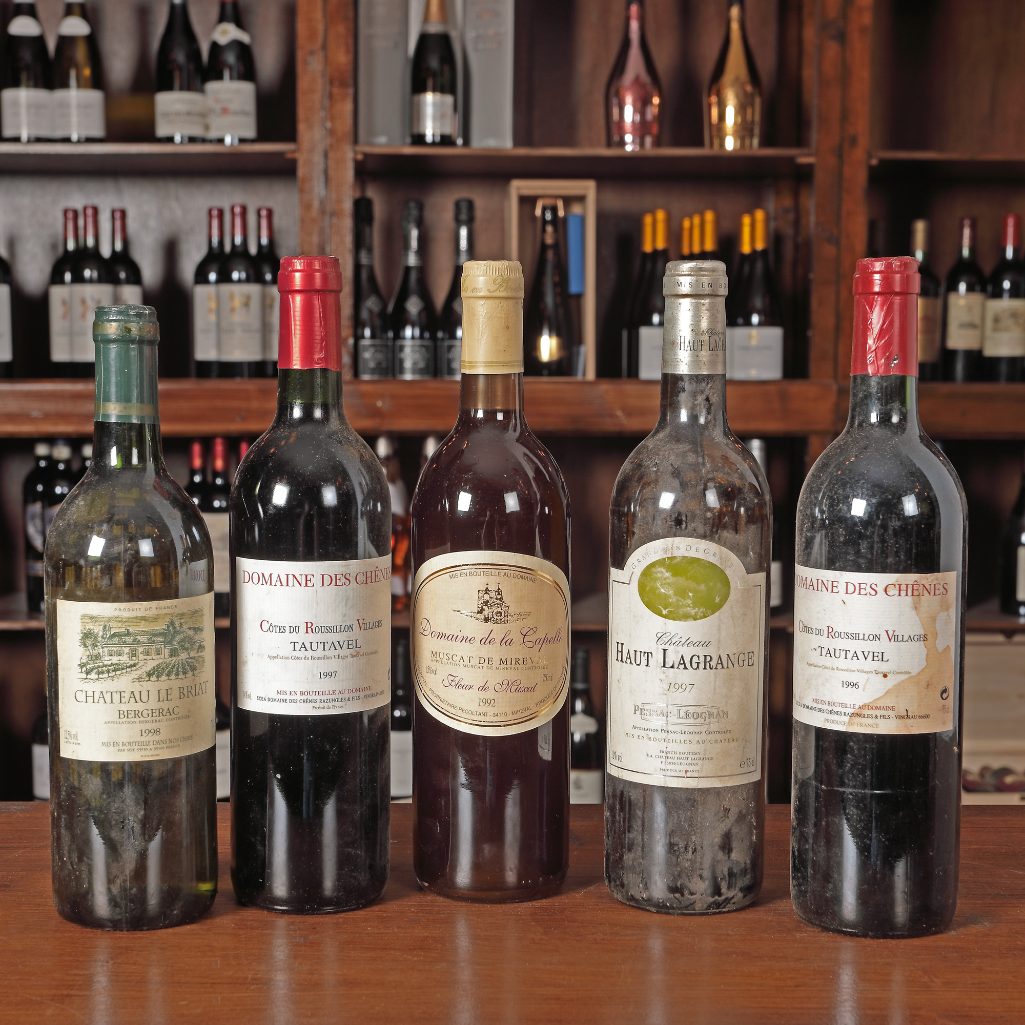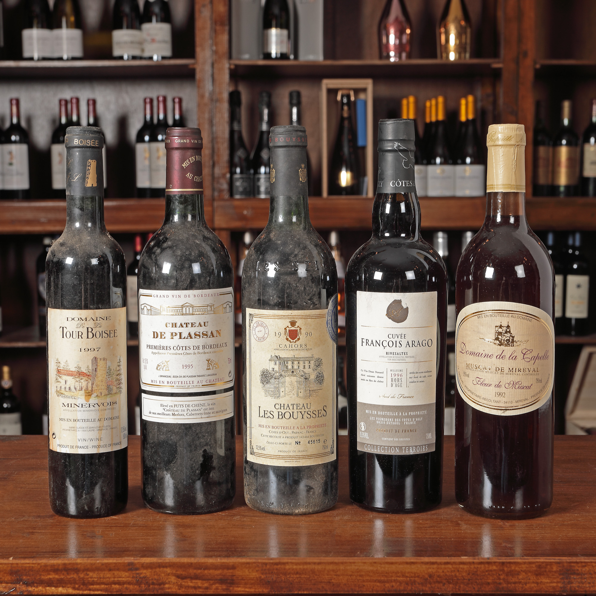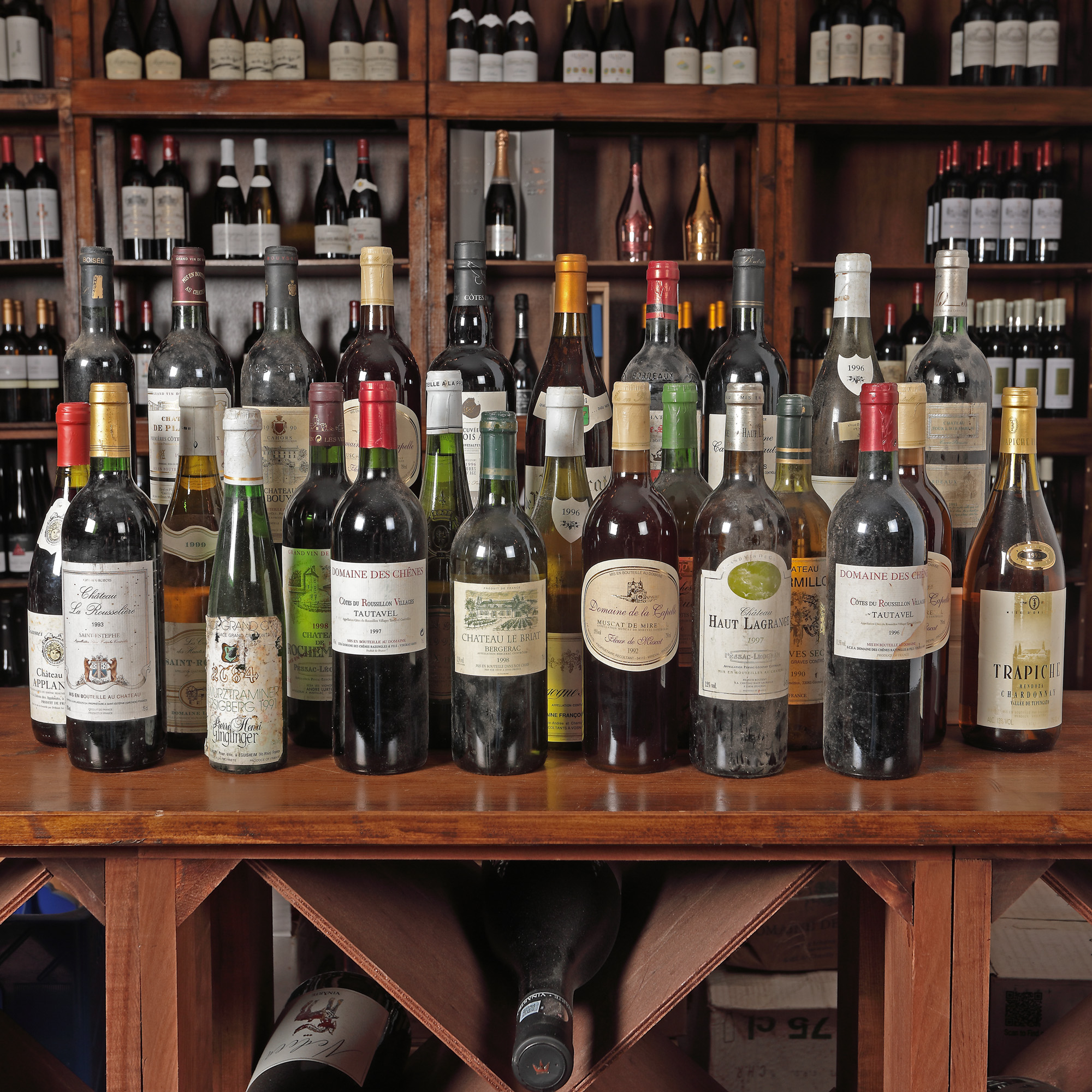 Château Les Boysses, Chaors AOC, 1990 1st x 0,75l Domaine Cailhol Gautran, Minervois, 1998, 1st x 0,75l Muscat de Beaumes de Venise, 1994, 1st x 0,75l Château Lamothe, St. Germain, Bordeaux, 1996, 1st x 0,75l Alsace Grand Cru, Gewurztraminer Pferisiberg, 1991, 1st x 0,375l Château Le Briat, Bergerac, AOC, 1998, 1stx75l Domaine de la Capelle, Muscat de Mireval, 1992, 3st x 0,75l Domaine de Chênes, Côte de Roussillion Villages, Tautavel, 1997, 2st x 0,75l Duchesse de Cutiac, Côte de Blaye, 1996, 1st x 0,75l Château Tour de Mirambeau, Cuvee Passion, Bordeaux, 1991, 1st x 075l Château de Plassan, Premiere Côtes de Bordeaux, 1995, 1st x 0,75l Domaine du Guinchereau, Coteaux du Layon, AOC, 1992, 1st x 0,75l Château Haute, La Grange, Pessac-Leognan, 1997, 1st x 0,75l Château de Rochemorin, Pessac-Leognan, 1998, 1st x 0,75l Château des Applants, 1993, 1st x 0,75l Saint Romaine, Domain la Foret, 1999, 1st x 0,75l Château Tour Millot, Graves AOC, 1990, 1st x 0,75l Domaine Francois Gerbet, Bourgone Aligote, AOC, 1996, 2st x 0,75l Château La Rousseliere, Saint-Esthephe, AOC, 1993, 1st x 0,75l Cuvee Francois Arago, Rivesaltes, AOC, 1996, 1st x 0,75l Domaine De La Tour Boisee, Minervois, 1997, 1st x 0,5l