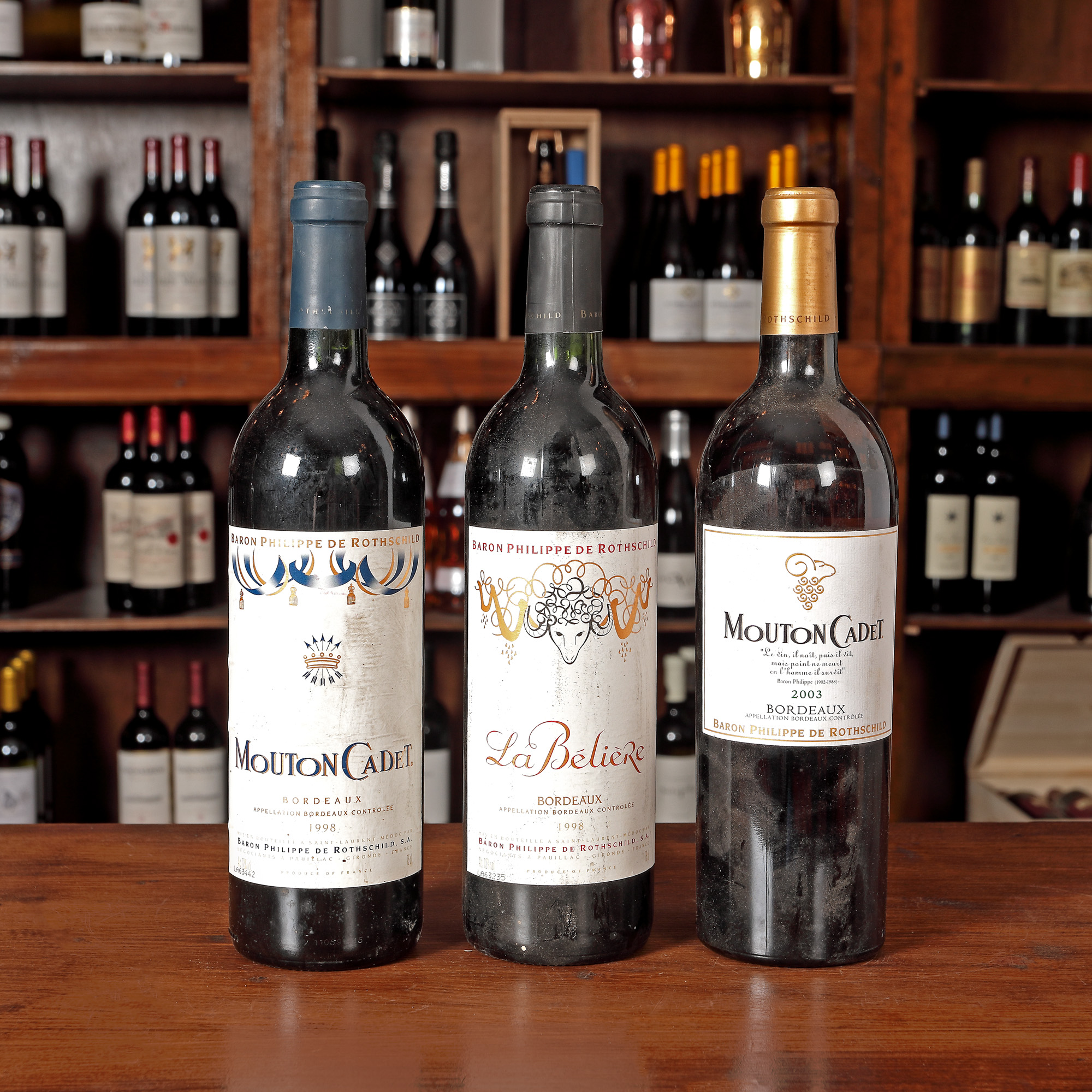 Philippe de Rothschild, Mouton Cadet Blanc, AOC Bordeaux, 2003, 1st x 0,75l Philippe de Rothschild, Mouton Cadet Rouge, AOC Bordeaux, 1998, 1st x 0,75l Philippe de Rothschild, La Bélière Rouge, AOC Bordeaux, 1998, 1st x 0,75l
