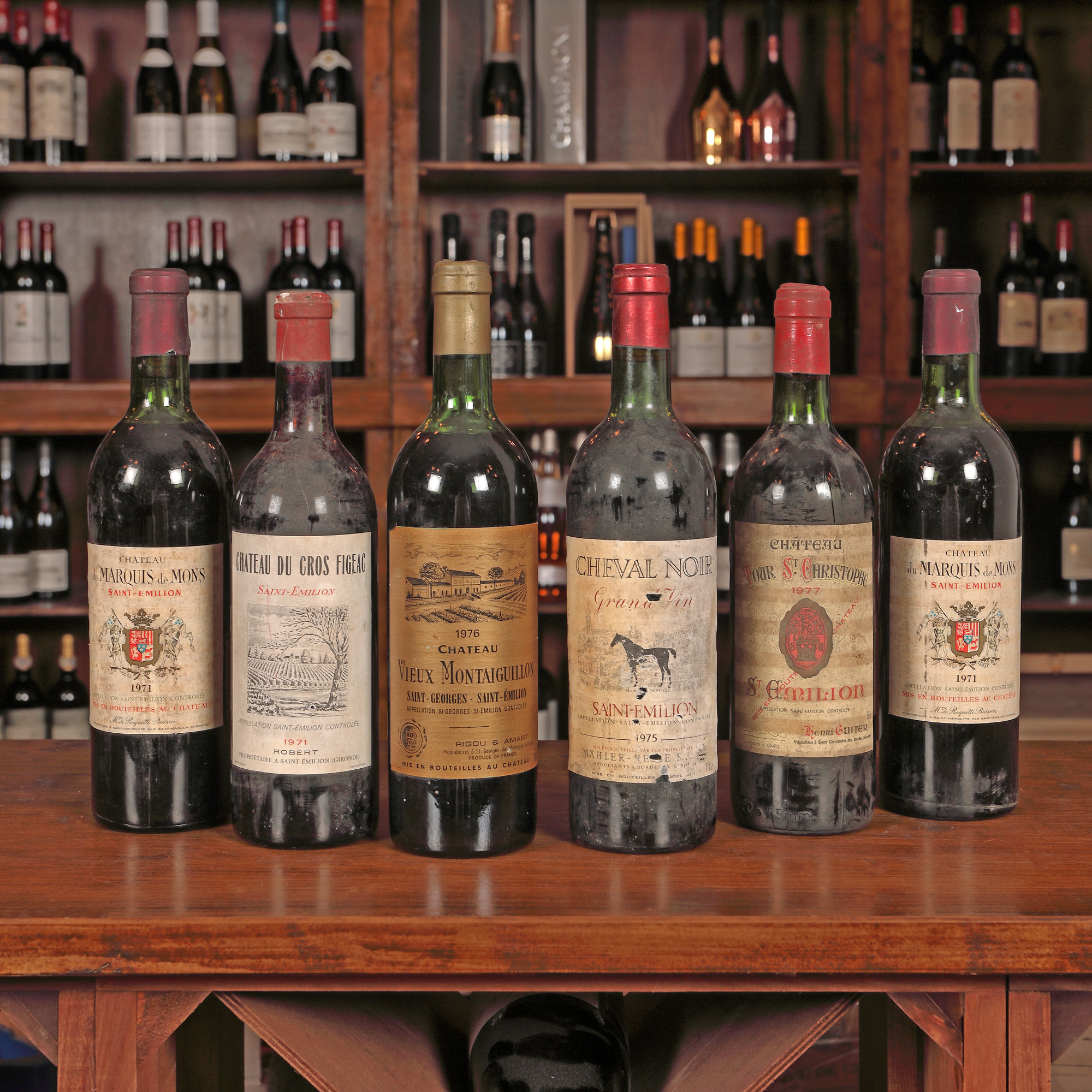 Château du Cros Figeac, Saint-Émilion, 1971, 1st x 0.75l Château Tour Saint Christophe, 1977, 1st x 0.75l Château du Marquis de Mons, Saint-Émilion, 1971, 2st x 0.75l Château Vieux Montaiguillon, Saint-Émilion, 1976, 1st x 0.75l Cheval Noir, Saint-Émilion, 1975, 1st x 0.73l