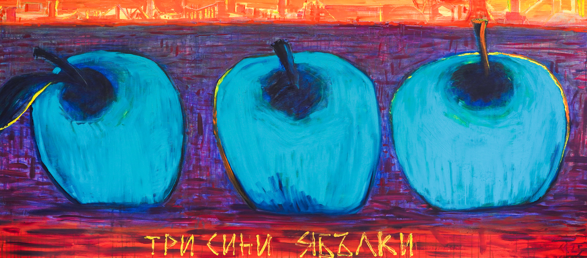 After periods of intense transformation in the field of nonconventional art forms, Svilen Stefanov returned to painting in the late 1990s. He is one of the most provocative and radical conceptual artists in Bulgaria. Svilen Stefanov creates a cold conceptual painting that uses expressionist means in a secondary way. His approach is both conceptual and classically painterly, because conceptualism is, above all, a way of thinking. Svilen Stefanov is a distinguished art historian and artist. He is well acquainted with the global history of art and strives to create a new kind of objectness connected to neo-expressionism—one that is neither avant-garde nor typically Bulgarian. This is a different type of alternative painting that emerged in the 1990s, developing in parallel with conceptual strategies and forming part of them. It is not a rejection of conceptualism but rather its continuation. The artist creates conceptual painting with classical means, since conceptualism is a rational form of art, yet the sensuousness of the painterly surface reminds us of its material nature—and it is precisely this materiality that lies at the center of his interest. In contemporary art, the goal is not to discover something great, but to show how you interpret it. Svilen Stefanov is known for using conceptual strategies in painting—such as incorporating text into the image. This is not about giving the work a literary basis, but rather about introducing an idea. At first glance, the large, colorful inscriptions—often humorous, such as “I Love Capital,” “The Wolves Cross the Danube Ice,” or “Lesson in Geometric Abstraction”—are actually connected with cinema, art history, and music. The images accompanying the texts are not illustrations but rather a synthesis between image and text, with alternating dominance. In short—the texts do not explain the images, and the images are not illustrations of the texts. Everything is interwoven with irony, and it is difficult to find a direct, unambiguous meaning. The hidden meanings can be interpreted differently by each of us. In Stefanov’s canvases, reverse perspective becomes the correct way of seeing things. This inversion of focus gives a surreal psychological quality to inanimate objects—but not to people. Apples and watermelons become central subjects, charged with emotion and psychology. The tension within the stillness of the objects arises from the strong color values in some works. Stefanov builds his paintings through rich imprimaturas and velaturas, slowly and skillfully layering thin, transparent tones like translucent veils. The “oily” effect of oil paint is absent—only the inscriptions feature thick, pastose application. In some works, wide panoramic landscapes host numerous small, faceless figures engaged in absurd processions, funerals, hangings, or the welcoming of aliens. Svilen Stefanov achieves absurdism in painting through conceptual means such as shifting emphasis from people to objects, elevating materiality to primary meaning, and “portraying” objects—like a large leek, two watermelons, or bananas. His painting is marked by intelligence, humor, and a total lack of pretension. He possesses the ability to turn great themes into everyday ones, and vice versa—but always with a smile. His characteristic elongated formats encourage horizontal development, while compositions built from two objects imply symmetry. Svilen Stefanov steps beyond the academic reflex to seek the golden ratio, a central axis, or the classic three-object composition. He is unafraid of mirror symmetry and works between the beats. Mastering large formats is not an easy task for every painter, but for Stefanov, it is routine. The absence of a frame is a conceptual choice—the framing of an artwork in a golden border separating it from the world holds no interest for him. The lack of a frame and the use of large formats recall American art of the 20th century. (S.N.)