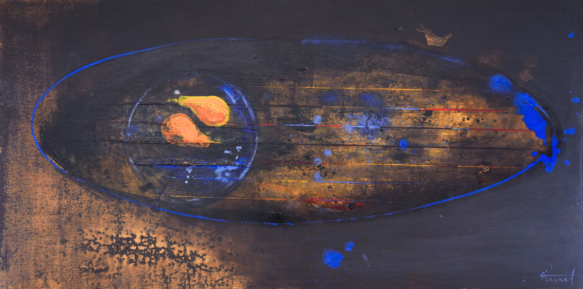 signed on the back, in black, „Два жълти обекта I, Светозар Бенчев, 2024-2025“