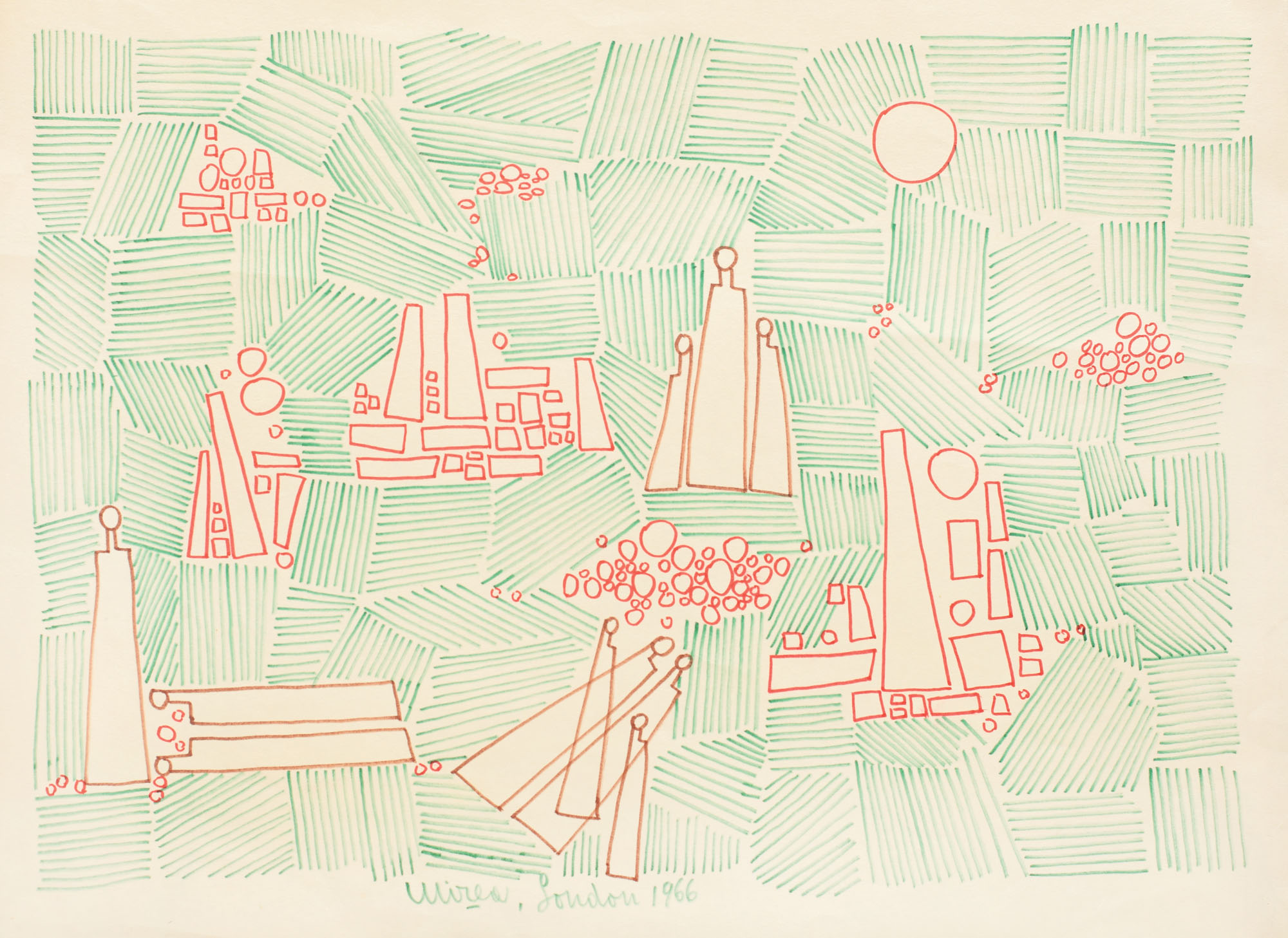 signed, located and dated centrally down, in green, Mirea, London, 1966