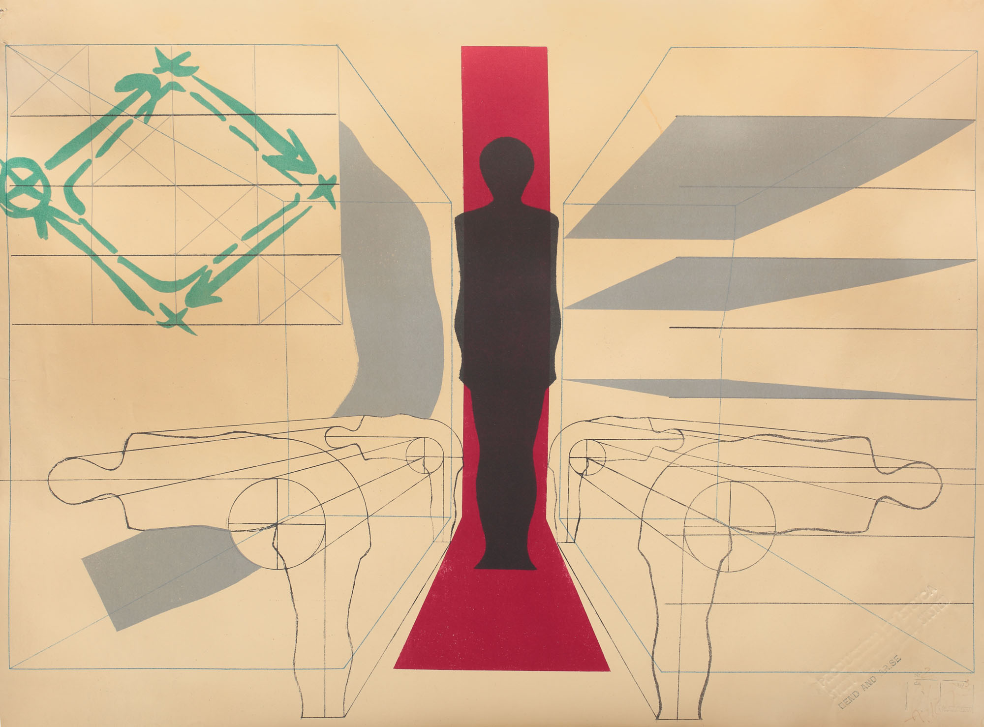 signed, dated and numbered bottom right, in brown, R. Stoica, 1973, nr. 2; stamped bottom right, PRODUCTION BY STOICA, "STUDY OF THE NEW SYSTEM"