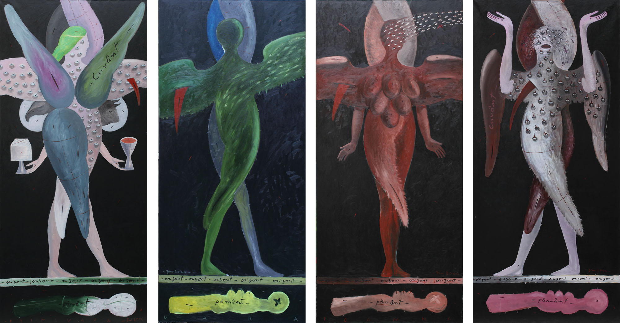 1 - signed bottom right, in red, zm, 2004 2 - signed and dated bottom right, in red, titled centrally down, in red, zm, 2004, "PRIMĂVARA" 3 - signed and dated bottom left, in green, titled centrally down, in green, zm, 2004, "VARA" 4 - signed and dated bo