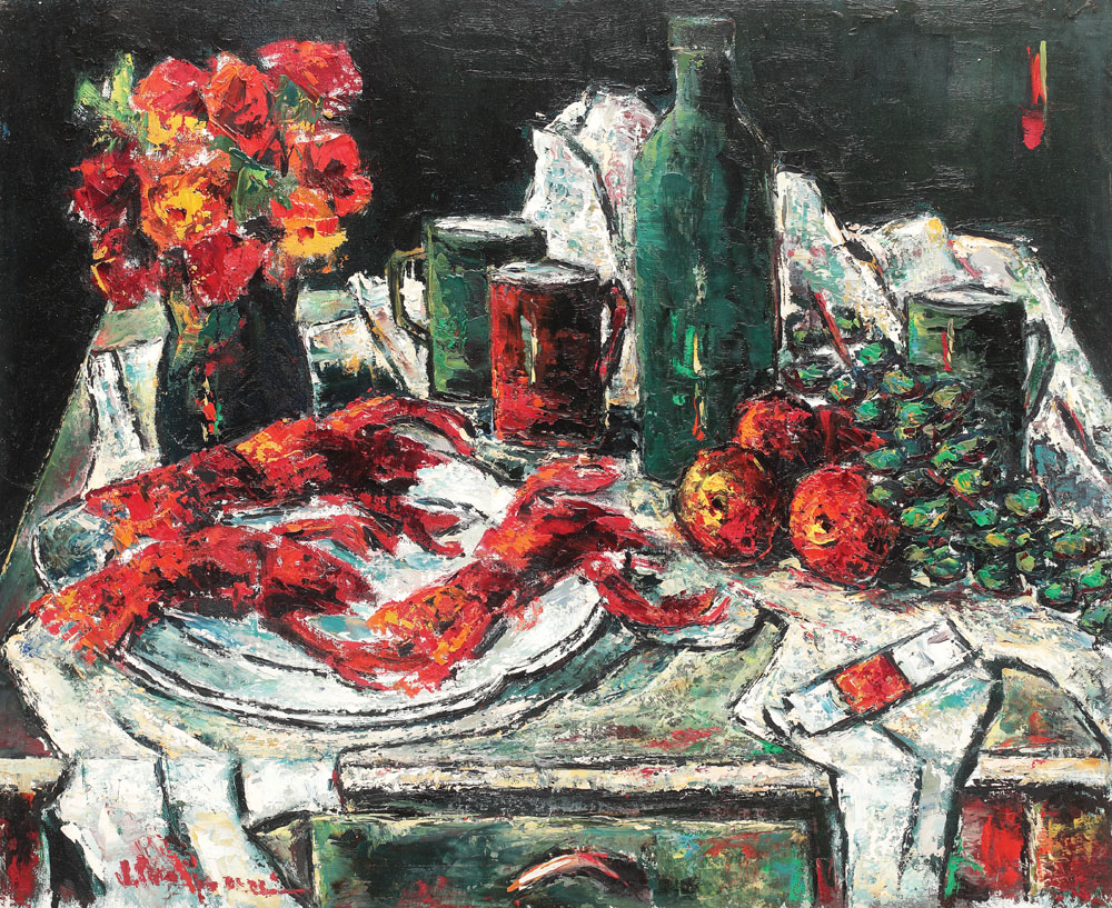 Signed, dated and dedicated on the back: "Natură statică cu flori, fructe şi raci, o port în mine de câteva luni; am văzut obiectele în zeci de feluri; am făcut zeci de schiţe; am trecut la ulei; a ieşit ceva material; nu pot spune că îmi place, nici că nu. Terminat după două luni. V. Parizescu, ianuarie 1988".