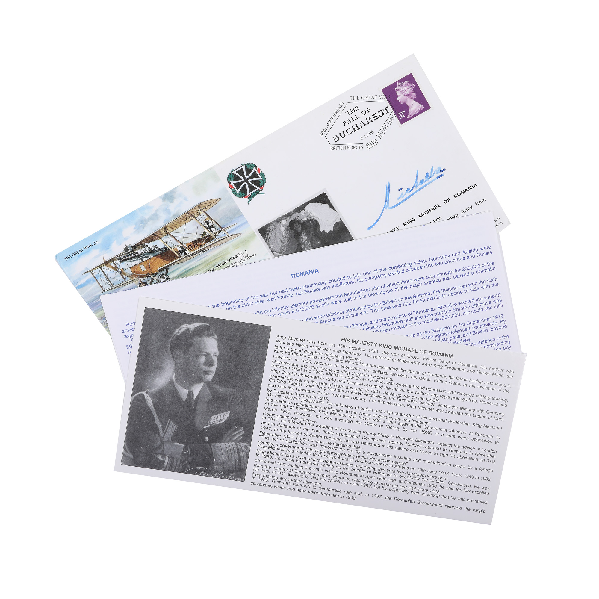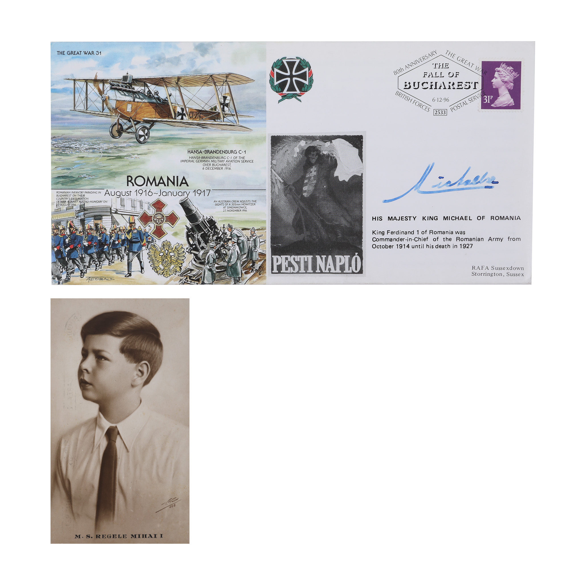 90. Regele Mihai, lot format din carte poștală și plic Prima zi ”România în Primul Război Mondial”, cu semnătura olografă a regelui Mihai