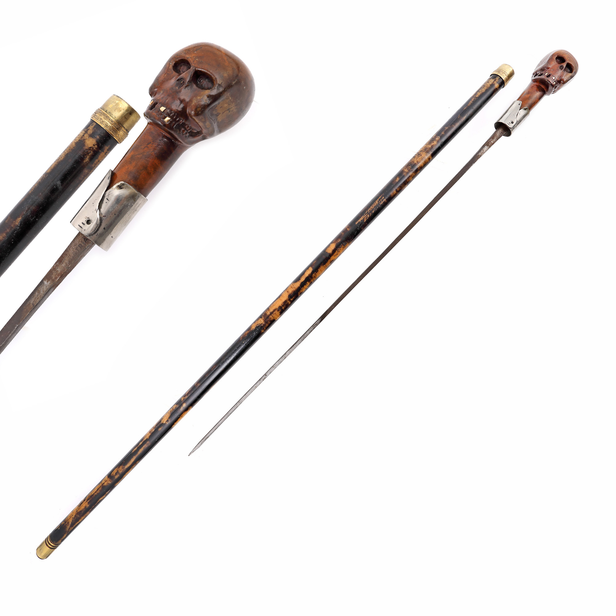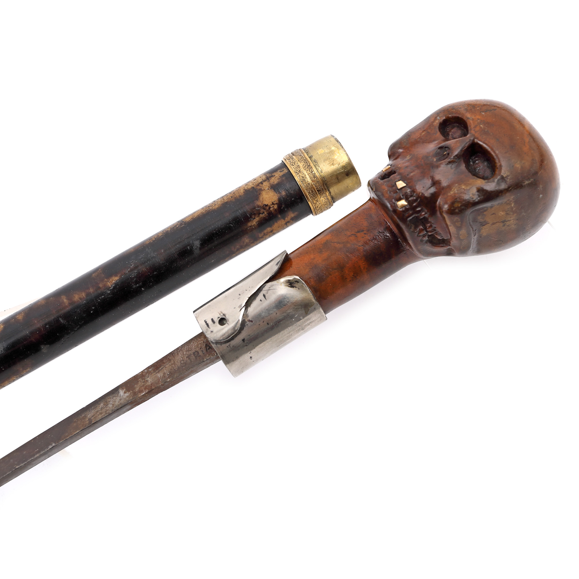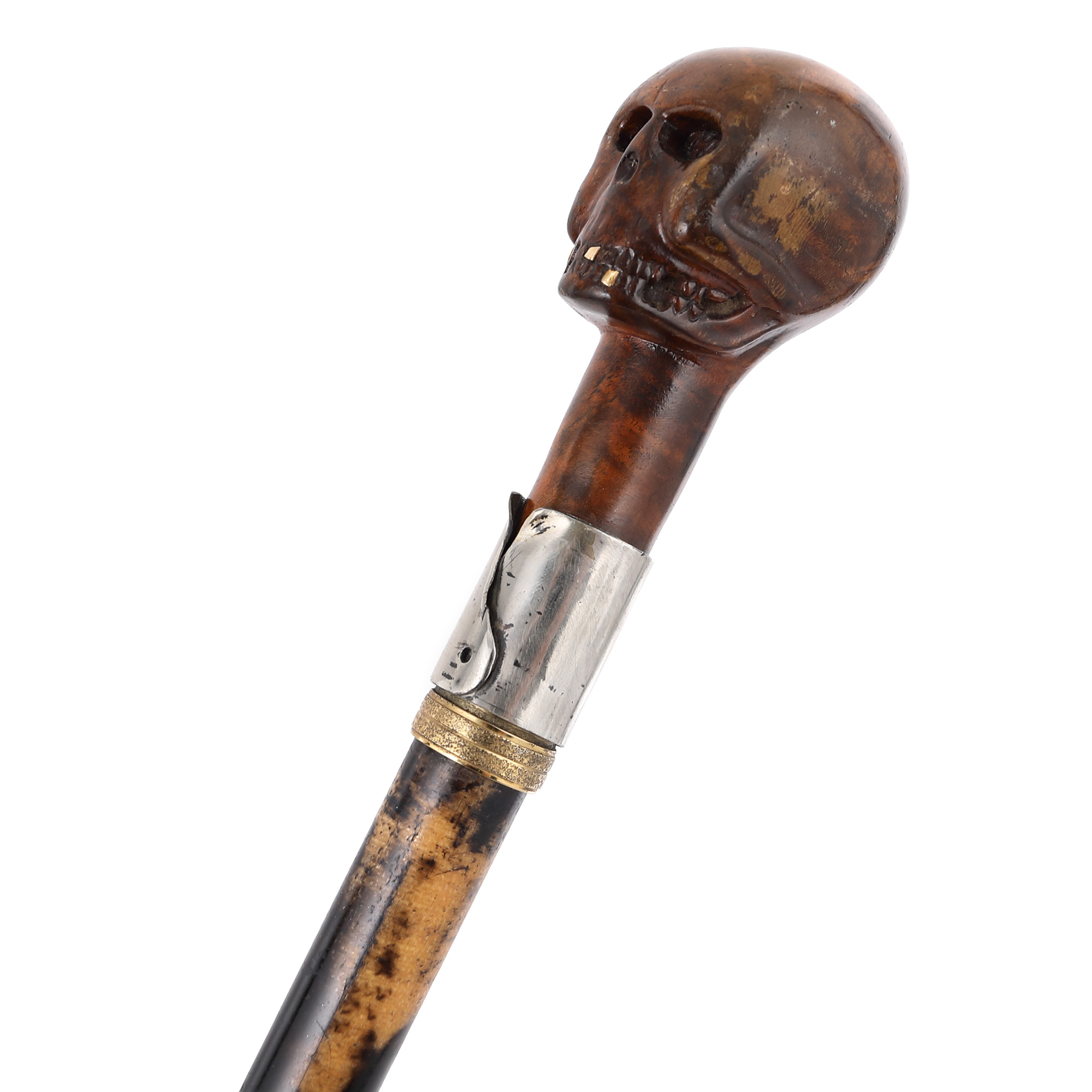 89. Baston cu stilet, decorat cu mâner din lemn sculptat în forma unui craniu inedit cu dinți din aur