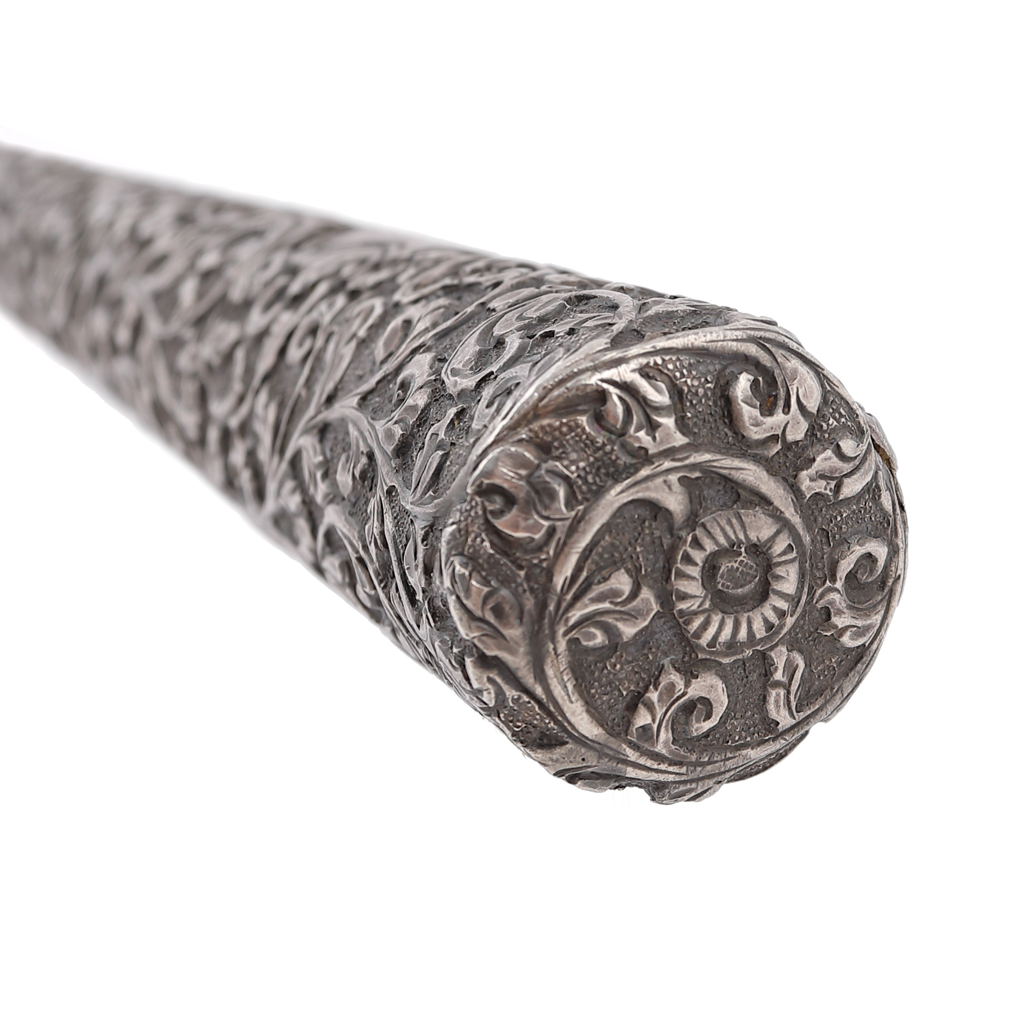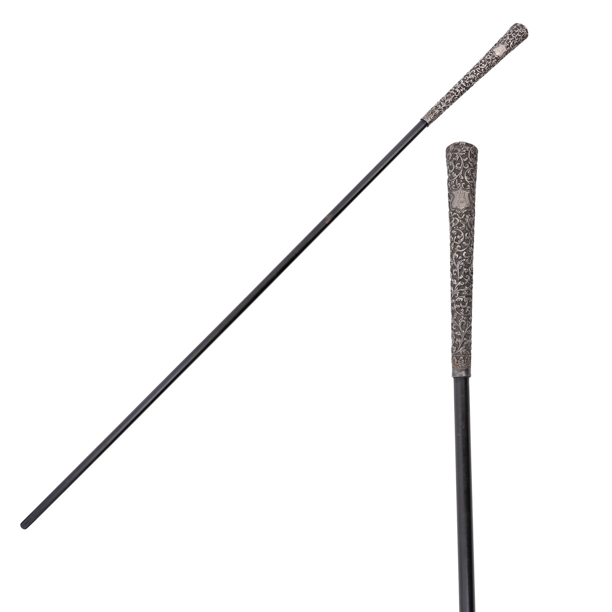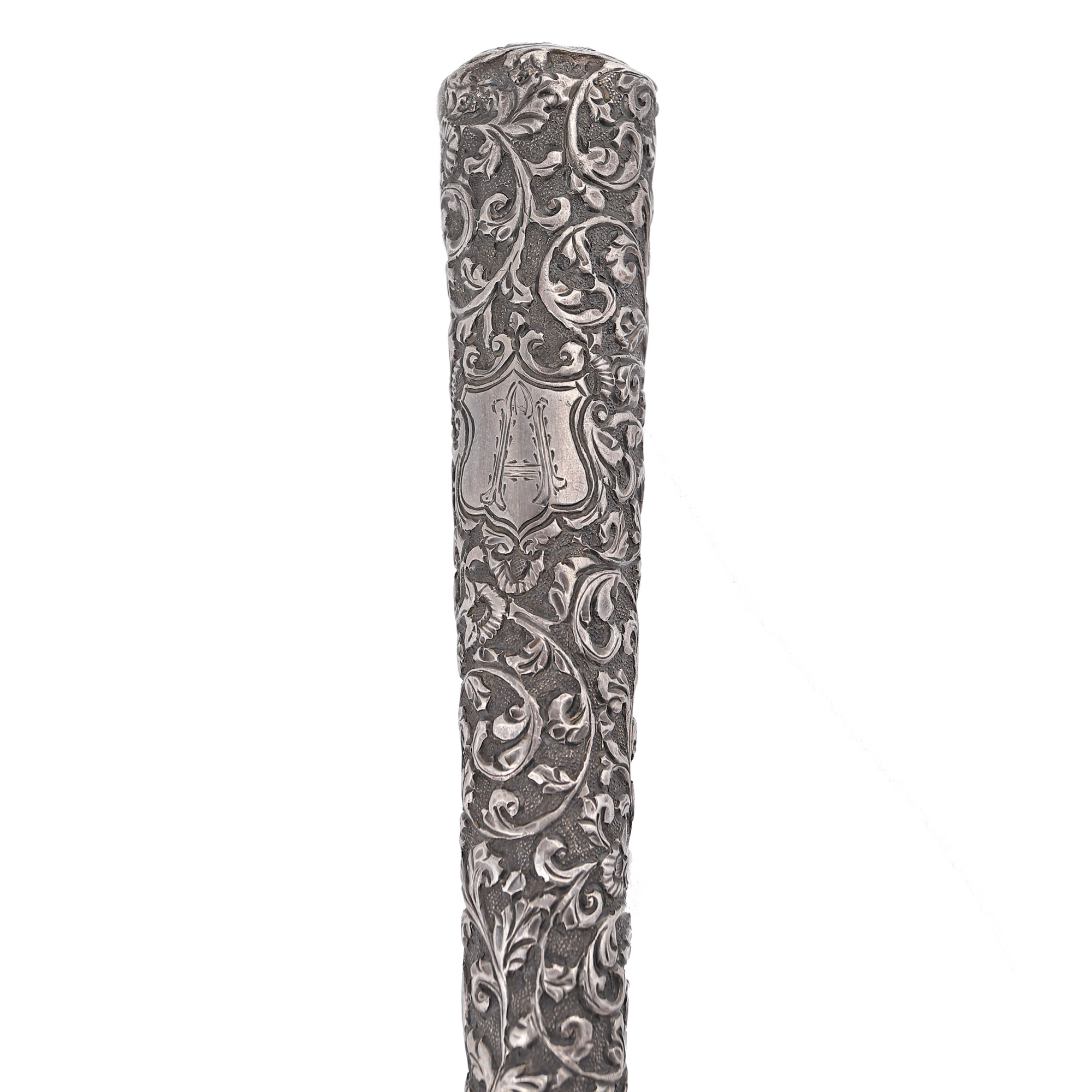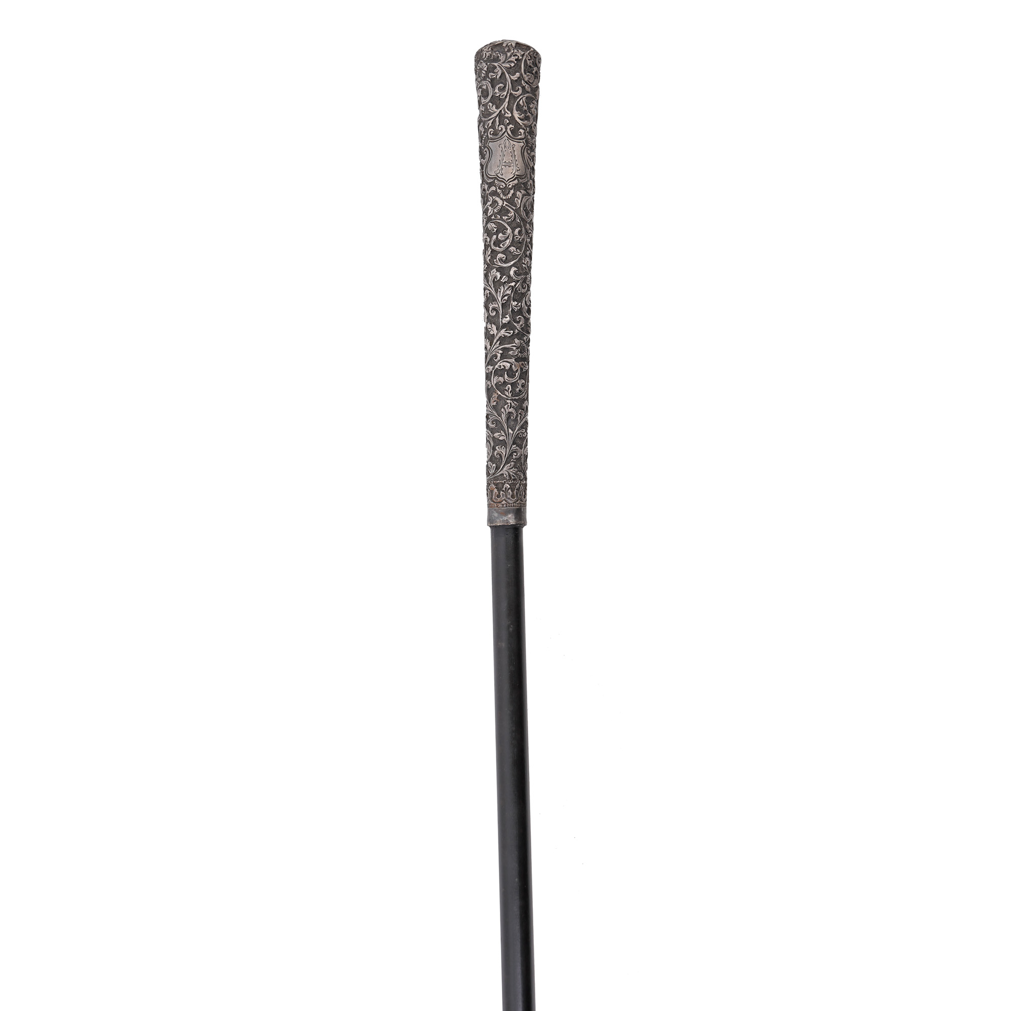 98. Baston din lemn, cu mâner din argint decorat cu vrejuri vegetale, inscripționat cu monograma ”A”