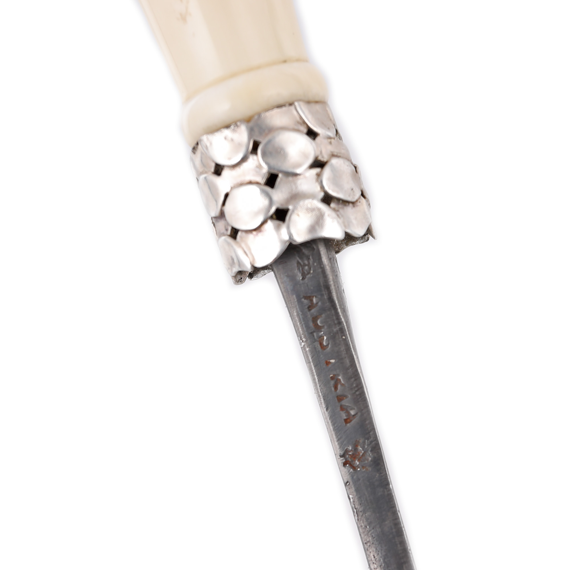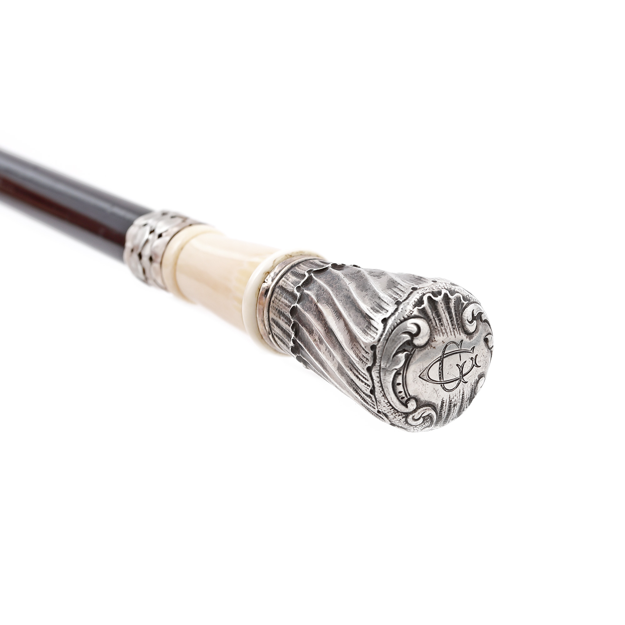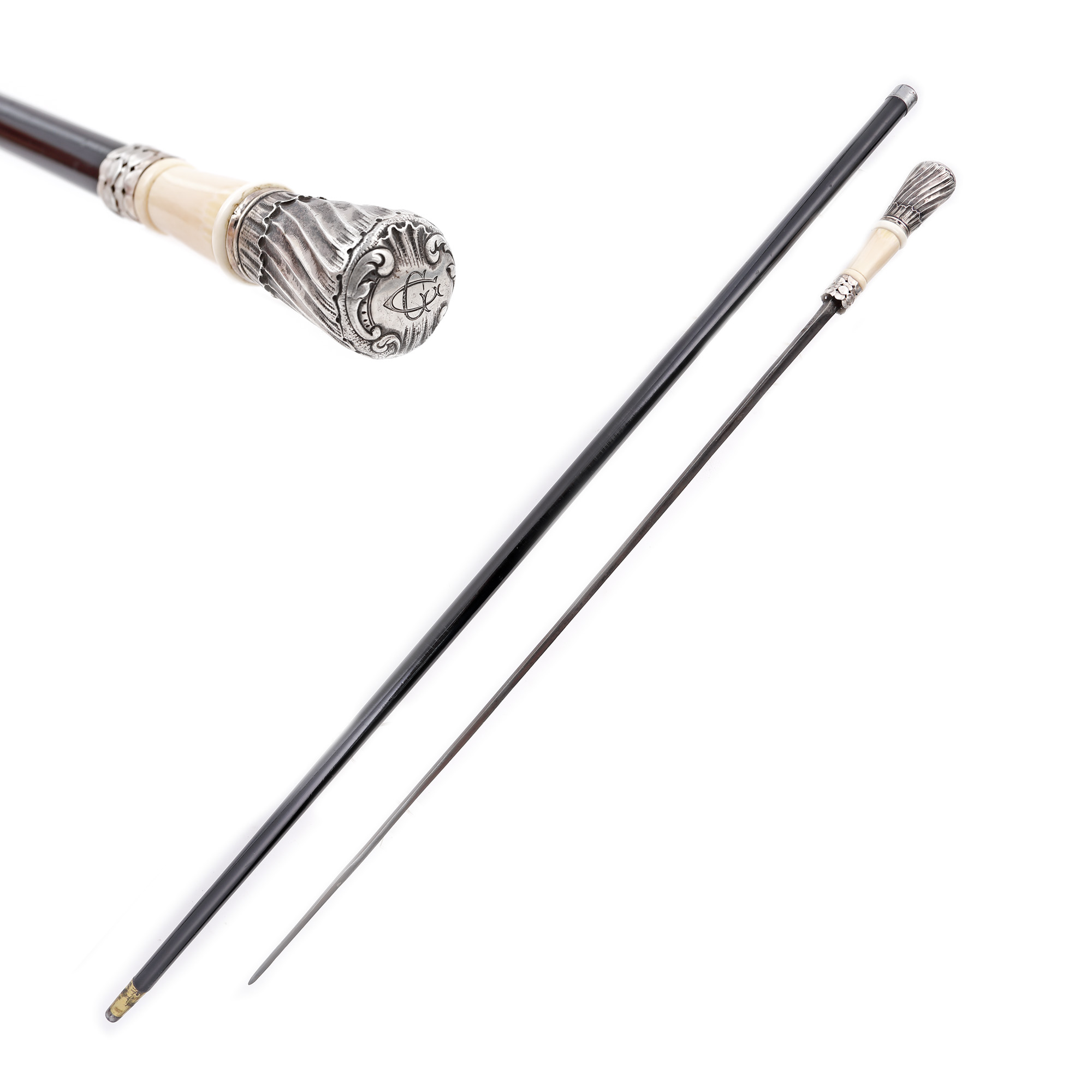 96. Baston din lemn, cu stilet, cu mâner din argint și fildeș, prima jumătate a sec. XX