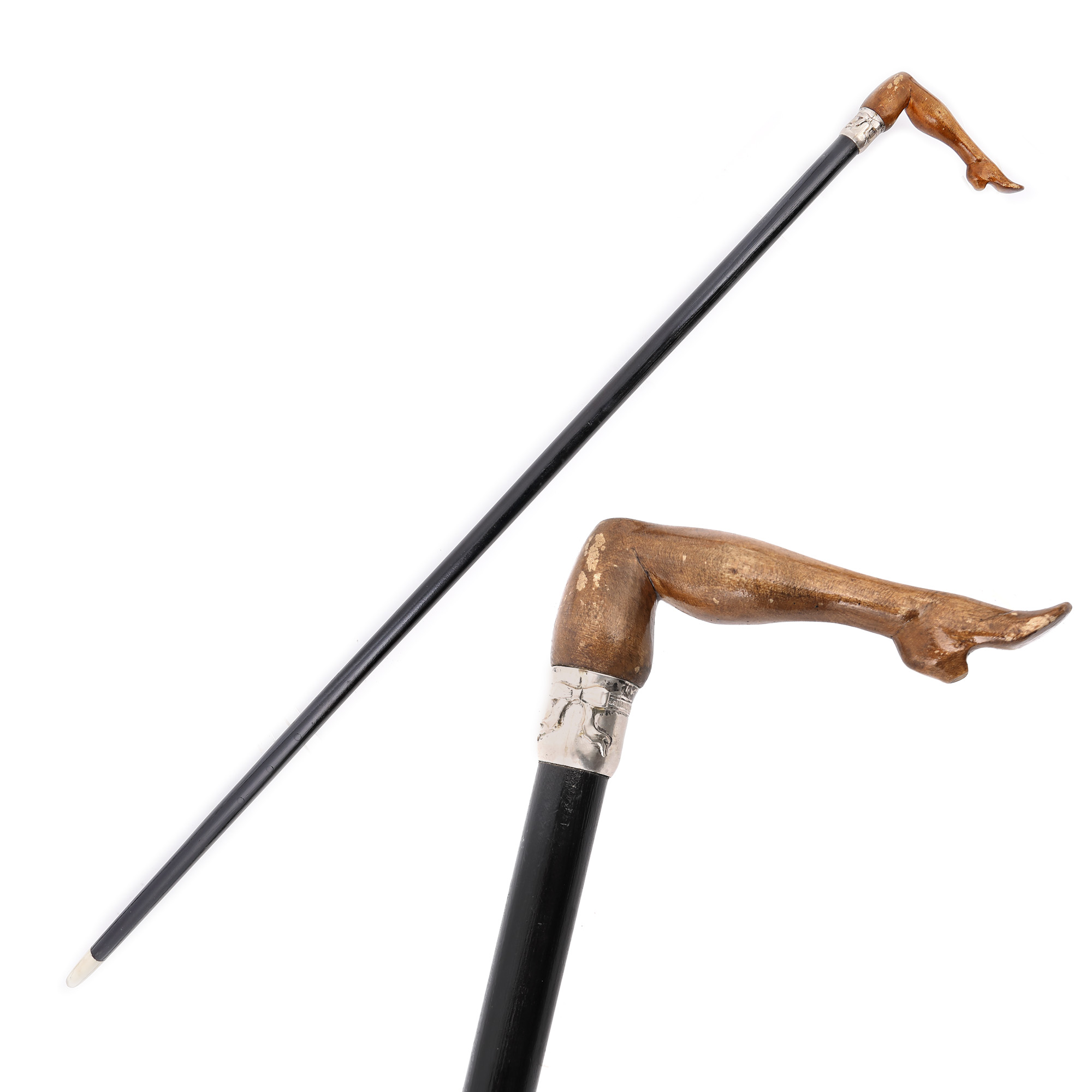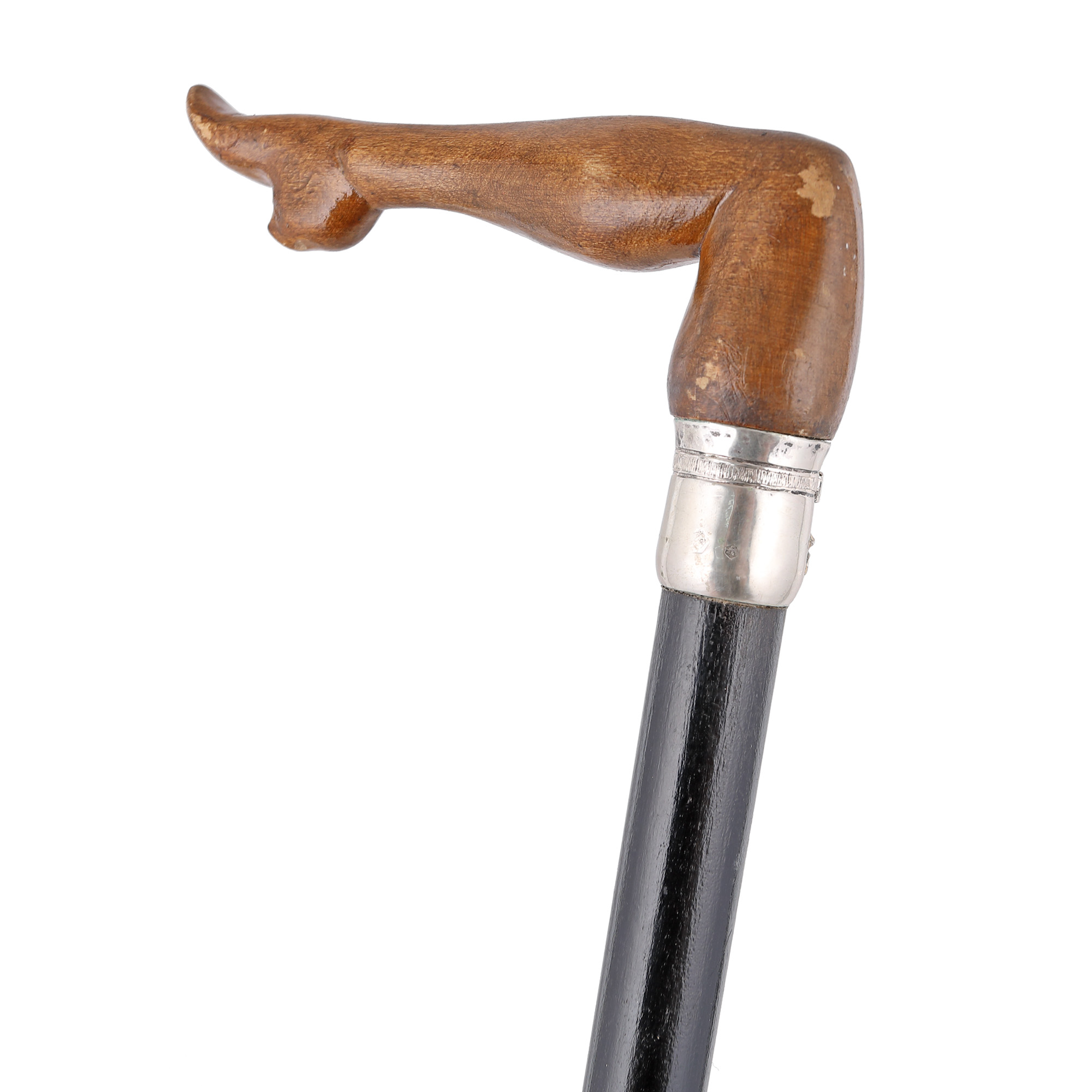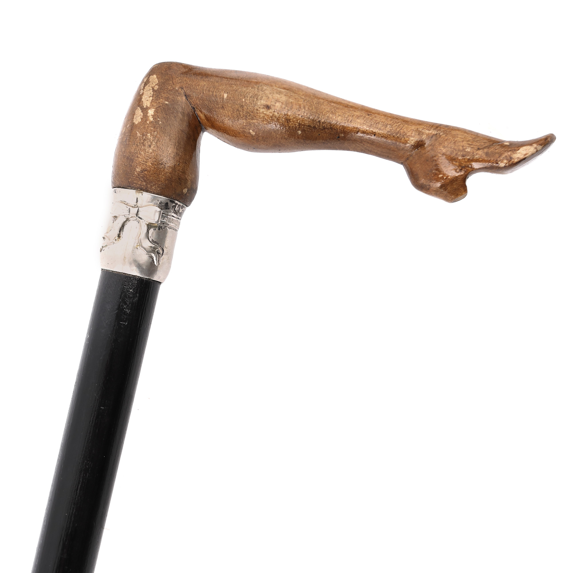 92. Baston din lemn,cu manșon din argint, cu mâner în forma unui picior de domnișoară, sfârșitul sec. XIX