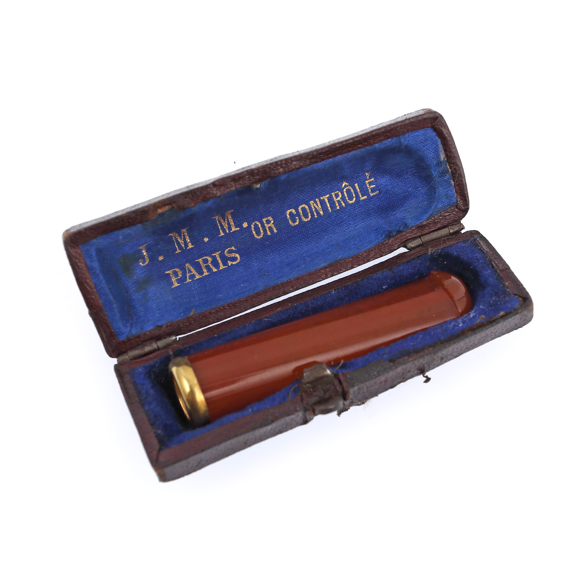 125. Port-țigaret din chihlimbar, cu anou din aur, însoțit de etui original, prima jumătate a sec. XX
