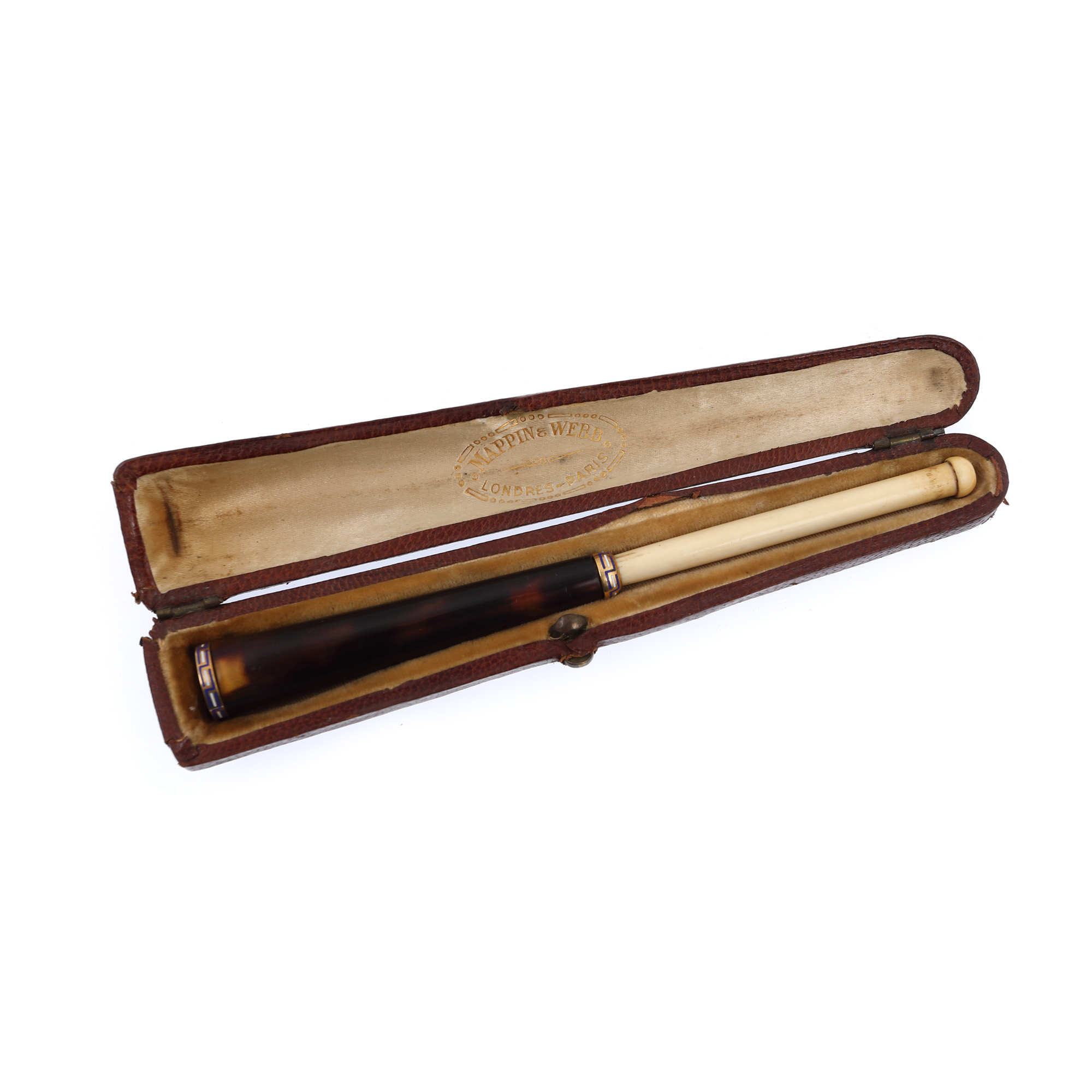 130. Port-țigaret din chihlimbar și fildeș, cu inele din aur, în cutie originală