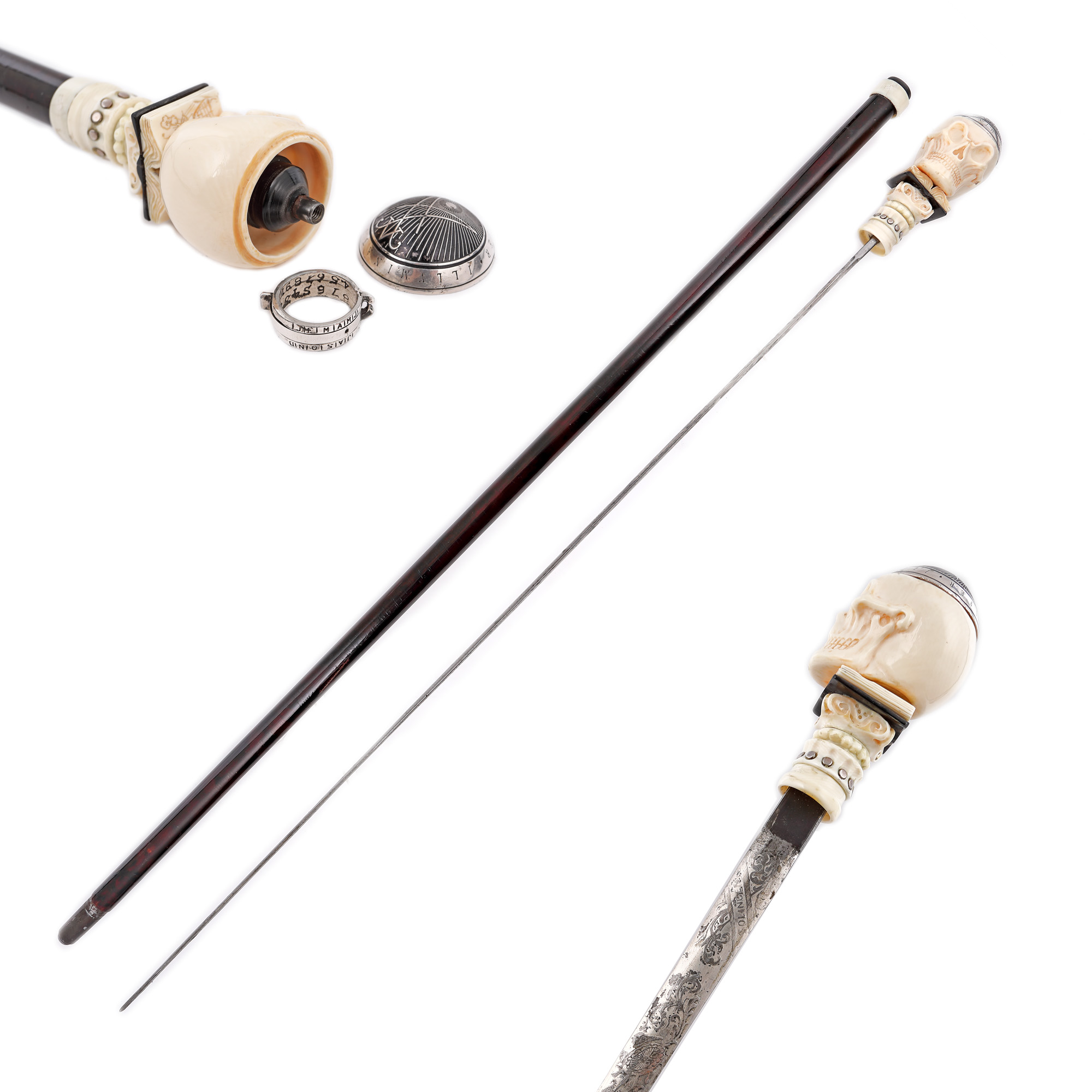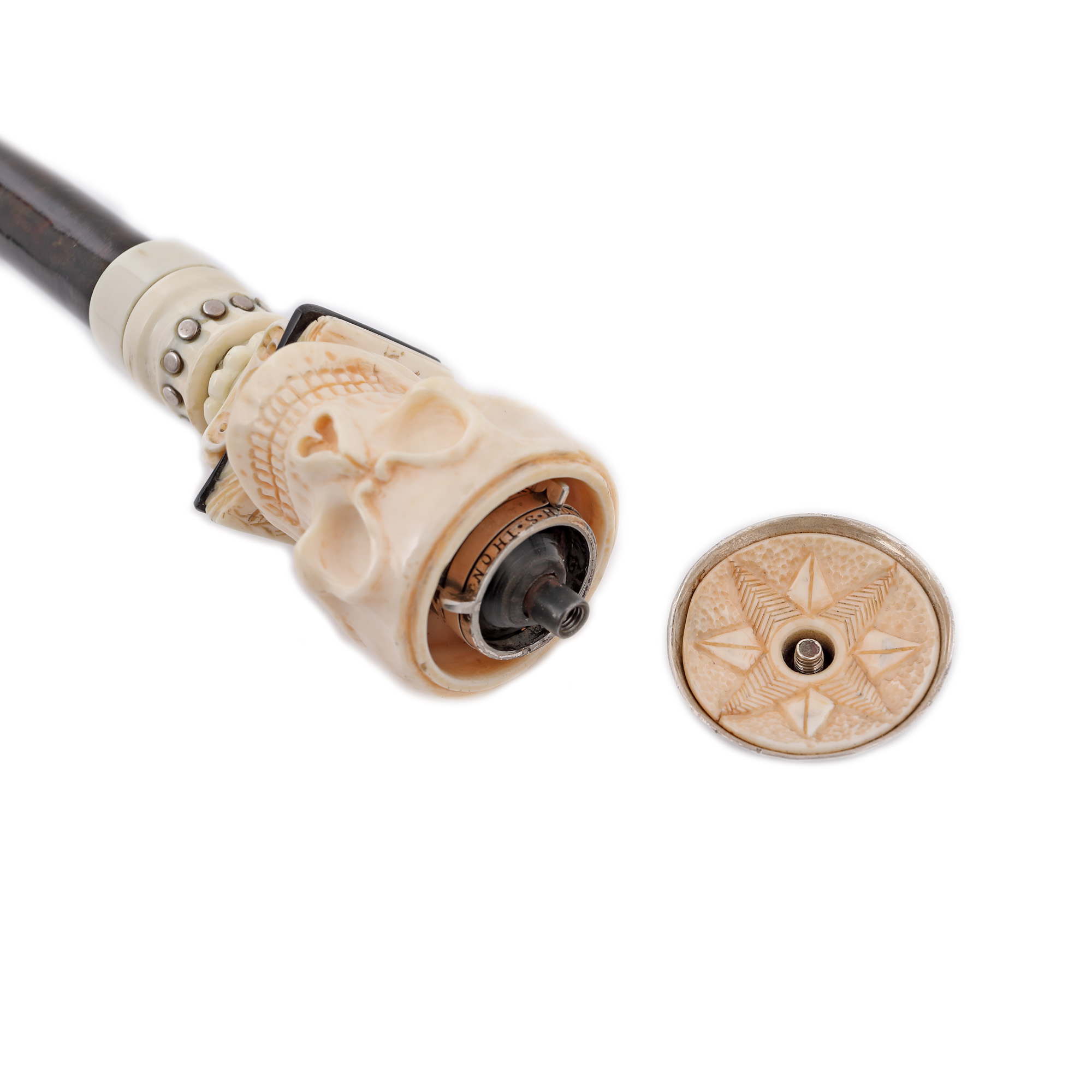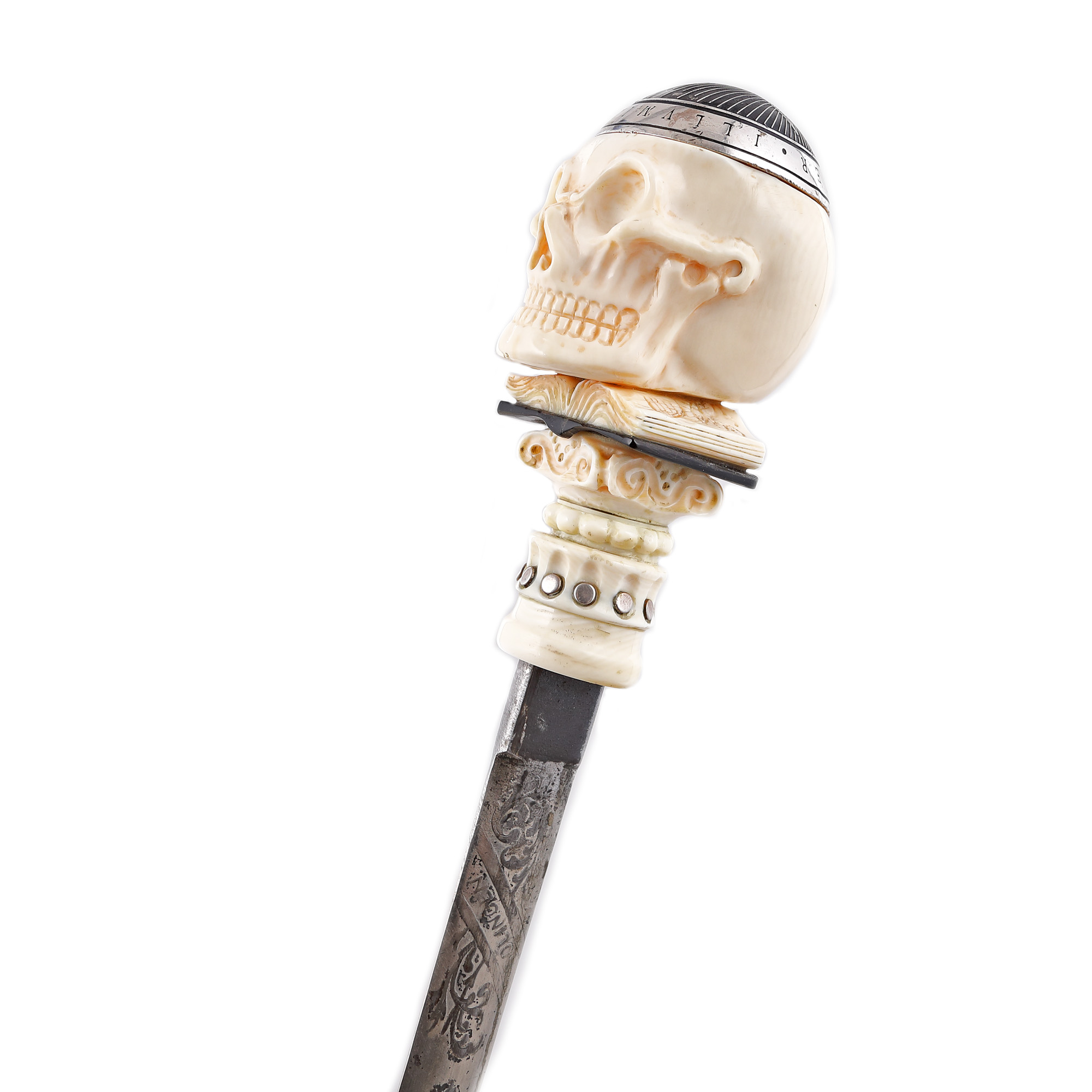 76. Rar baston masonic cu stilet, cu mâner din fildeș reprezentând un craniu decorat cu inscripții masonice care conține în interior un cifru pentru mesaje criptate, 1721