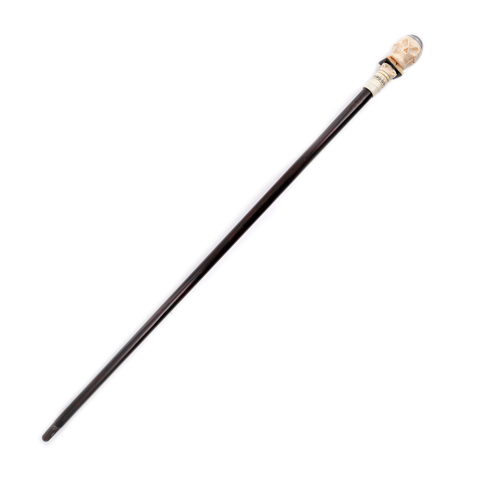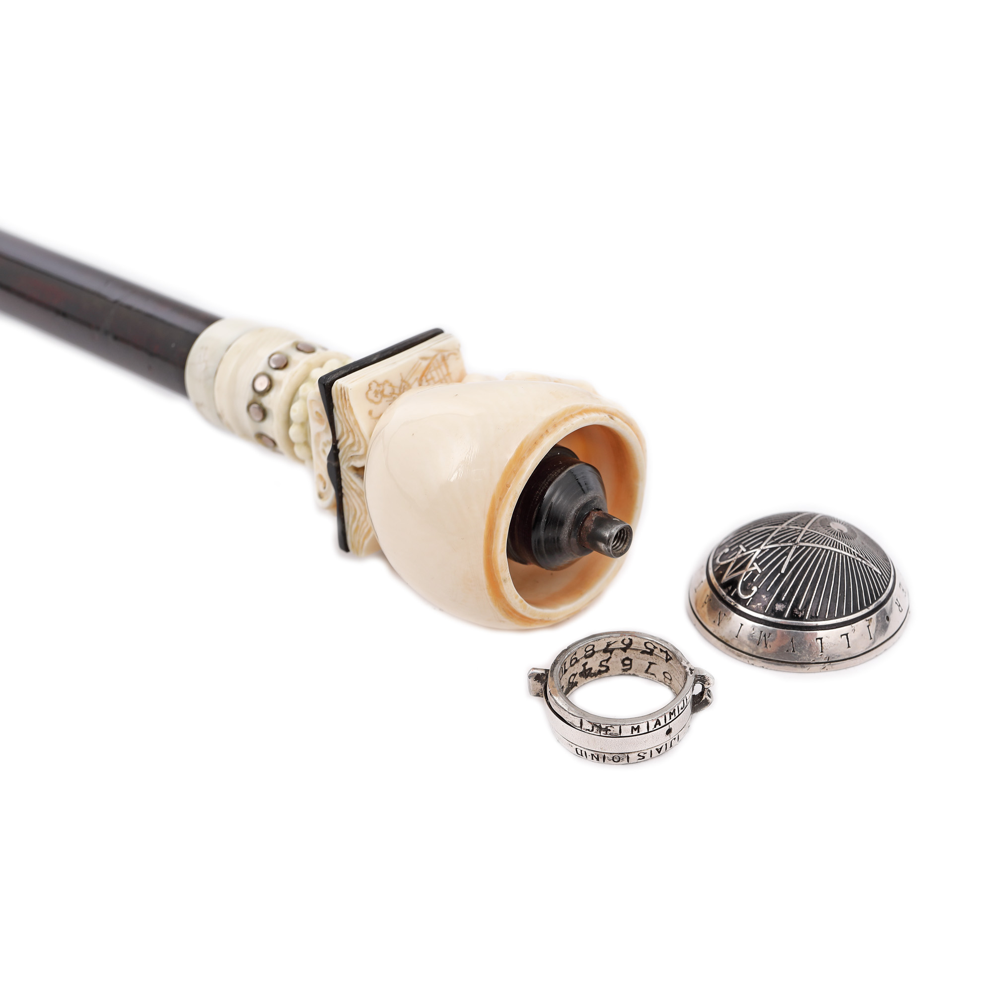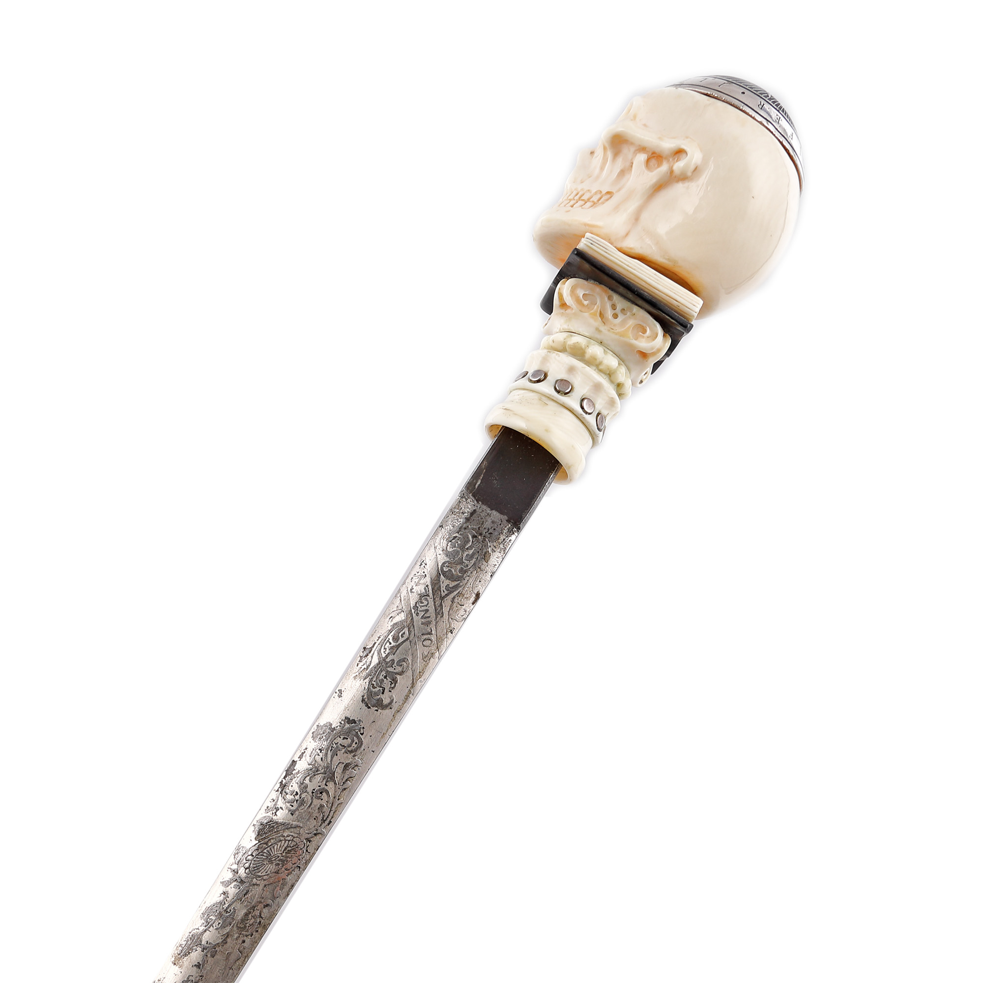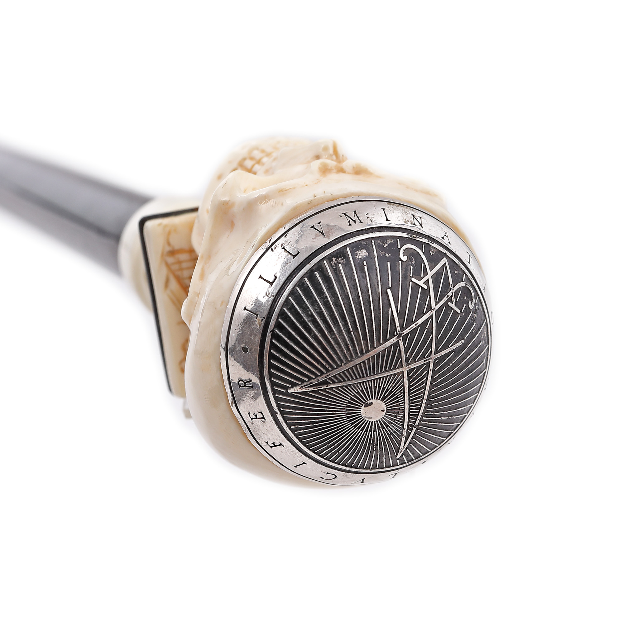76. Rar baston masonic cu stilet, cu mâner din fildeș reprezentând un craniu decorat cu inscripții masonice care conține în interior un cifru pentru mesaje criptate, 1721