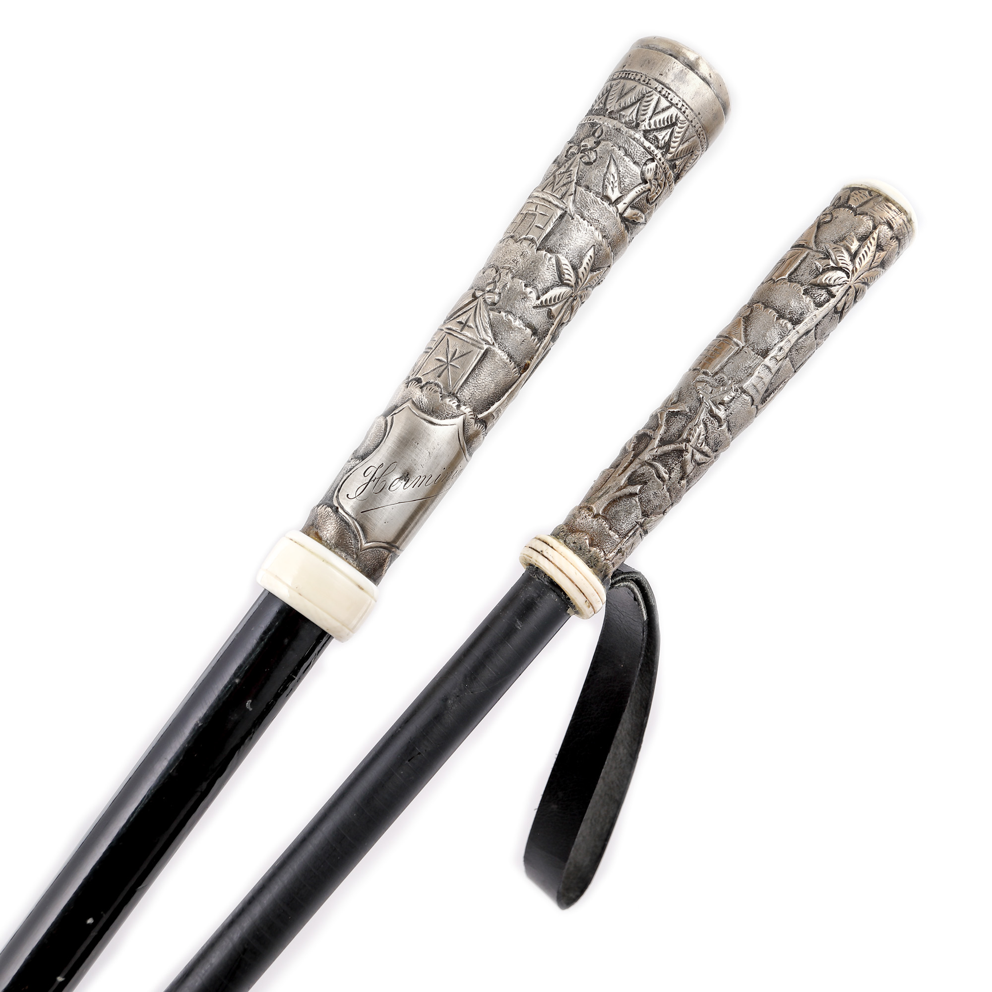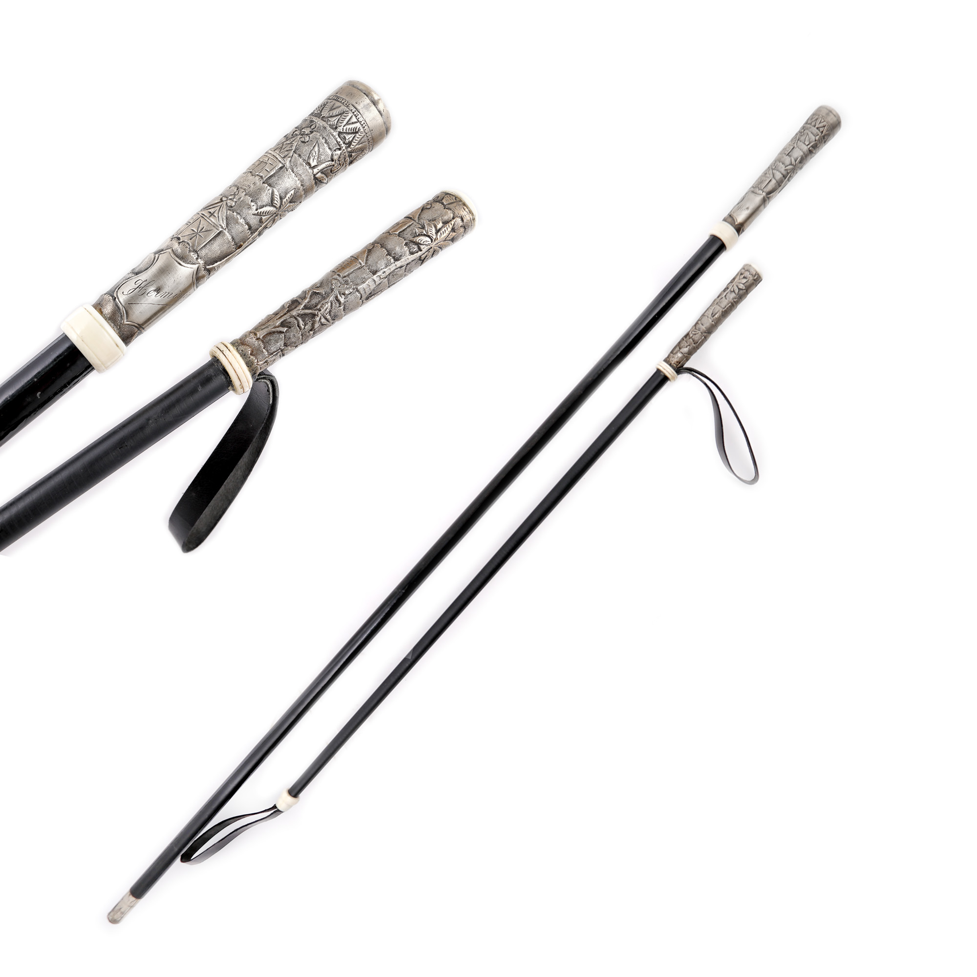 97. Set format din baston și cravaşă, decorate cu peisaje exotice, cu mâner din argint [A doua jumătate a sec. XX]